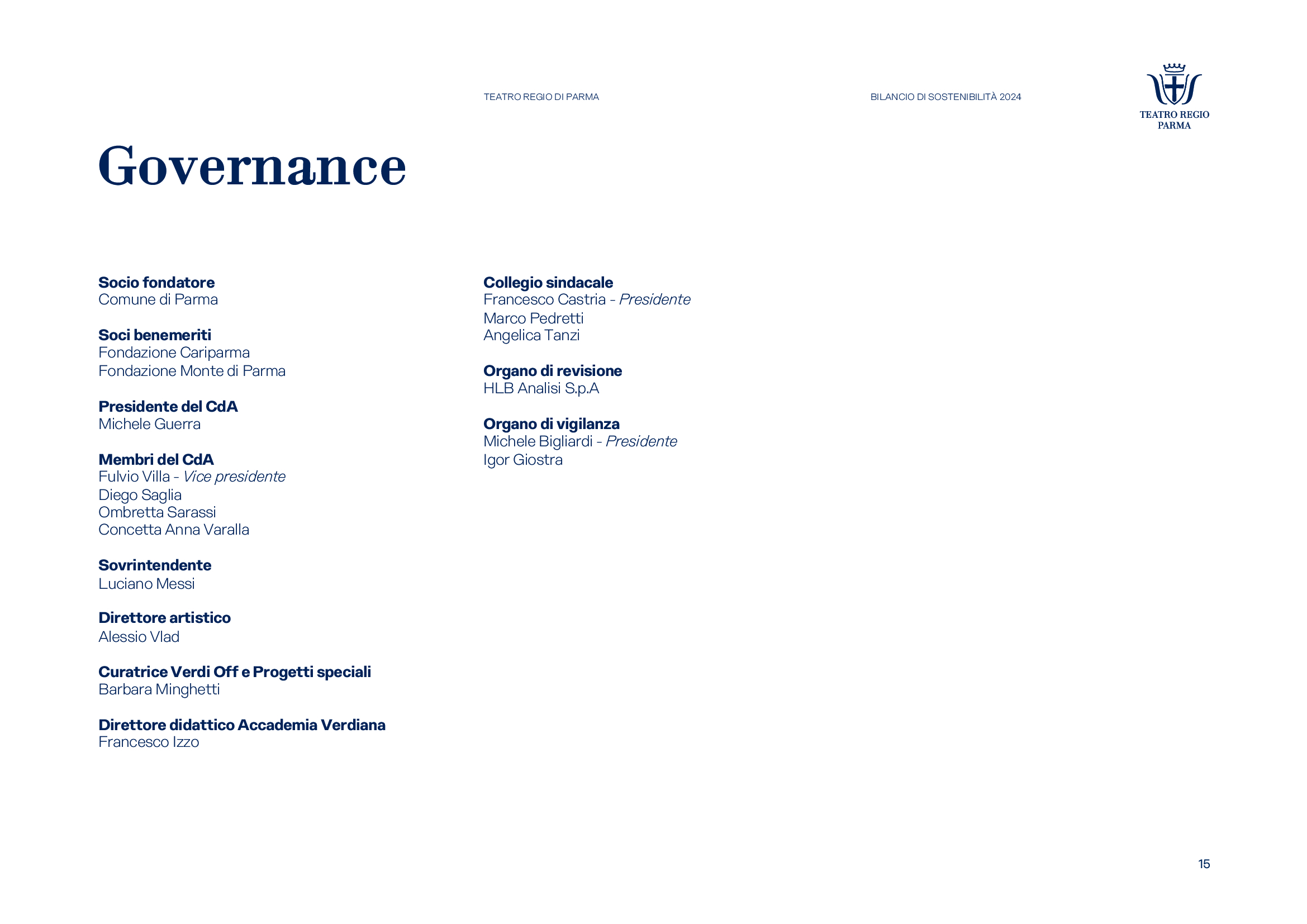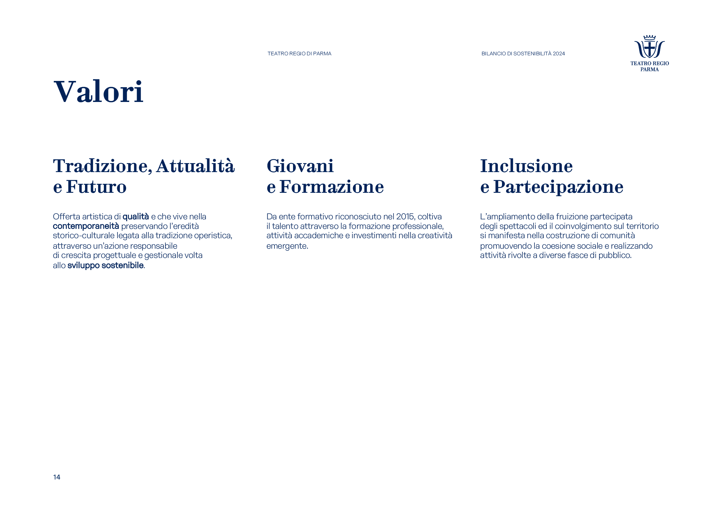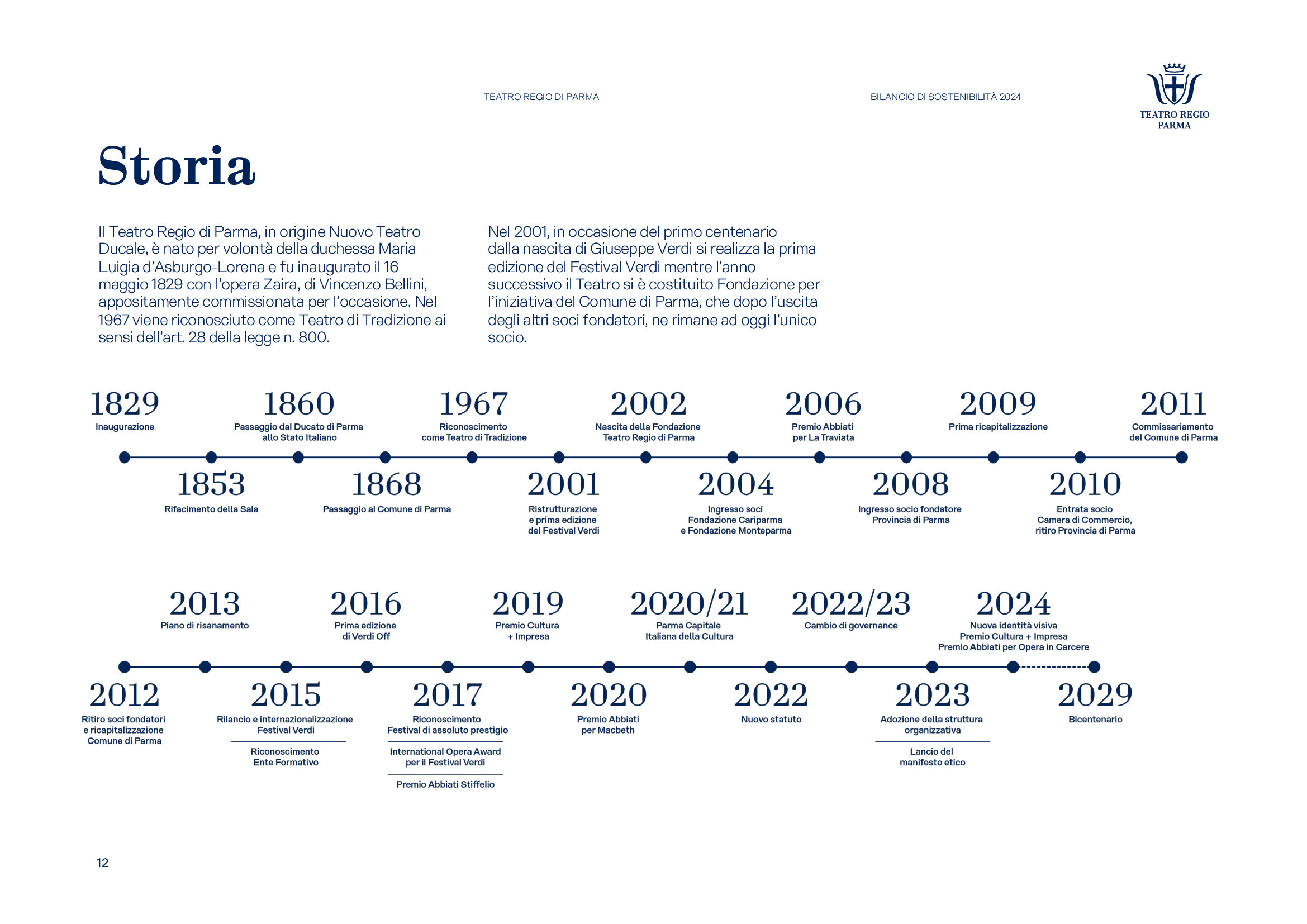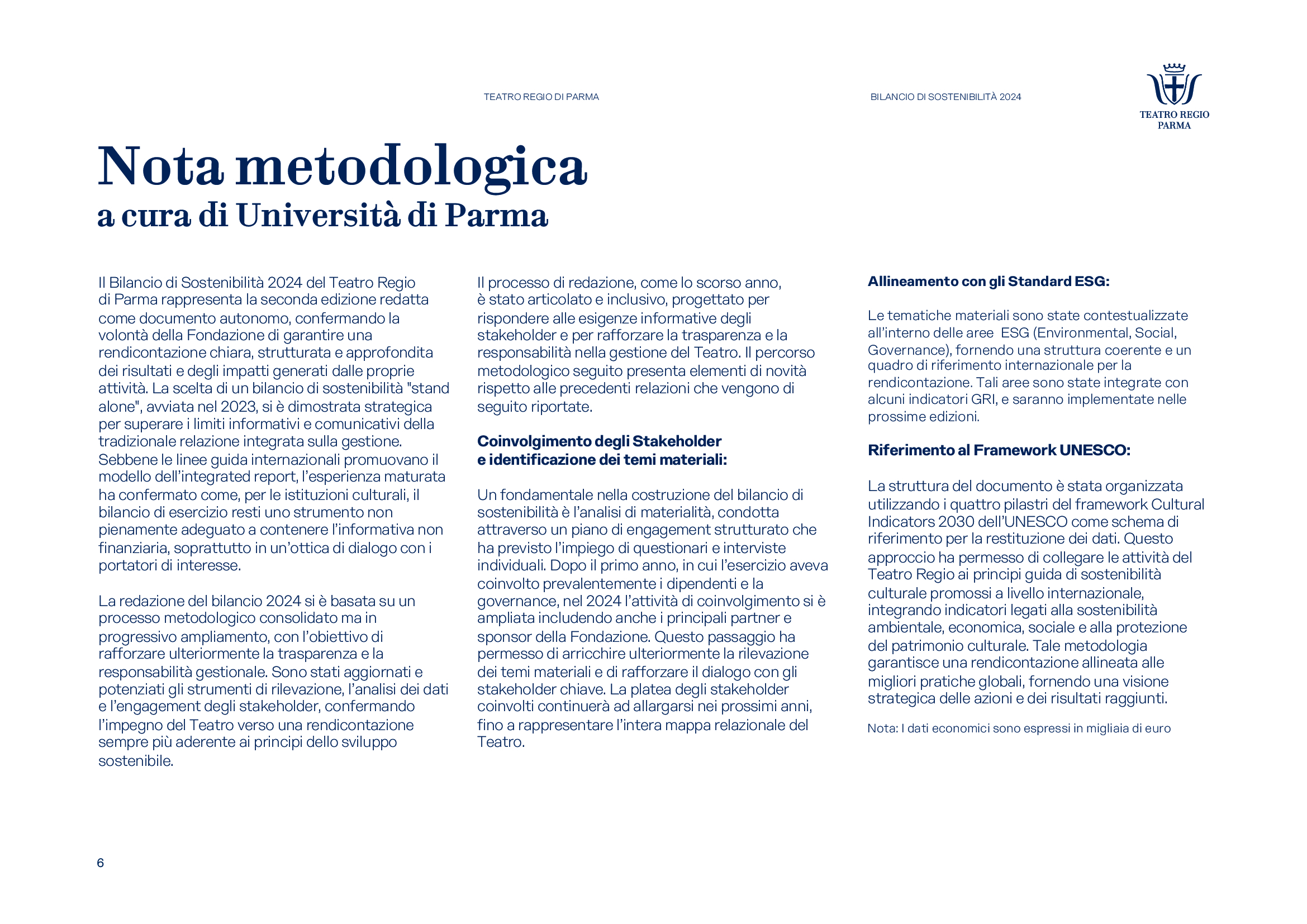 Il Bilancio di sostenibilità del Teatro Regio è lo strumento frutto di un percorso pluriennale con l’Università di Parma che coniuga rigore metodologico e responsabilità verso la comunità, restituendo in modo chiaro e comparabile la performance ESG e l’impatto culturale e sociale del Teatro, per poter assumere decisioni informate e condivise, migliorare la programmazione, rafforzando la fiducia degli stakeholder e rendendo misurabile il valore generato.