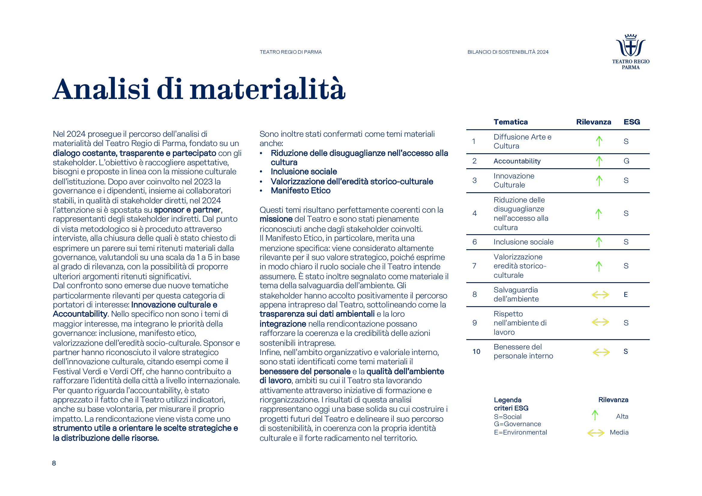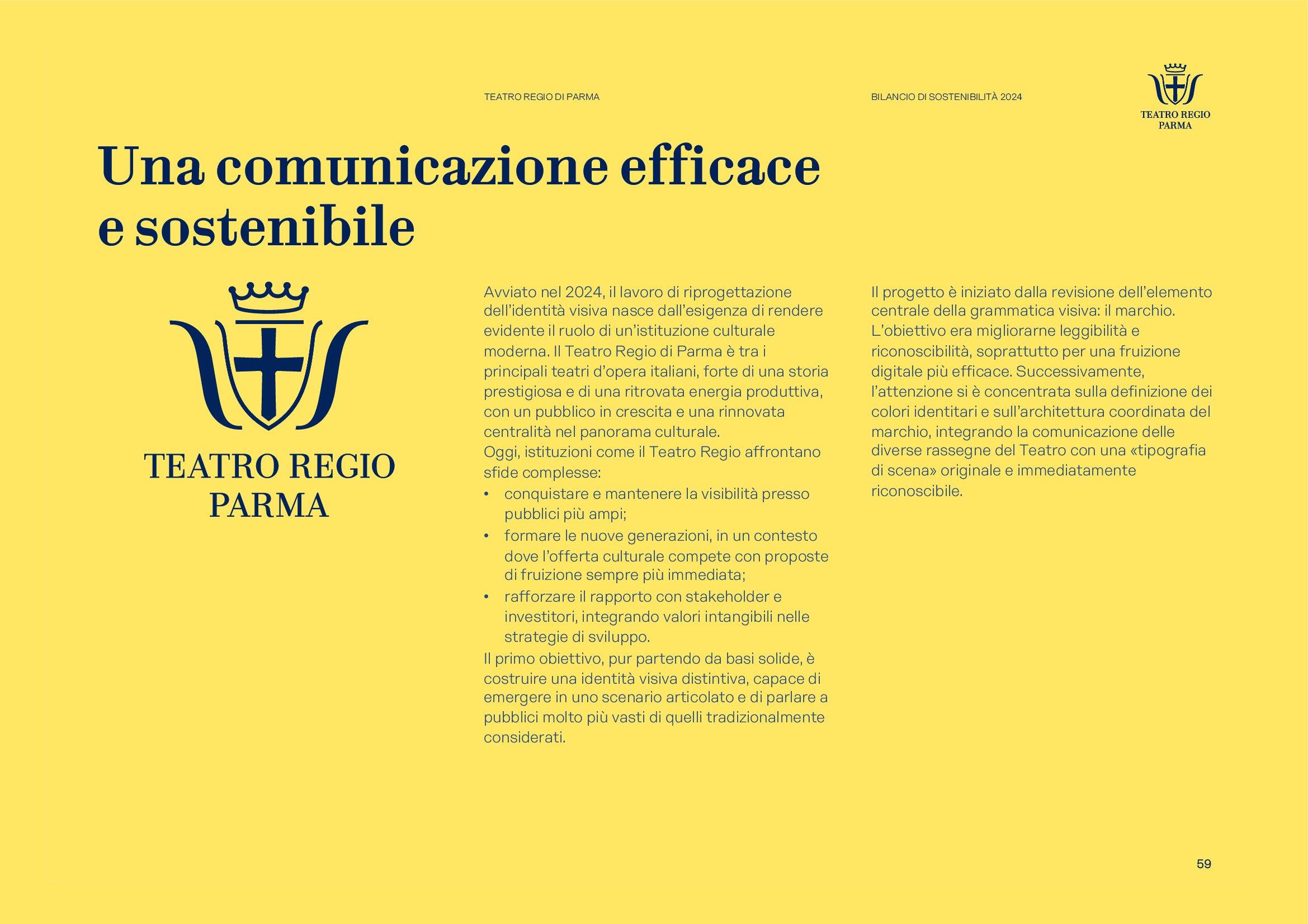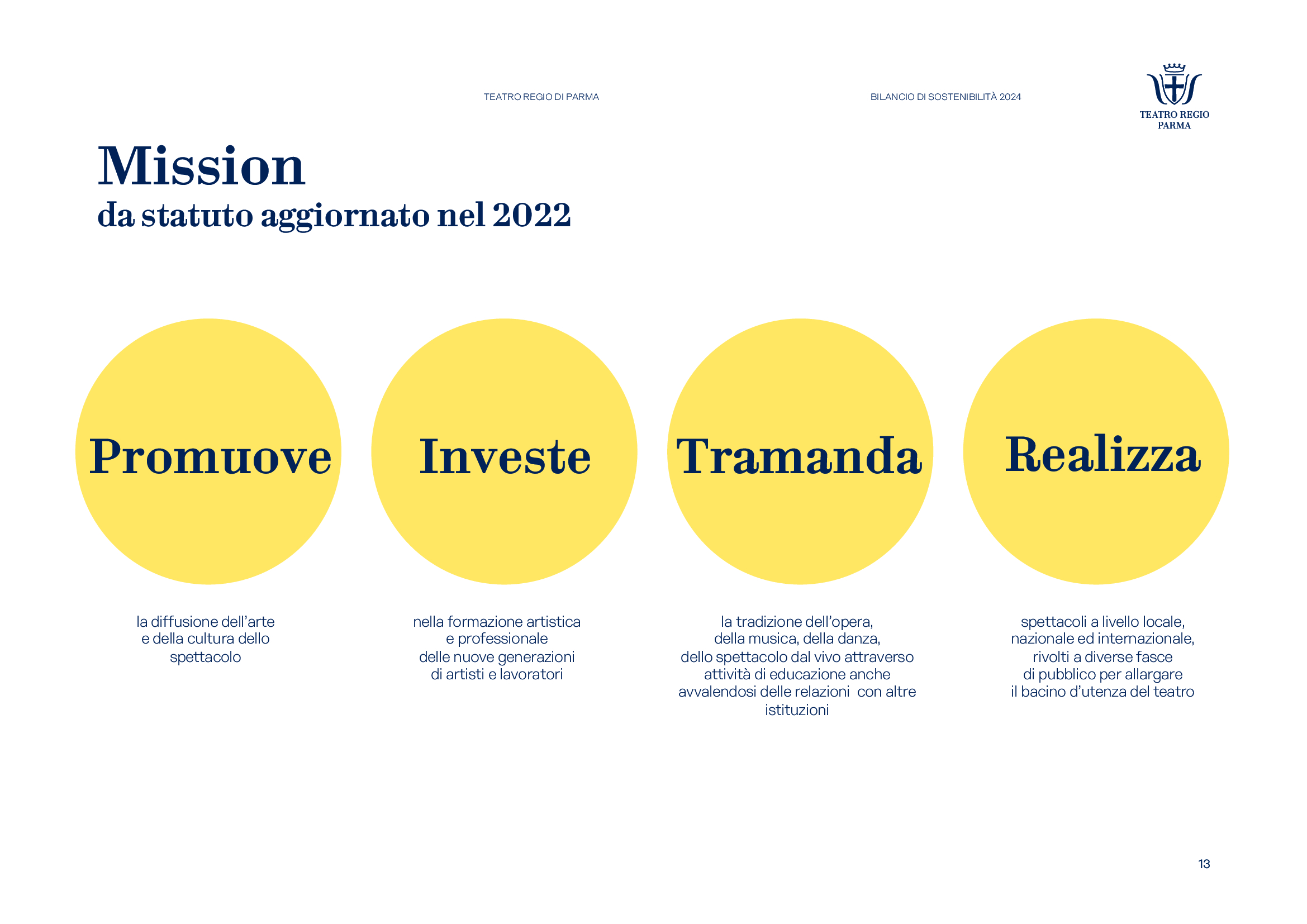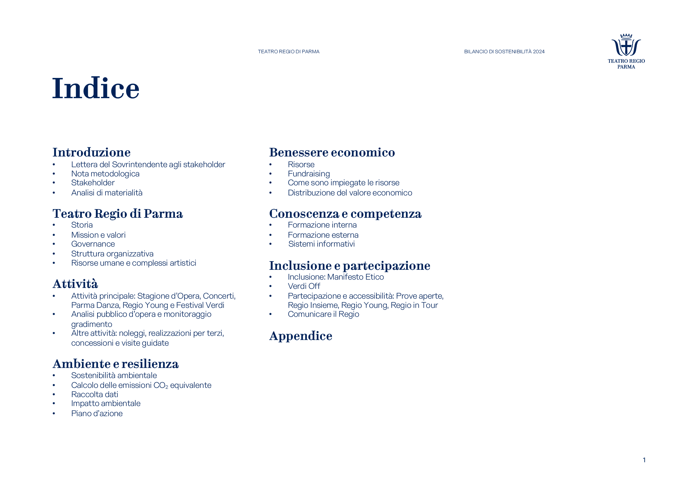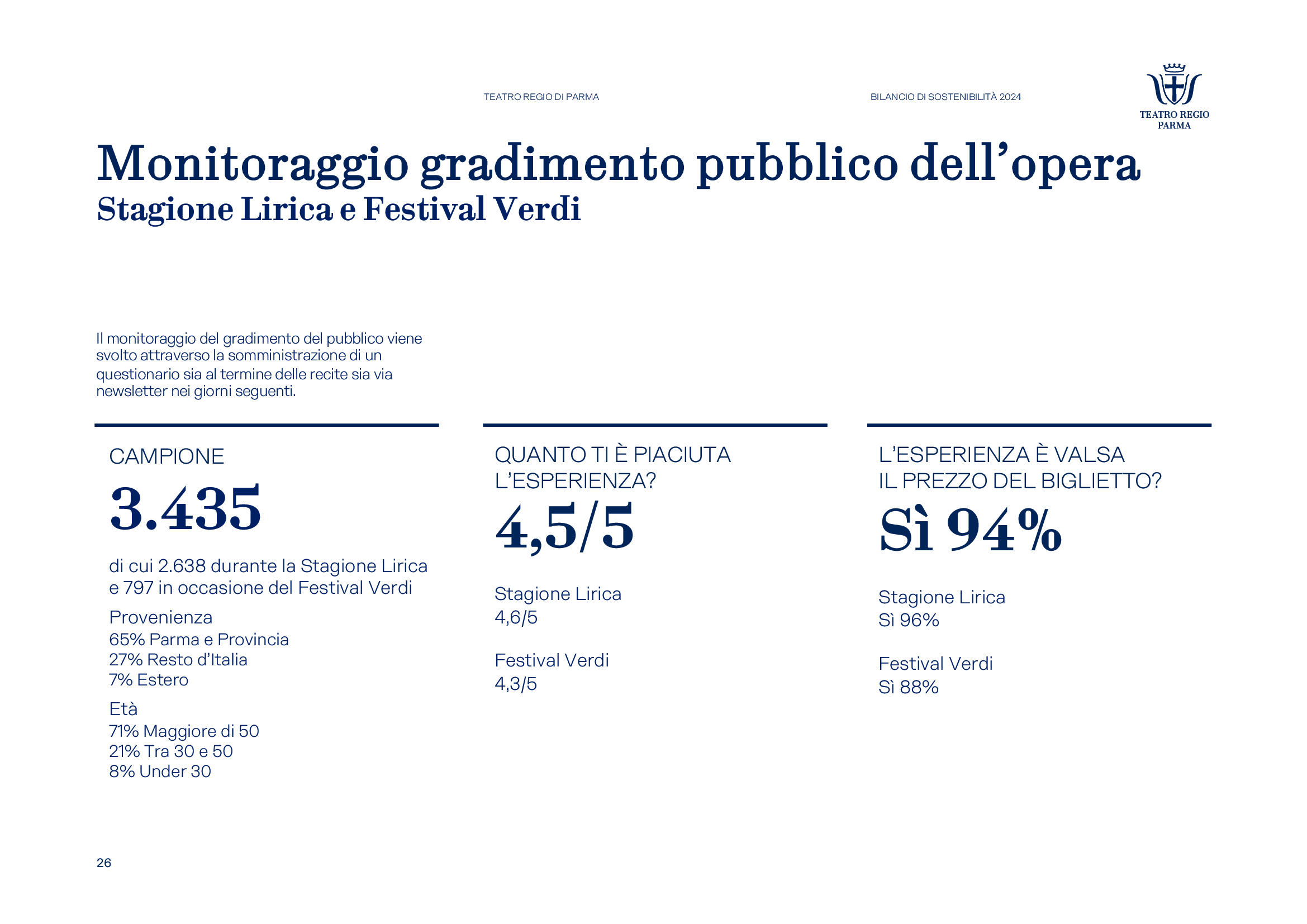 Il Bilancio di sostenibilità del Teatro Regio è lo strumento frutto di un percorso pluriennale con l’Università di Parma che coniuga rigore metodologico e responsabilità verso la comunità, restituendo in modo chiaro e comparabile la performance ESG e l’impatto culturale e sociale del Teatro, per poter assumere decisioni informate e condivise, migliorare la programmazione, rafforzando la fiducia degli stakeholder e rendendo misurabile il valore generato.