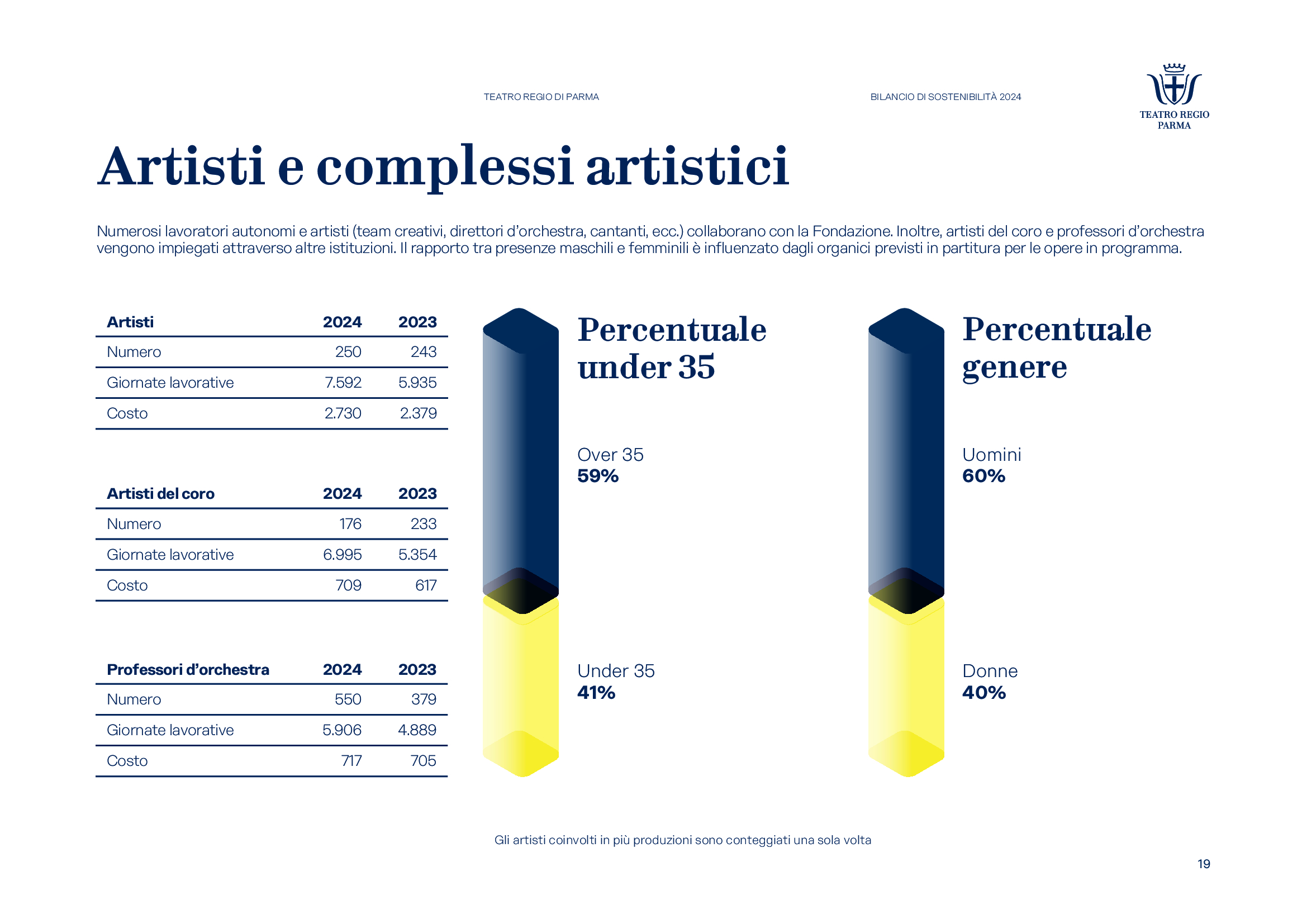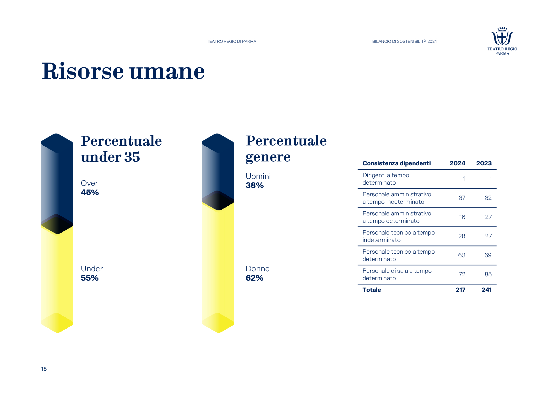 Tra le risorse umane impegnate al Teatro Regio il 62% del personale amministrativo e tecnico e il 40% degli artisti sono donne; i giovani (under 35) rappresentano rispettivamente il 55% del personale e il 41% degli artisti.