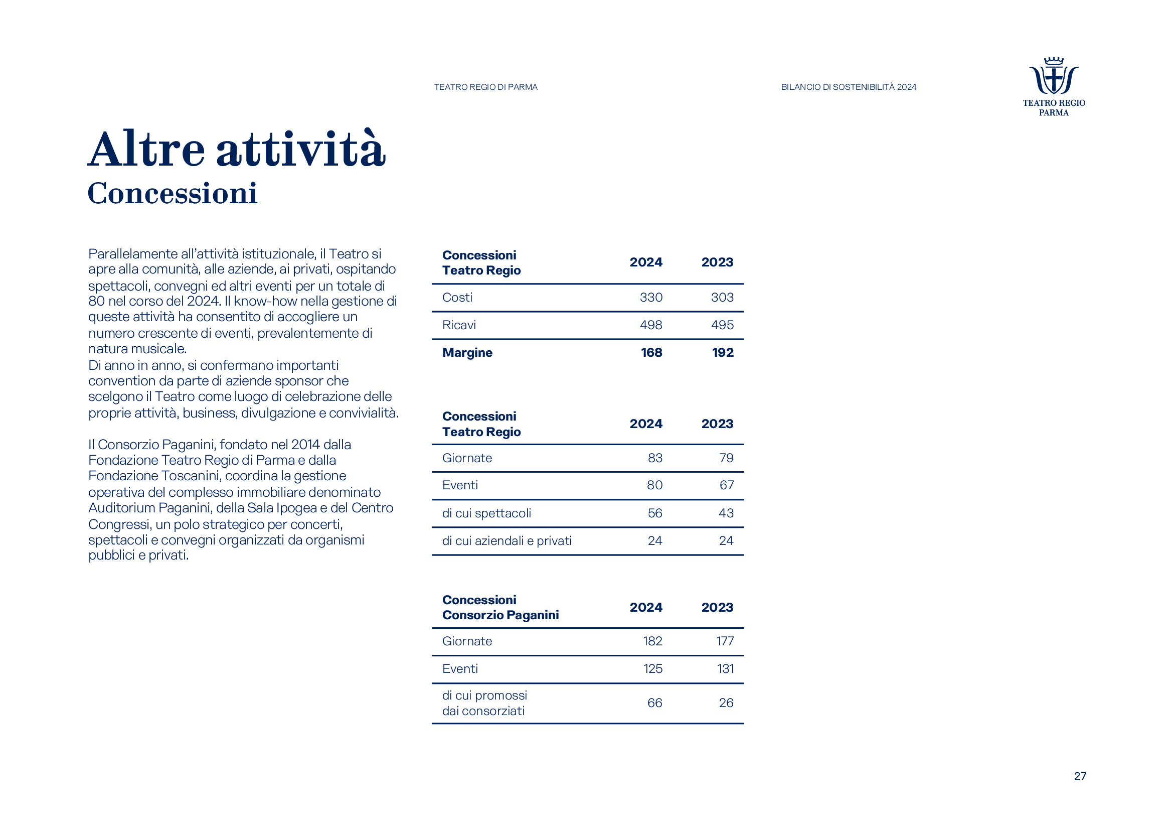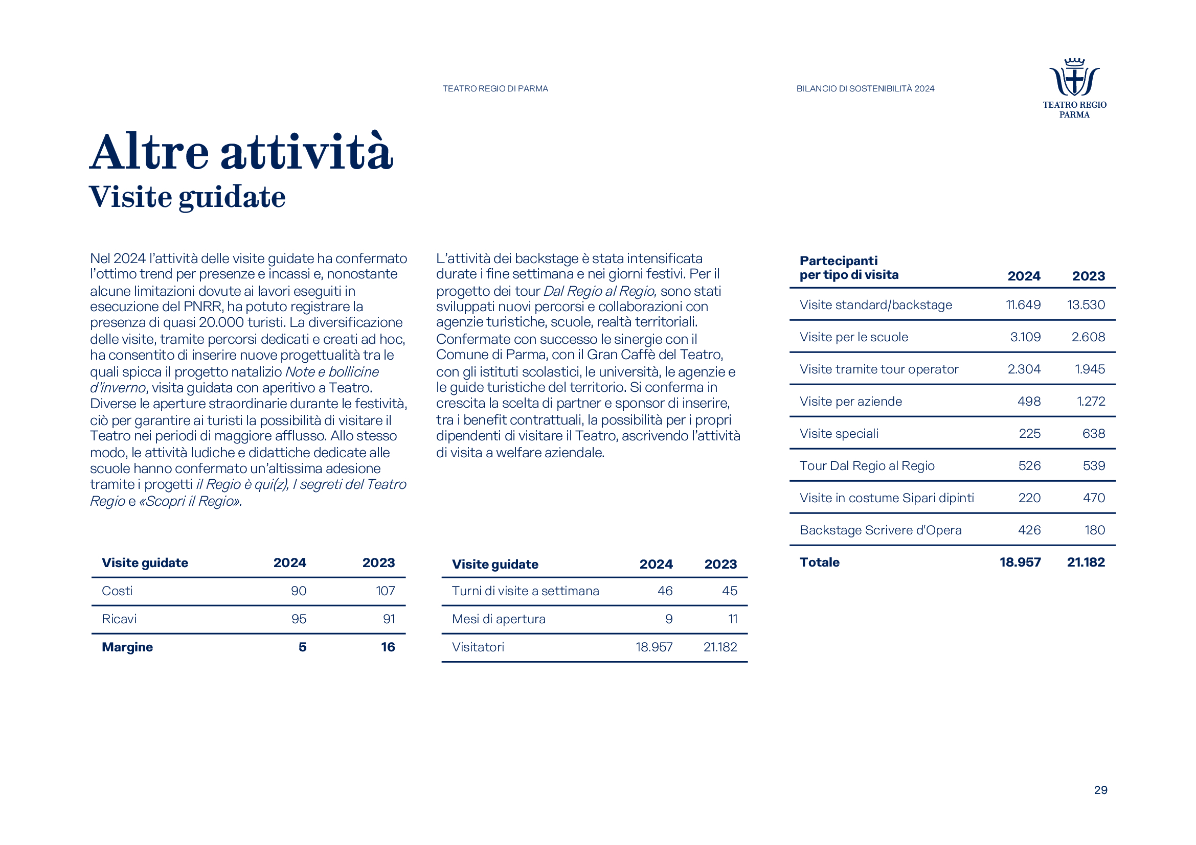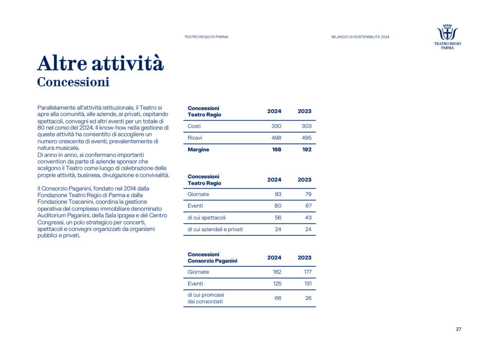 L’attività facente capo direttamente all’organizzazione della Fondazione conta 412 eventi per 79.407 presenze; a questa attività si aggiunge quella affidata in concessione a terzi per ulteriori 80 eventi. Il pubblico dell’Opera (stagione lirica di tradizione e Festival Verdi) ha espresso un livello di gradimento di 4,5/5 e nel 94% dei casi reputa che l’esperienza sia valsa il costo del biglietto. Al Regio si accede anche per le visite guidate, fruite da 18.957 visitatori. Significativa l’attività di noleggio (13), vendita (5) e coproduzione (2) di allestimenti con teatri nazionali e internazionali generando ricavi per €757.000 euro.