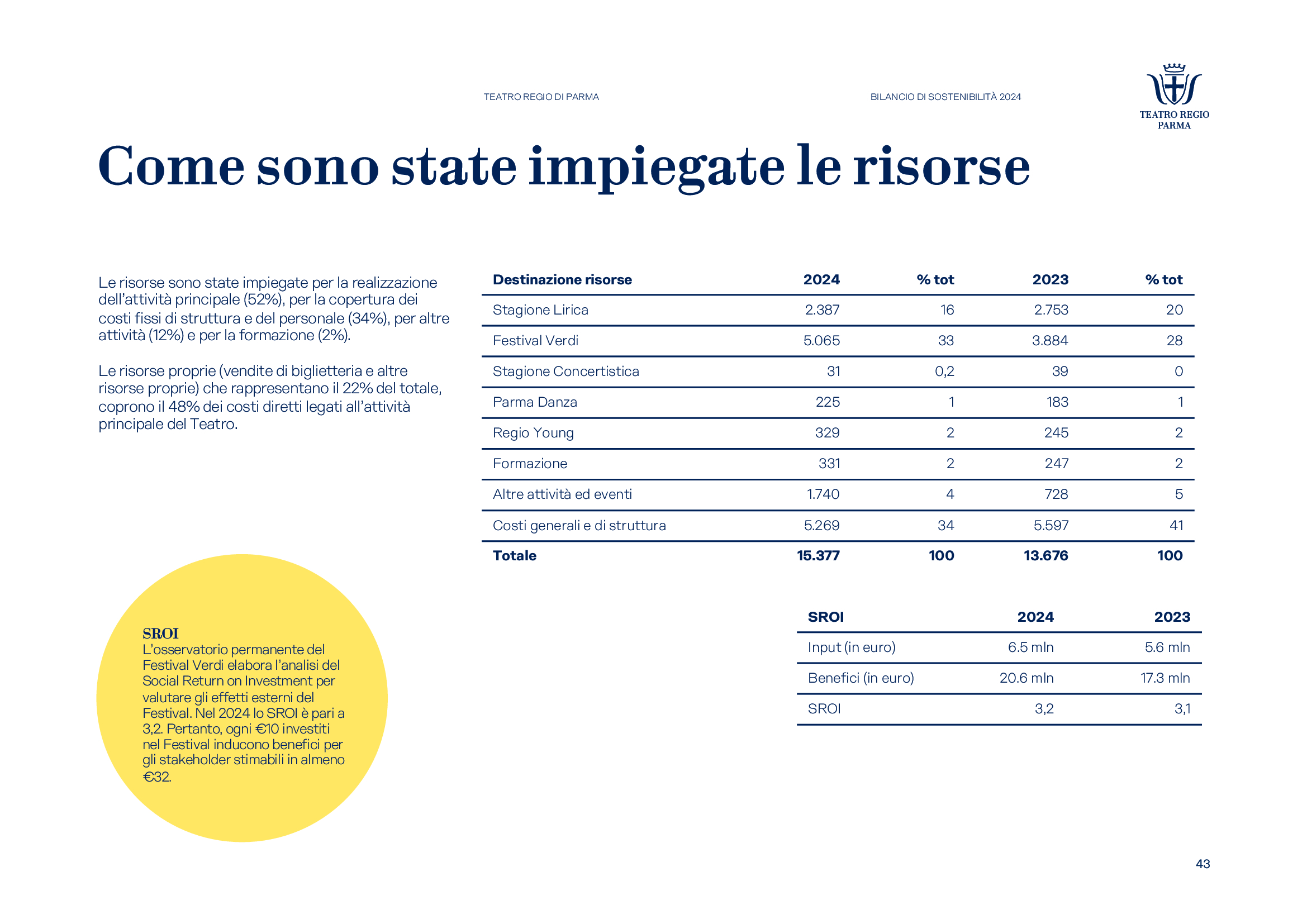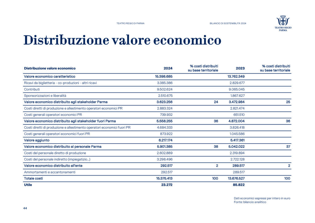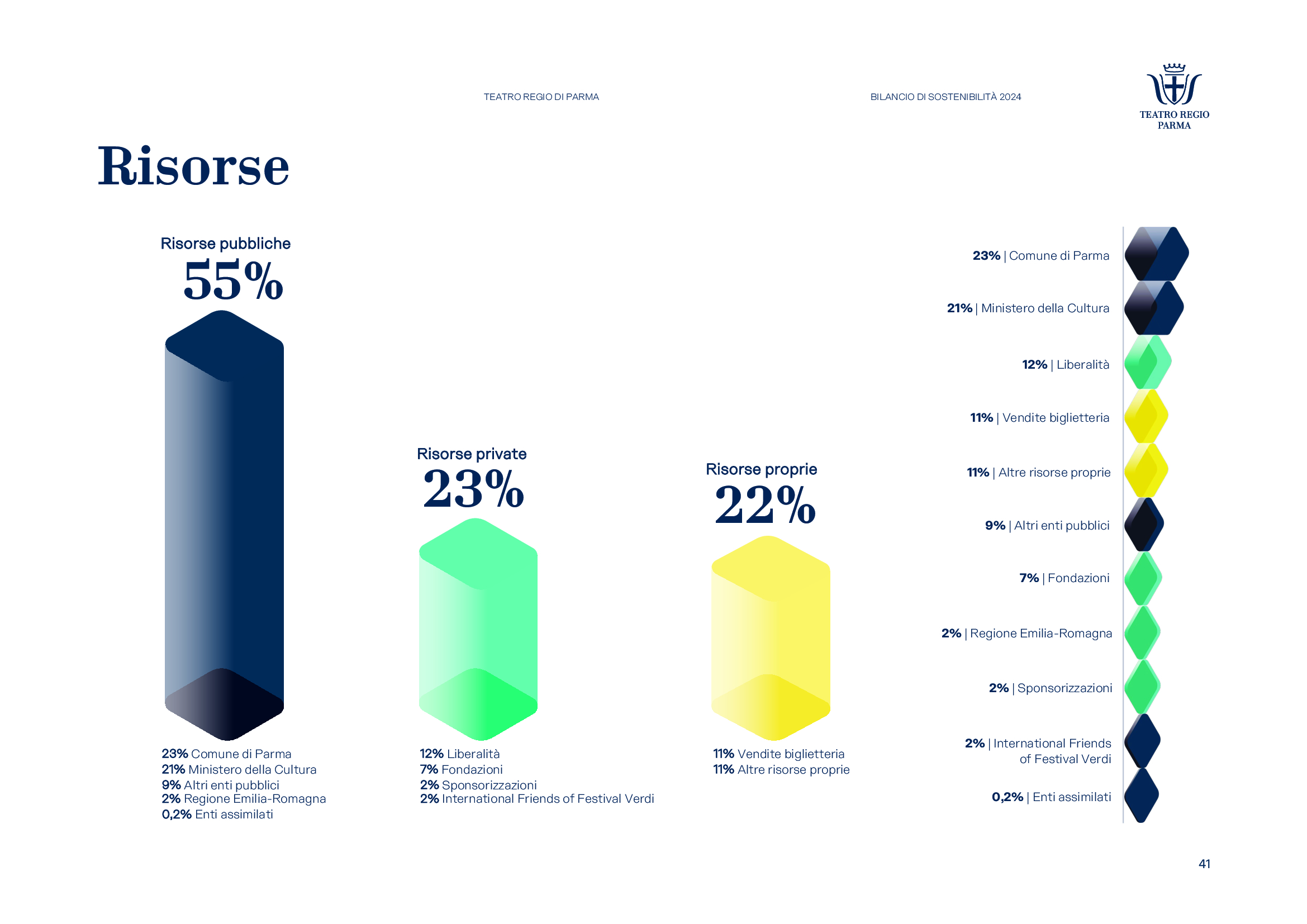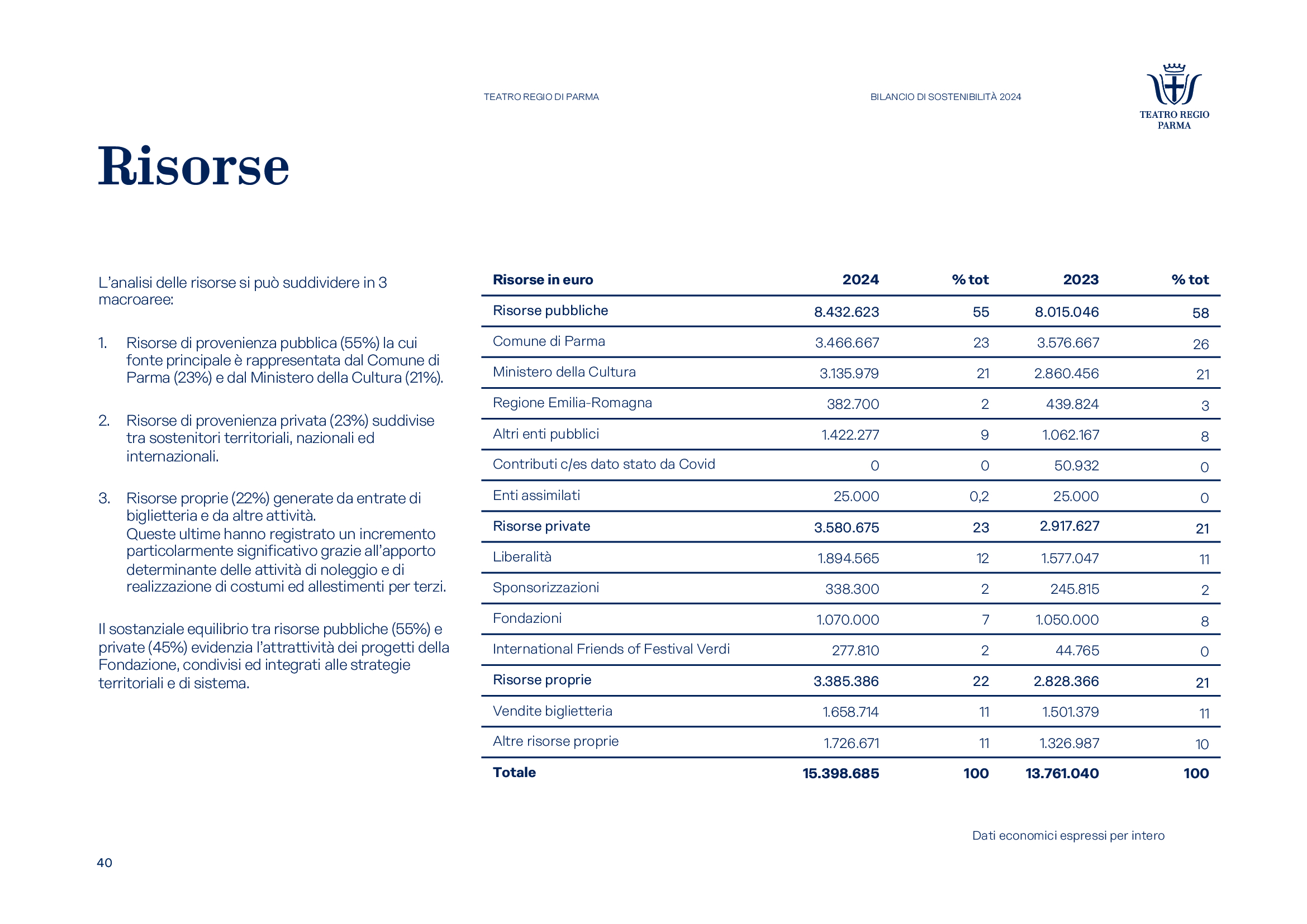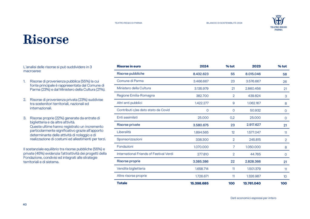 La dimensione economica pari a €15,4 MLN è composta in maniera equilibrata da 55% di risorse pubbliche (tra cui Comune di Parma 23%, Ministero della Cultura 21%) e da 45% di risorse private e proprie (tra cui 12% liberalità, 11% biglietteria, 7% Fondazioni). Con riferimento particolare al Festival Verdi, l’indice SROI (Social Return On Investment) è pari a 3,2 (ogni €10 investiti hanno indotto benefici per gli stakeholder stimabili in almeno €32).