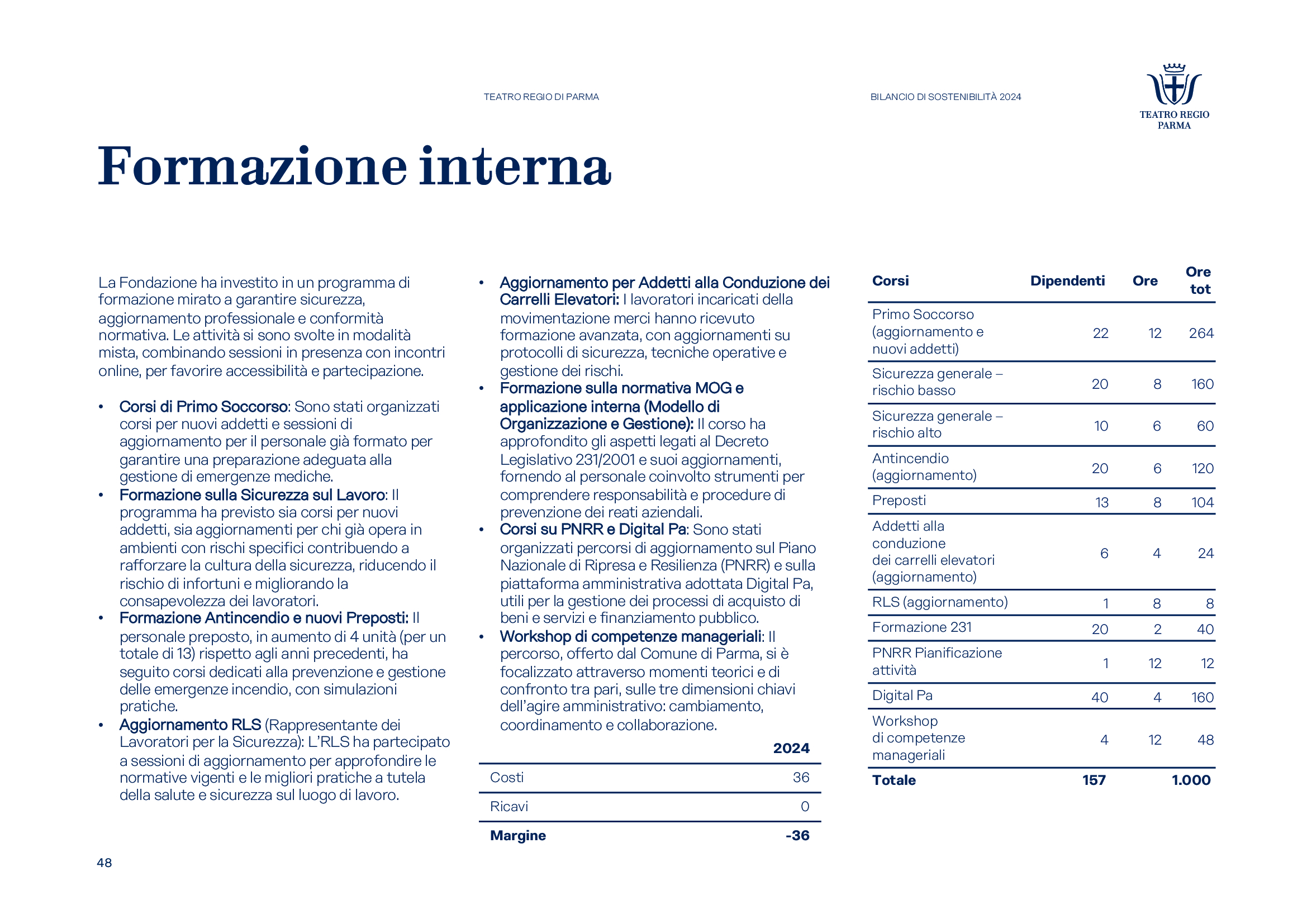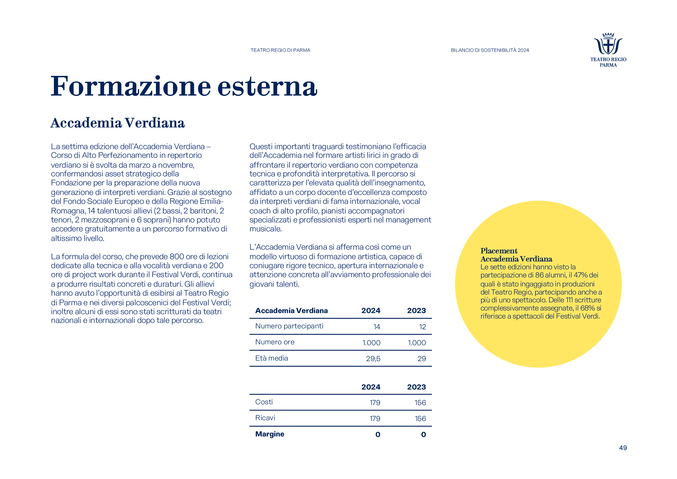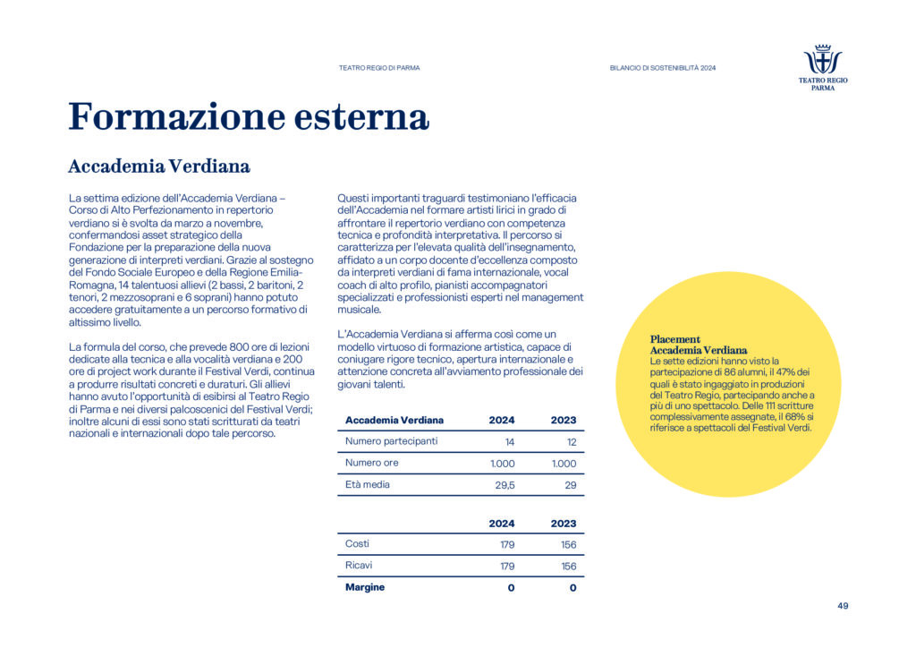 La formazione rappresenta un pilastro di sviluppo per la Fondazione sia attraverso l’Accademia Verdiana di canto lirico, che attraverso l’Accademia di Sartoria, che erogano rispettivamente 1.000 e 1.200 ore di formazione annue con un placement rispettivamente pari al 47% e 50%. L’offerta formativa si è arricchita con la Scuola di canto corale e Coro di voci bianche. Per quanto concerne la formazione interna sono state erogate 1.000 ore, con particolare riferimento alla sicurezza sui luoghi di lavoro e all’adozione del MOG 231.
