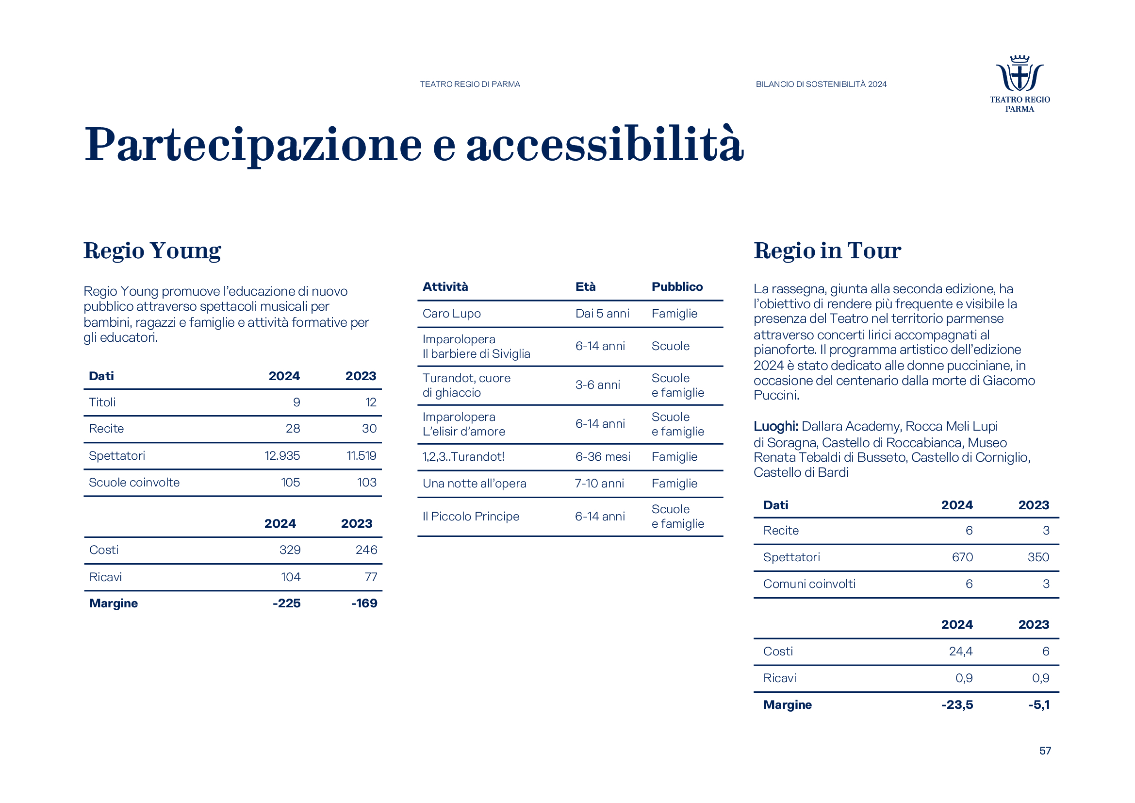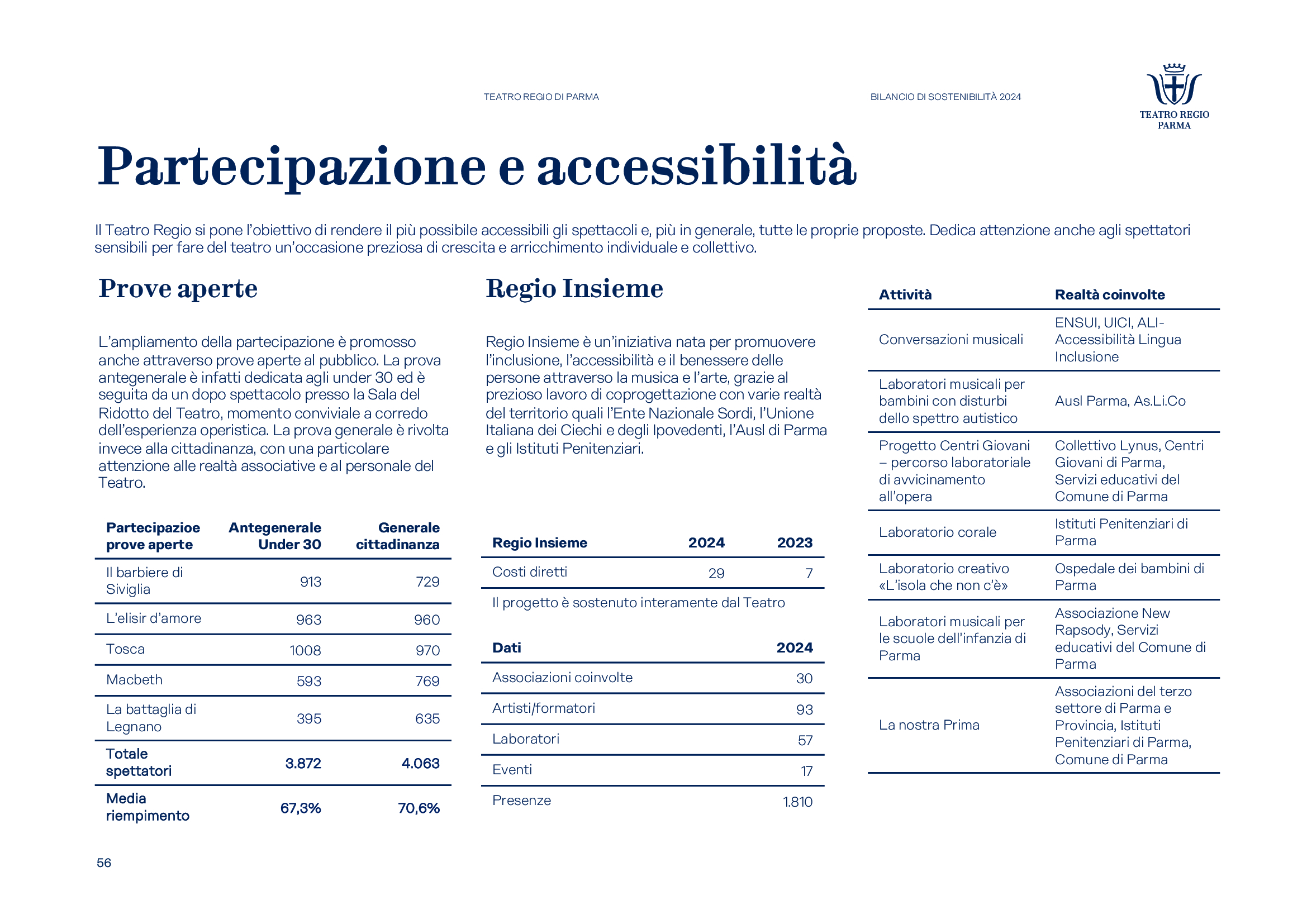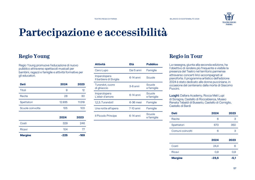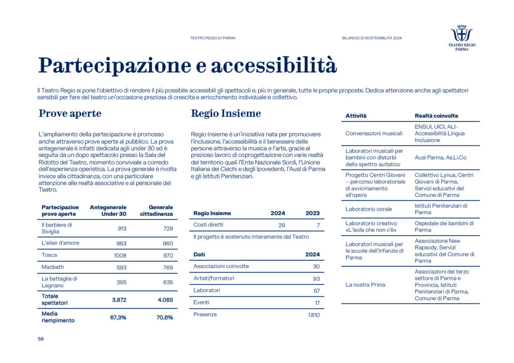 Facendo seguito all’elaborazione (nel 2023) del Manifesto Etico del Teatro Regio di Parma, le attività volte a favorire inclusione e partecipazione hanno ricevuto ulteriore impulso. Verdi Off, con oltre 324 spettacoli gratuiti, ha registrato 19.000 presenze; il cartellone di appuntamenti dedicati a bambini, ragazzi e famiglie Regio Young ha visto 12.935 spettatori, coinvolgendo 105 scuole; Regio Insieme, dedicato a promuovere il benessere delle persone attraverso la musica, ha coinvolto 1.810 partecipanti grazie a un prezioso lavoro di coprogettazione con ENS, UICI, AUSL e Istituti Penitenziari; le 5 prove aperte delle opere dedicate agli under 30 hanno coinvolto 3.872 giovani.
