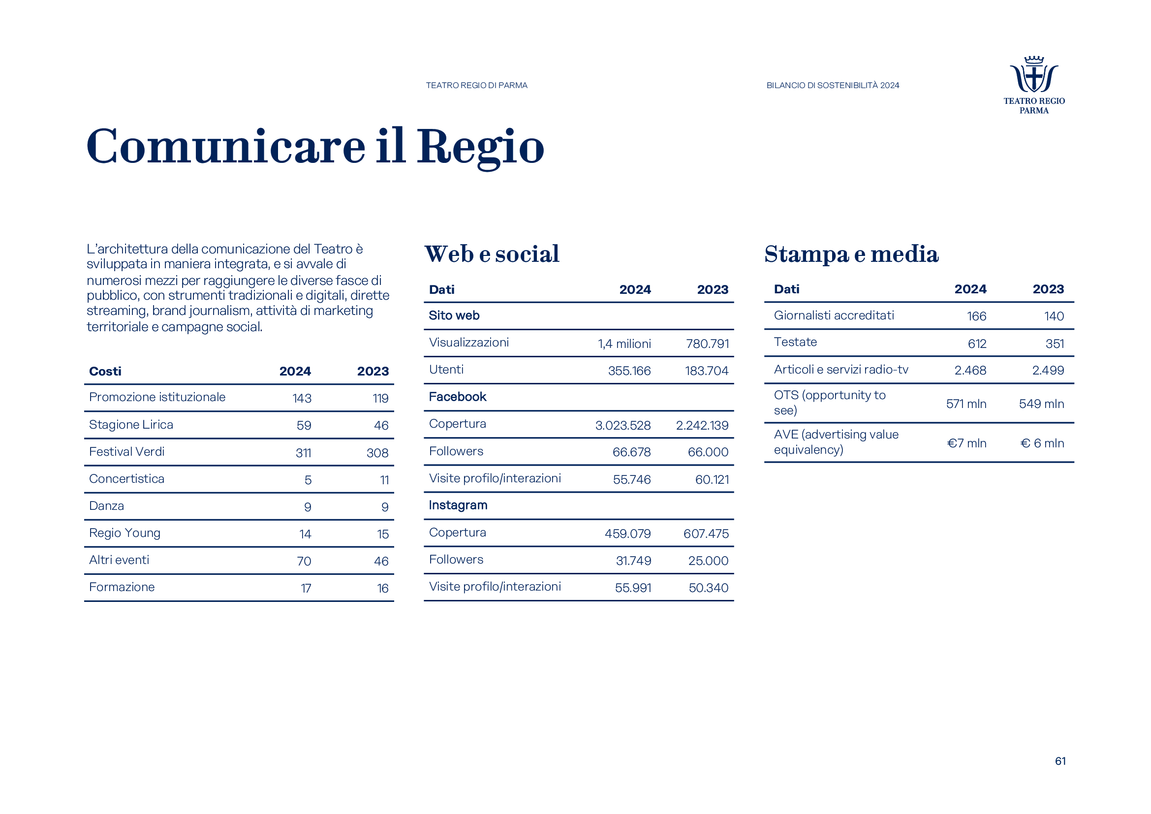 La nuova architettura della comunicazione e il rebranding del Teatro sviluppati in maniera integrata nel 2024 hanno generato un OTS (opportunity to see) di 571 MLN di persone e un AVE (advertising value equivalency) di €7 MLN.
