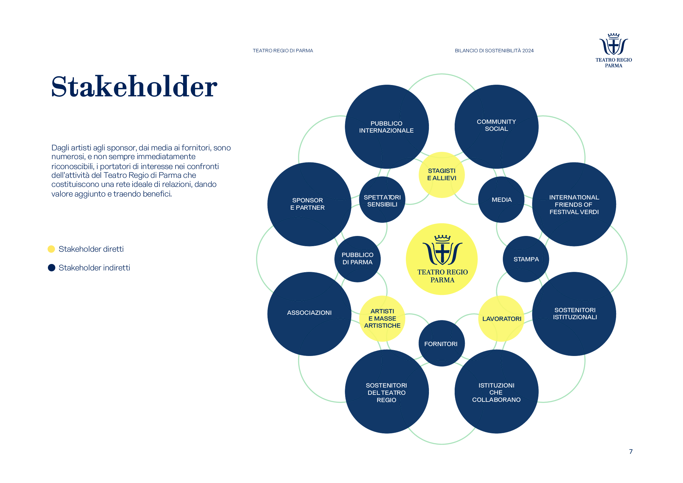 Sono numerosi i portatori di interesse nei confronti dell’attività del Teatro Regio di Parma (pubblico locale, nazionale e internazionale, spettatori sensibili, international friends of festival verdi, community social, fornitori, media e stampa, sponsor e partner, associazioni, sostenitori istituzionali) che costituiscono una rete ideale di relazioni, dando valore aggiunto e traendo benefici.