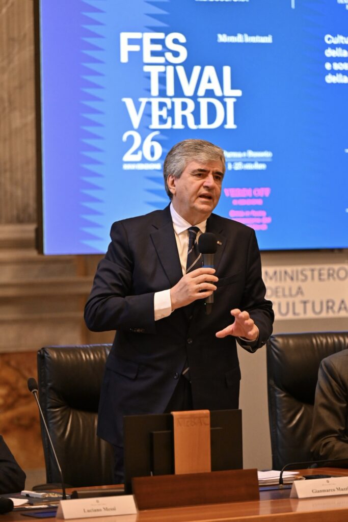 Alla conferenza stampa di presentazione del 26° Festival Verdi e del Bilancio di Sostenibilità 2024 del Teatro Regio di Parma, trasmessa in diretta in live streaming sul canale YouTube del Ministero della Cultura e disponibile a a questo link, dopo l’introduzione dell’On. Gianmarco Mazzi, sono seguiti i video saluti di Michele Guerra, Sindaco di Parma e Presidente della Fondazione Teatro Regio di Parma; Gessica Allegni, Assessora a Cultura e Pari opportunità della Regione Emilia-Romagna; Stefano Nevicati, Sindaco di Busseto e gli interventi di Luciano Messi, Sovrintendente; Alessio Vlad, Direttore artistico; Barbara Minghetti, Curatrice di Verdi Off, Isabella Mozzoni, Professoressa di Economia e Organizzazione delle Aziende Culturali presso l’Università di Parma.