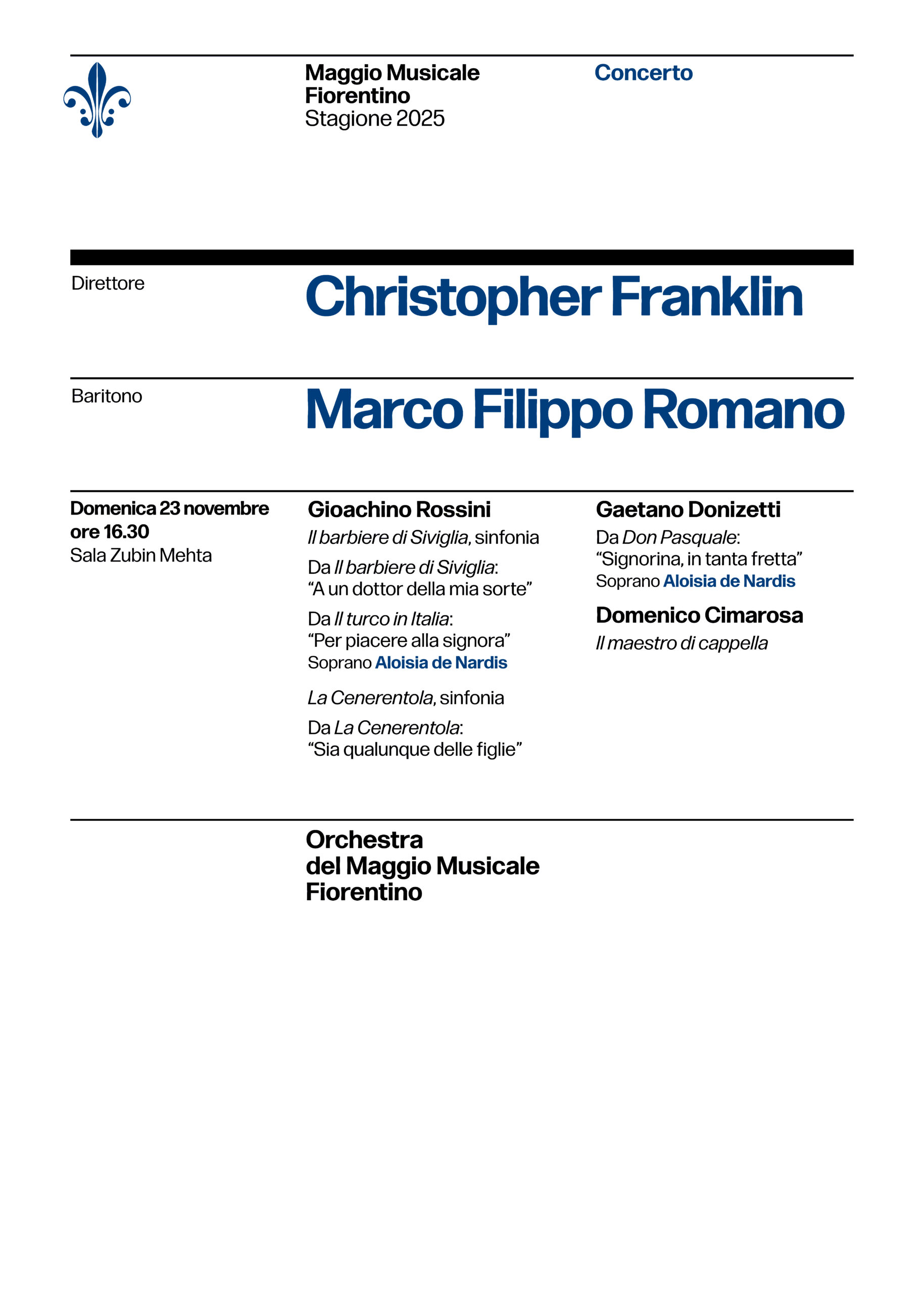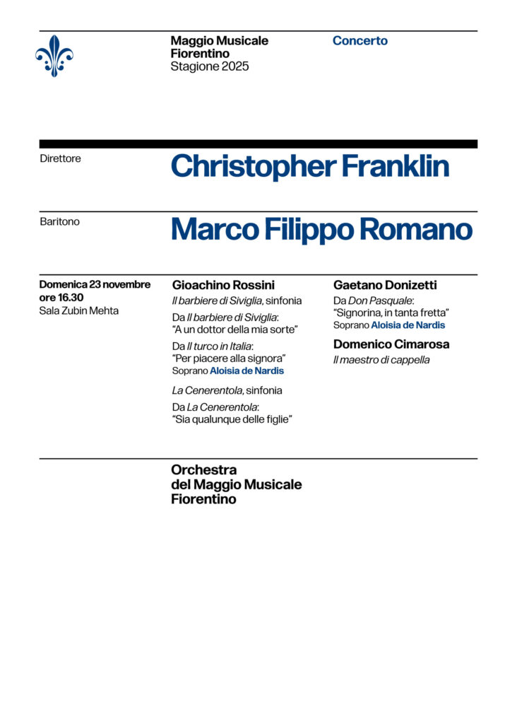 Firenze, 20 novembre 2025 – Continuano gli appuntamenti sinfonici autunnali al Teatro del Maggio Musicale Fiorentino. Domenica 23 novembre 2025 alle ore 16.30 il maestro Christopher Franklin – di nuovo alla guida dell’Orchestra del Maggio dopo il concerto tenuto al Teatro Romano di Fiesole nel luglio del 2008 – e Marco Filippo Romano tornano nella Sala Mehta del Teatro per un recital di canto all’insegna delle musiche di Gioachino Rossini, Gaetano Donizetti e Domenico Cimarosa.