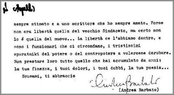 Nel novembre del 1970 il giornalista della Rai Andrea Barbato scriveva una lettera “strettamente personale” allo scrittore Antonio Barolini, in riferimento allo scontro politico – culturale che si era innescato tra destra e sinistra in relazione alla lacerazione avvenuta in seno al Sindacato Nazionale Scrittori (da questa lacerazione nacque il Sindacato Libero Scrittori), nella quale, tra l’altro, si dice: “… mi domando in che modo sia potuto accadere che il tuo nome sia diventato la bandiera di questo nuovo gruppo che – permettimi di dirlo – non avrebbe neppure il diritto di fregiarsi dell’aiuto di uno scrittore come te. (…) Davvero pensi (…) che esiste un attacco a tutti i centri intellettuali del paese? Davvero vuoi mescolarti con… pazienza, non scriverò quei nomi”.