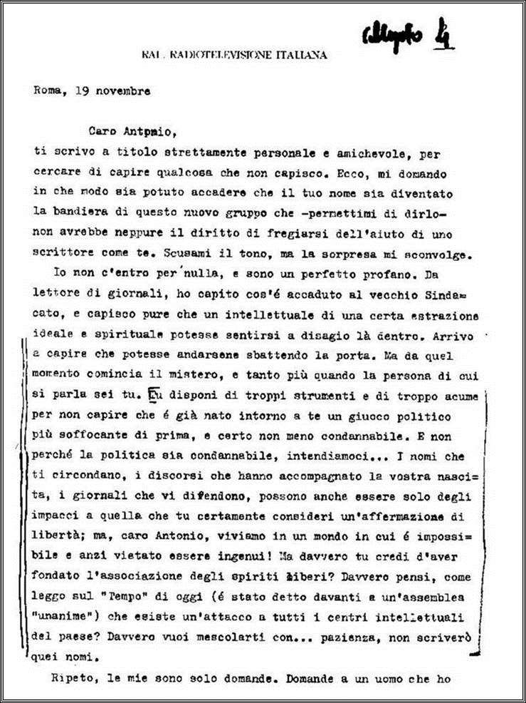 Il carteggio, comunque, è composto da lettere inedite (e di altri documenti cartacei) del giornalista Andrea Barbato, che lavorava alla Rai, che attacca la cultura di destra e gli intellettuali di destra, dello scrittore cattolico Mario Pomilio che si allontana dalla «sinistra» ma non accetta le visioni culturali della destra di quegli anni, dello scrittore e commediografo Diego Fabbri che contesta le scelte della destra in riferimento alla presenza del Sindacato ad un Convegno indetto dal Msi, di Libero Bigiaretti che difende, da sinistra, la strategia del Sindacato Nazionale degli scrittori, di Antonio Barolini che fonda, insieme a Francesco Grisi e ad altri intellettuali, un nuovo Sindacato sotto lo spinta di ambienti cattolici e democristiani.
