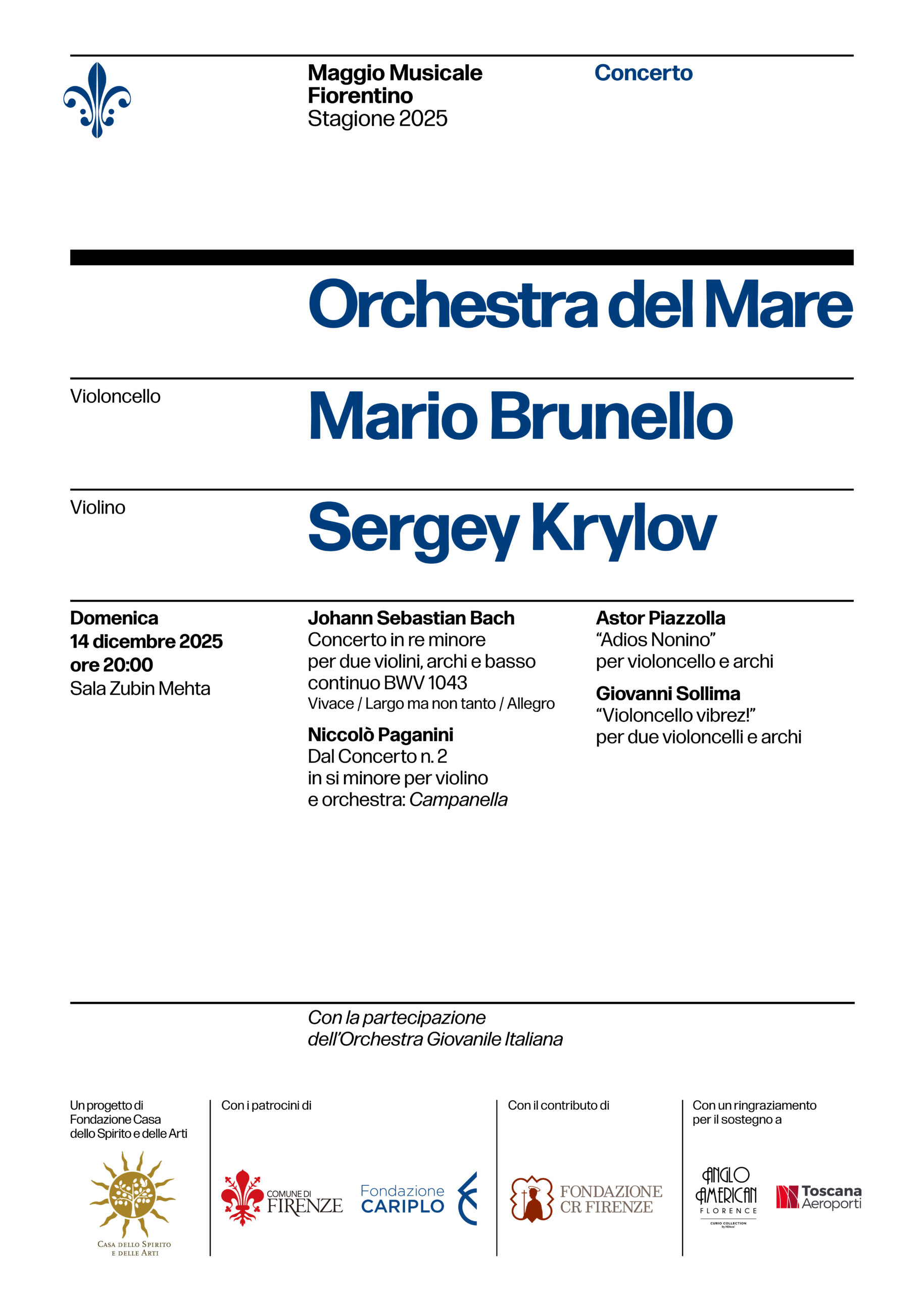 Firenze, 25 novembre 2025 – Domenica 14 dicembre 2025 alle ore 20, nella Sala Mehta del Teatro del Maggio, il concerto dell’Orchestra del Mare composta per l’occasione dal violoncellista Mario Brunello, il violinista Sergej Krylov e i musicisti dell’Orchestra Giovanile Italiana della Scuola di Musica di Fiesole. Un concerto dal grande valore sociale a favore della “Fondazione Casa dello Spirito e delle Arti”.