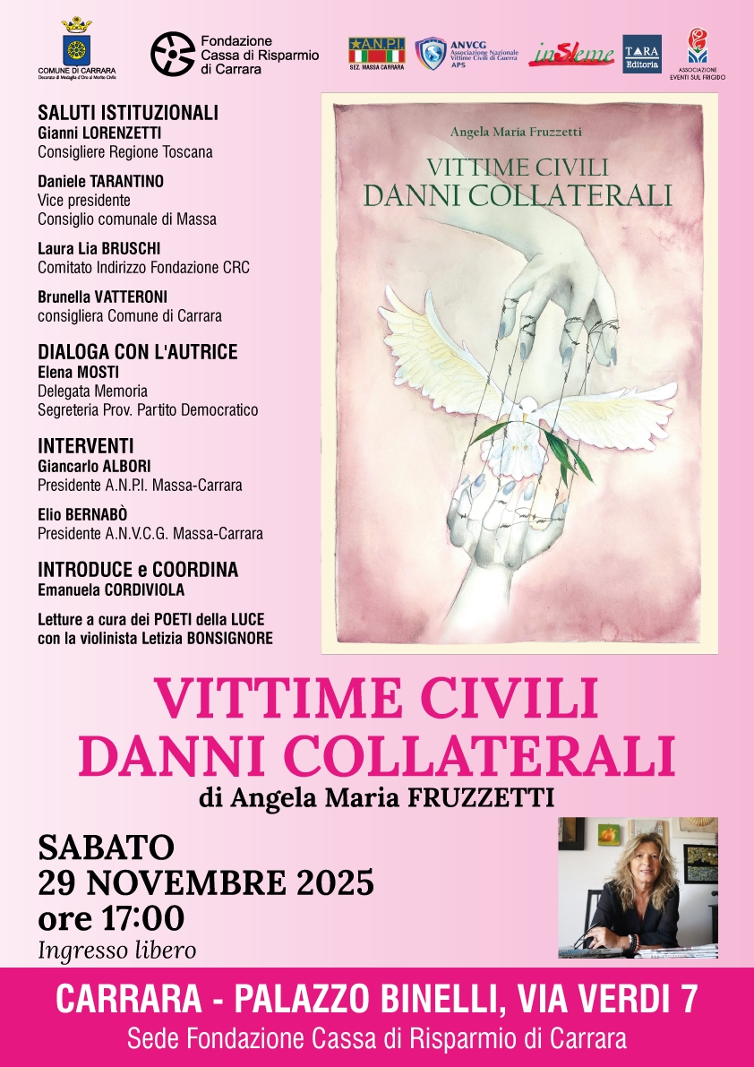 CARRARA – Dopo la presentazione al Cro di Pietrasanta, “Vittime civili Danni collaterali” prosegue il suo tour nei luoghi della memoria. Il libro della giornalista Angela Maria Fruzzetti ( Tara Editoria), rientra nel progetto promosso dall’Associazione Nazionale Vittime Civili di Guerra (ANVCG) nell’ambito delle celebrazioni dell’Ottantesimo della Liberazione 2025. Sabato 29 novembre 2025, vigilia della Festa della Toscana sul tema della Pace, il libro sarà presentato a Palazzo Binelli, sede della Fondazione della Cassa di Risparmio di Carrara. Le letture, a cura dei poeti della Luce (