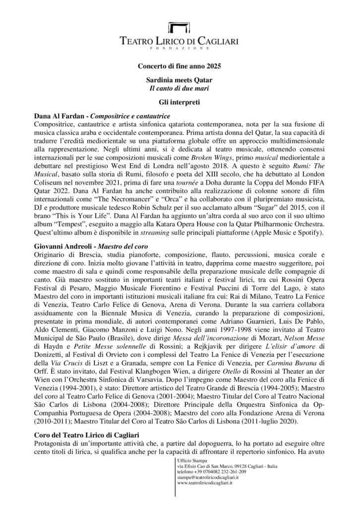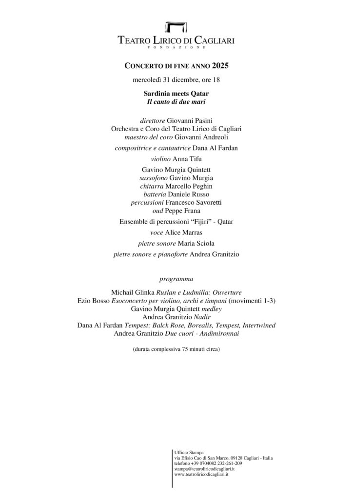 Il Concerto di fine anno 2025 rappresenta quindi il primo appuntamento ufficiale della nuova collaborazione culturale tra la Regione Autonoma della Sardegna e lo Stato del Qatar, paese con il quale sono in corso significative interlocuzioni istituzionali nel settore turistico, culturale e dei trasporti.