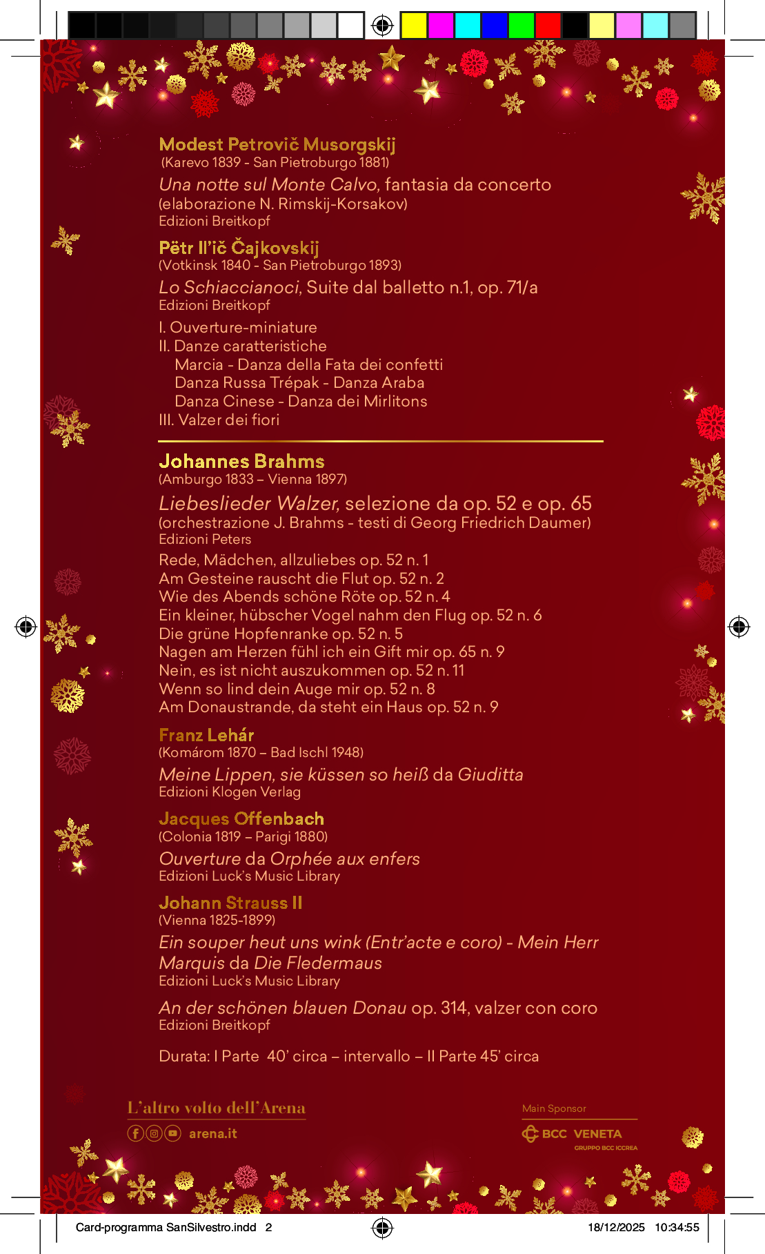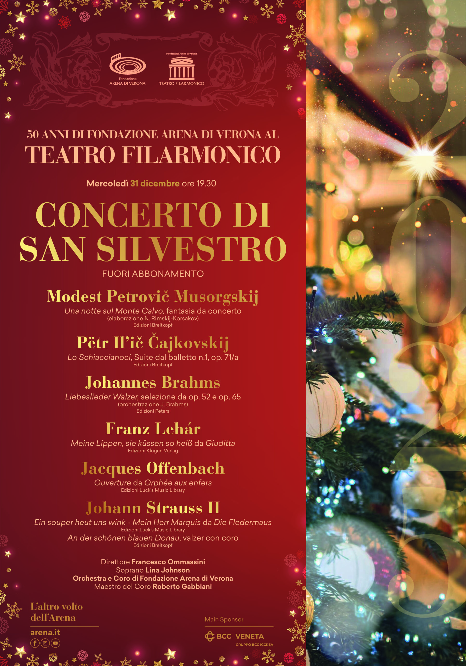 Un veglione a ritmo di valzer, e non solo, con l’Orchestra e il Coro di Fondazione Arena. Mercoledì 31 dicembre, per concludere degnamente la Stagione Artistica 2025, nonché il 50° anniversario della riapertura all’opera del ricostruito Teatro Filarmonico, il programma esplorerà la danza sinfonico-corale nelle sue forme più alte e diverse del secondo Ottocento: dal sabba vertiginoso della Notta sul Monte Calvo di Musorgskij nella brillante orchestrazione di Rimskij-Korsakov, alla fantasia natalizia e fiabesca della Suite dallo Schiaccianoci di Čajkovskij, fino alla Vienna aurea del valzer di Strauss junior (dal Pipistrello al bel Danubio blu) e del suo amico e ammiratore Brahms. Tra grandi classici da concerto e amatissimi brani dal mondo dell’operetta -compresa Giuditta di Lehár- Fondazione Arena saluta il 2025 con un impaginato originale e una gustosa anticipazione della Stagione 2026: al centro della serata, infatti, i nove Liebesliederwalzer che Johannes Brahms strumentò personalmente dalle sue due fortunatissime raccolte per quartetto vocale e pianoforte, previsti nella stagione da camera dell’anno venturo nella forma originaria. Mercoledì 31 saranno eseguiti per la prima volta dal Coro di Fondazione Arena, preparato da Roberto Gabbiani, e dall’Orchestra guidata da Francesco Ommassini, più volte applaudito sul podio del teatro veronese e reduce dal debutto in Arena proprio lo scorso Festival. Al suo esordio a Verona, nei brani solistici sarà impegnata anche Lina Johnson, soprano norvegese dall’eclettico repertorio che spazia dal barocco alla contemporaneità. La durata complessiva prevista del Concerto di San Silvestro è di due ore circa, compreso un intervallo.