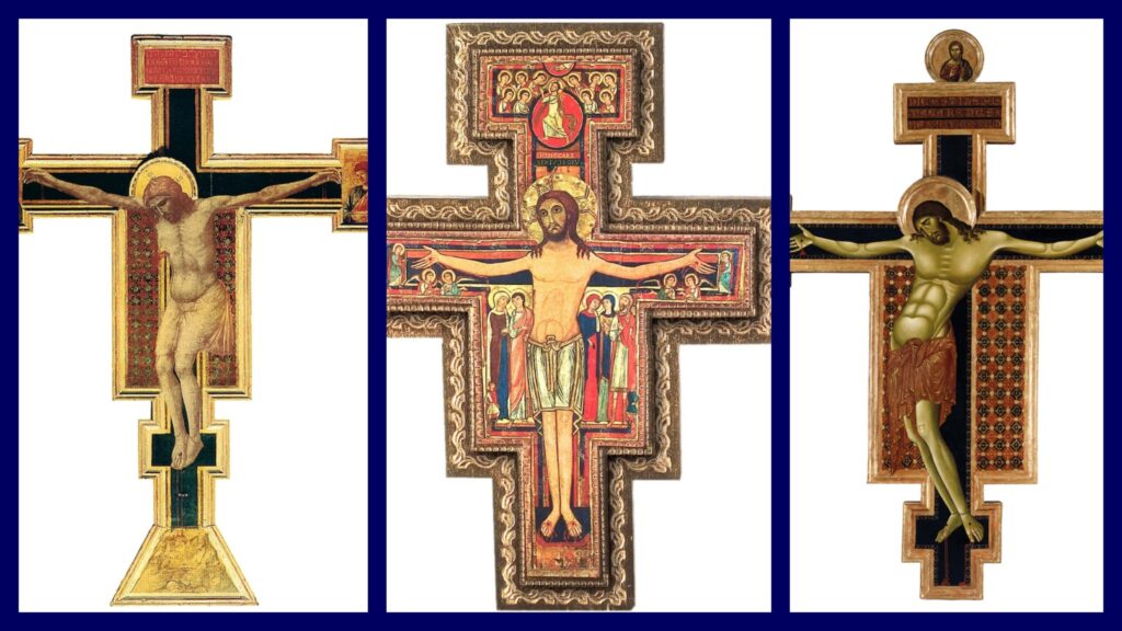 Il Santo è gioioso sempre altrimenti non sarebbe nulla. I tre Crocefissi (Cimabue Giotto San Damiano) sono la lettura delle Anime non nella storia ma nell’Anima di un Tempo spirituale che non si comprende con la conoscenza ma con il Mistero.