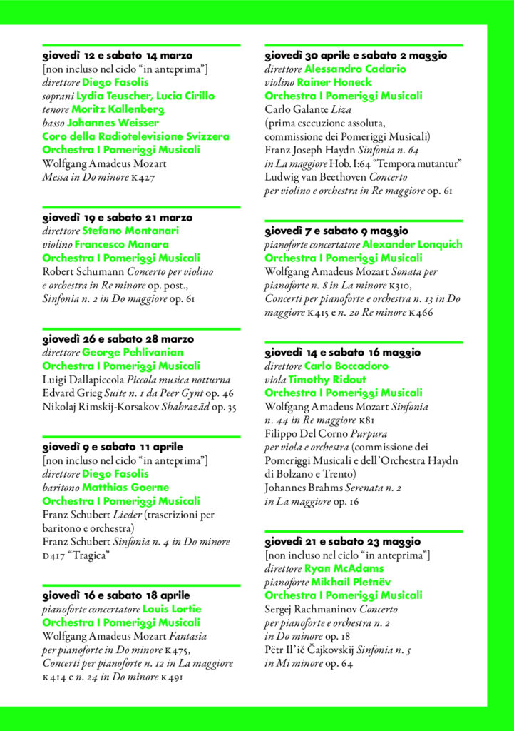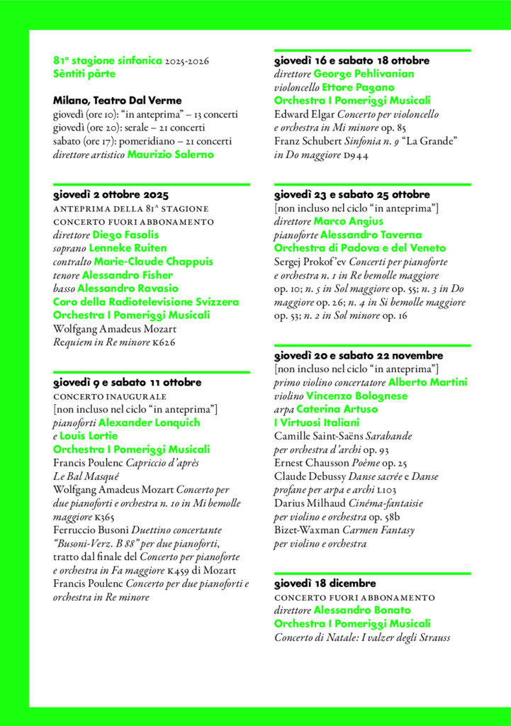 Sul podio torna molto atteso Alessandro Bonato, direttore tra i più apprezzati della sua generazione, protagonista di una carriera in costante ascesa tra repertorio sinfonico e operistico, in Italia e all’estero. Accanto a lui, Gennaro Cardaropoli, violinista nato nel 1997, vincitore di prestigiosi concorsi internazionali e già ospite delle principali sale europee e americane, che suona un violino Pietro Guarneri, Venezia 1735 ex Francisco Costa per gentile concessione della Fondazione Pro Canale di Milano. Due artisti italiani molto amati dal pubblico milanese che li segue attraverso le stagioni dei Pomeriggi musicali sin dalle loro prime apparizioni.