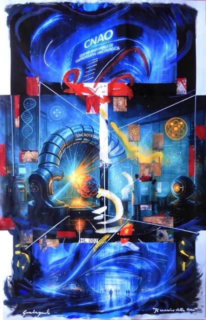 Francesco Guadagnuolo ha recentemente dedicato un’opera al CNAO (Centro Nazionale Adroterapia Oncologica)di Pavia per celebrare i 25 anni di attività clinica e scientifica del Centro. “Sincrotrone: l’arte come accelerazione di speranza” nasce dall’incontro tra rigore scientifico e visione poetica, unendo il linguaggio Transrealista alla dimensione umana che Guadagnuolo ha percepito nel Centro: un luogo in cui la tecnologia più avanzata convive con la fragilità dei pazienti e con la dedizione di chi li cura. La Mostra, visitabile fino al 12 febbraio 2026, propone un modello in cui creatività e scienza si intrecciano per generare una nuova esperienza umana, capace di trasformare la conoscenza in empatia e la ricerca in speranza.