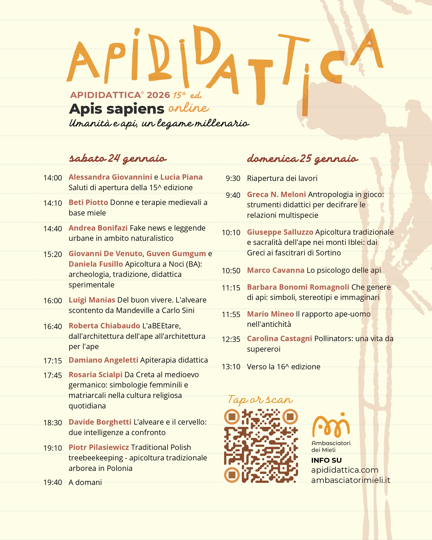 Con questo tema ApiDidattica vuole esplorare l’antico e profondo legame tra le società umane e le api, creature fondamentali per l’equilibrio degli ecosistemi e simbolo di operosità, cooperazione e armonia con la natura. Attraverso un approccio multidisciplinare che vuole unire scienza, storia, arte, cultura, letteratura e filosofia, si intende raccontare come questo rapporto si sia evoluto nei millenni, influenzando l’agricoltura, l’alimentazione, la cultura e la spiritualità. Un’occasione per avere nuovi strumenti didattici, per riflettere sul ruolo delle api oggi e sull’importanza della loro tutela per il futuro dell’umanità. ApiDidattica Ⓡ 2026 racconterà allora la loro storia, con varie sfaccettature, che è un po’ anche la nostra. ApiDidattica Ⓡ è da sempre un’occasione di condivisione e scambio di idee, un luogo che promuove la diversità e ciò che è altro in tutte le sue forme. Perché come sempre in natura la condivisione è ricchezza.