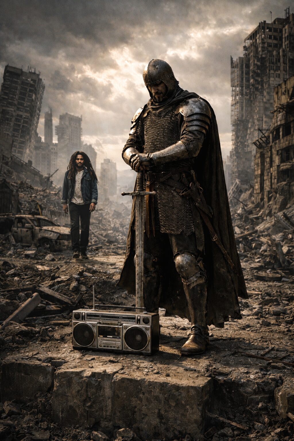Avanzo a paso lento, sintiendo entre las manos enguantadas el peso del mandoble. En medio del paisaje, un objeto de forma regular, de bordes rectos, emite un sonido que, al acercarme, se resuelve en una voz humana atravesada por una felicidad inexplicable. Es una música distinta de cualquiera que haya oído en los salones de un castillo o en gestas festivas.