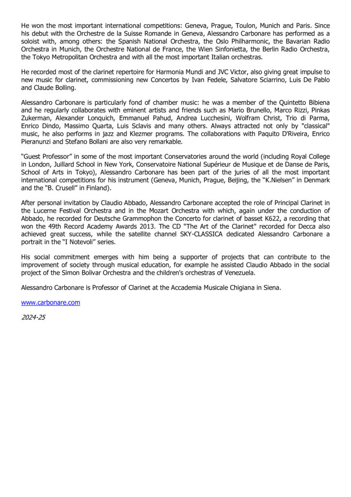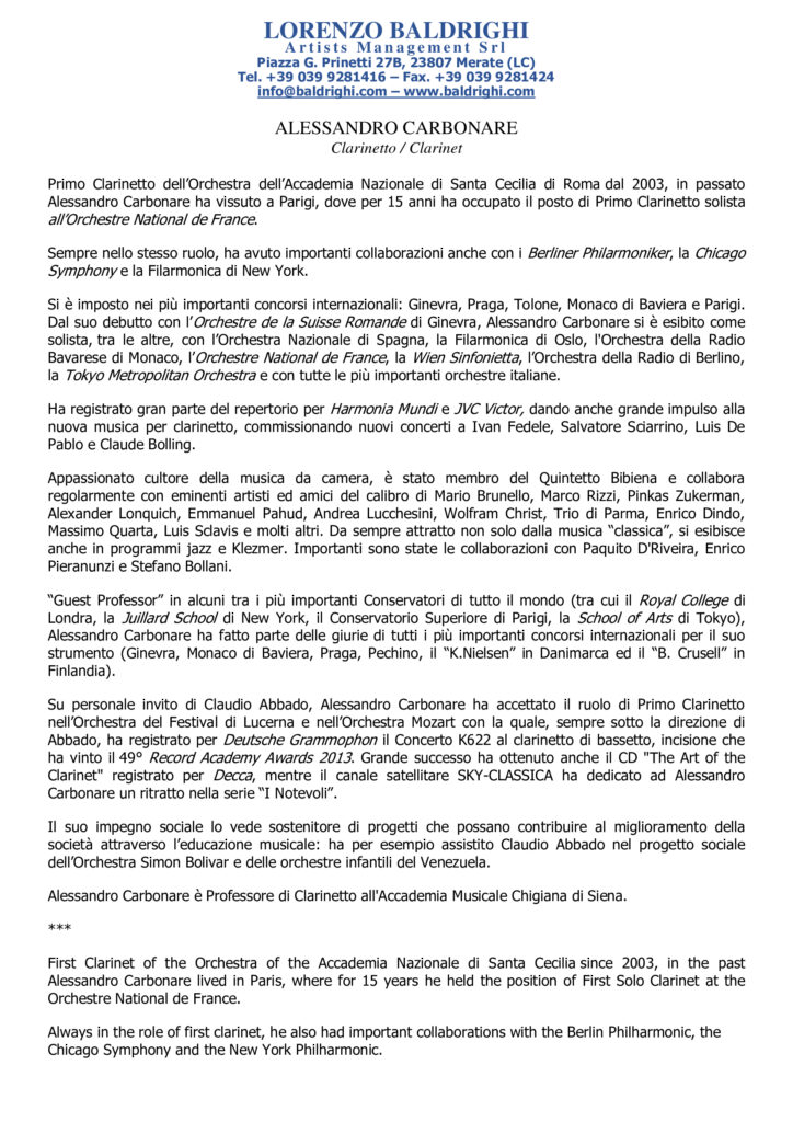 Primo Clarinetto dell’Orchestra dell’Accademia Nazionale di Santa Cecilia di Roma dal 2003, in passato Alessandro Carbonare ha vissuto a Parigi, dove per 15 anni ha occupato il posto di Primo Clarinetto solista all’Orchestre National de France. Sempre nello stesso ruolo, ha avuto importanti collaborazioni anche con i Berliner Philarmoniker, la Chicago Symphony e la Filarmonica di New York.