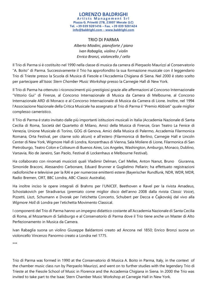 Il Trio di Parma si è costituito nel 1990 nella classe di musica da camera di Pierpaolo Maurizzi al Conservatorio “Arrigo Boito” di Parma. Successivamente il Trio ha approfondito la sua formazione musicale con il leggendario Trio di Trieste presso la Scuola di Musica di Fiesole e l’Accademia Chigiana di Siena. Nel 2000 è stato scelto per partecipare all’Isaac Stern Chamber Music Workshop presso la Carnegie Hall di New York.