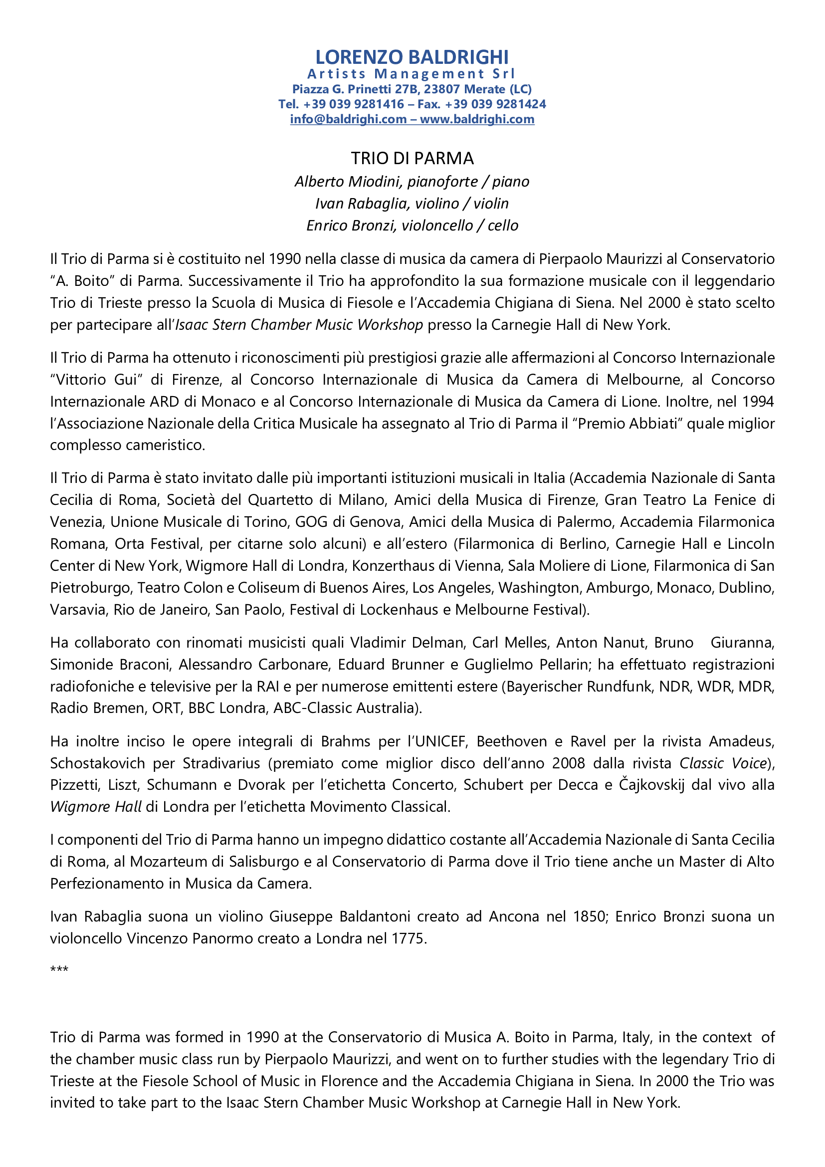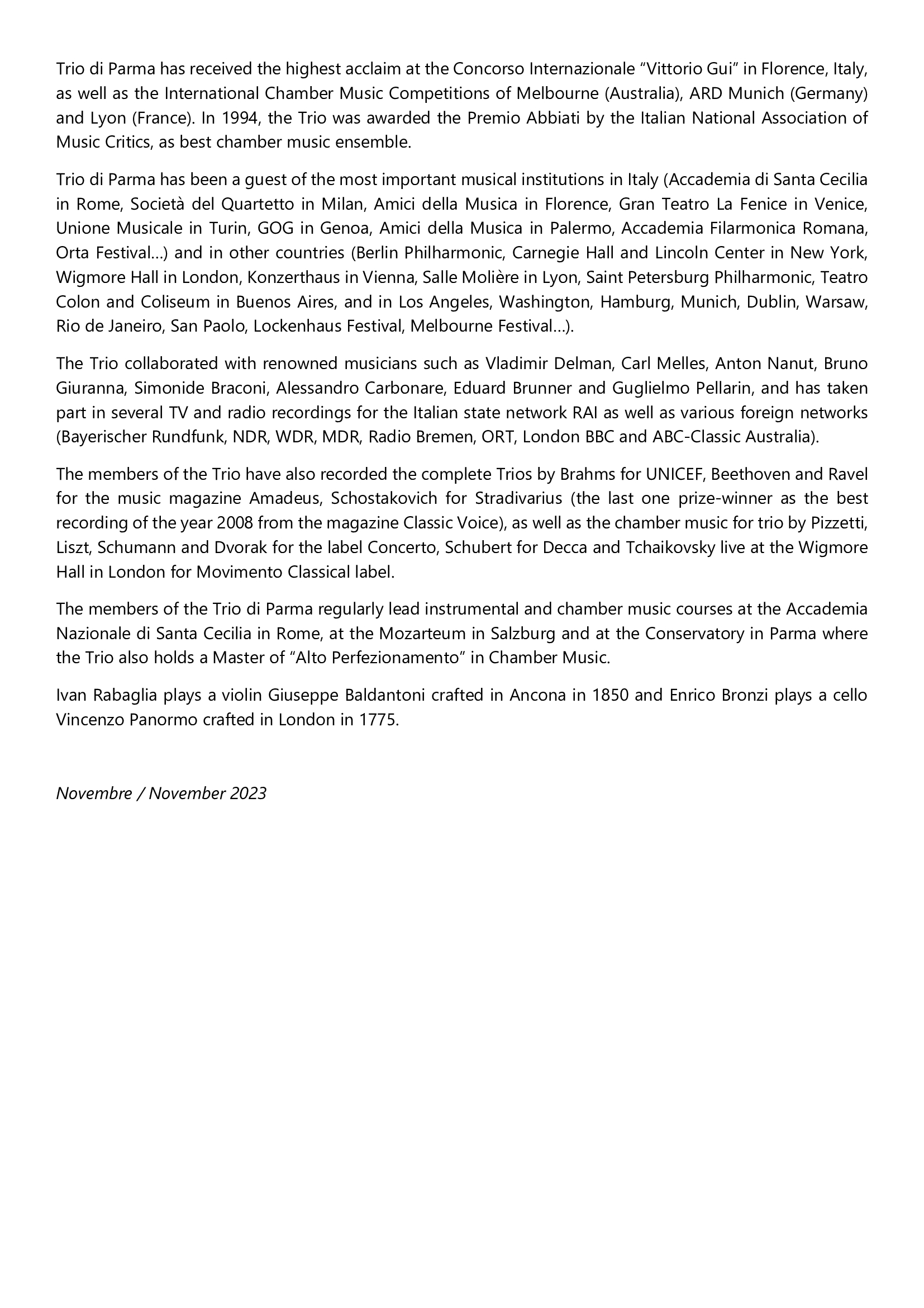 Il Trio di Parma è stato invitato dalle più importanti istituzioni musicali in Italia (Accademia Nazionale di Santa Cecilia di Roma, Società del Quartetto di Milano, Amici della Musica di Firenze, Gran Teatro La Fenice di Venezia, Unione Musicale di Torino, GOG di Genova, Amici della Musica di Palermo, Accademia Filarmonica Romana, Orta Festival, per citarne solo alcuni) e all’estero (Filarmonica di Berlino, Carnegie Hall e Lincoln Center di New York, Wigmore Hall di Londra, Konzerthaus di Vienna, Sala Moliere di Lione, Filarmonica di San Pietroburgo, Teatro Colon e Coliseum di Buenos Aires, Los Angeles, Washington, Amburgo, Monaco, Dublino, Varsavia, Rio de Janeiro, San Paolo, Festival di Lockenhaus e Melbourne Festival).