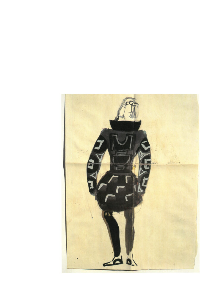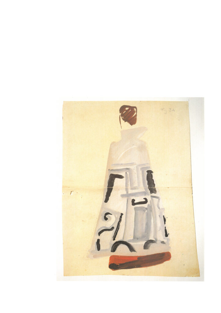 I disegni, semplici ed essenziali, vivono soprattutto per i colori stesi in modo compatto e frammentato che ricostruiscono via via le sagome dei personaggi, rivisitando un antico abbigliamento in modo autonomo rispetto ai possibili modelli rinascimentali. Questi disegni rivivono ora anche davanti a noi che possiamo ammirare i figurini realizzati con matita e tempera e spesso accompagnati da appunti esplicativi e da campioni di stoffe previste per la realizzazione, ancora fermati con gli spilli.