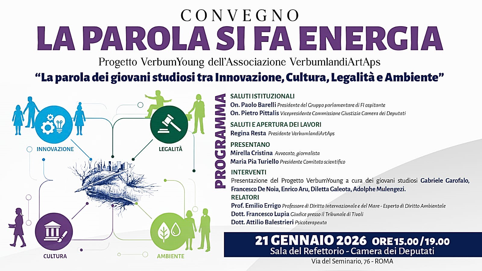ROMA- Si è svolto con grande partecipazione e consenso il Convegno Nazionale “La Parola si fa Energia”, primo appuntamento pubblico del Progetto VerbumYoung – Giovani Studiosi, promosso dall’Associazione VerbumlandiArt APS. L’evento, ospitato nella prestigiosa Sala del Refettorio della Camera dei Deputati, ha rappresentato un momento di altissimo profilo istituzionale, culturale e accademico, sancendo ufficialmente l’avvio di un progetto destinato a incidere in modo significativo nel panorama culturale nazionale.