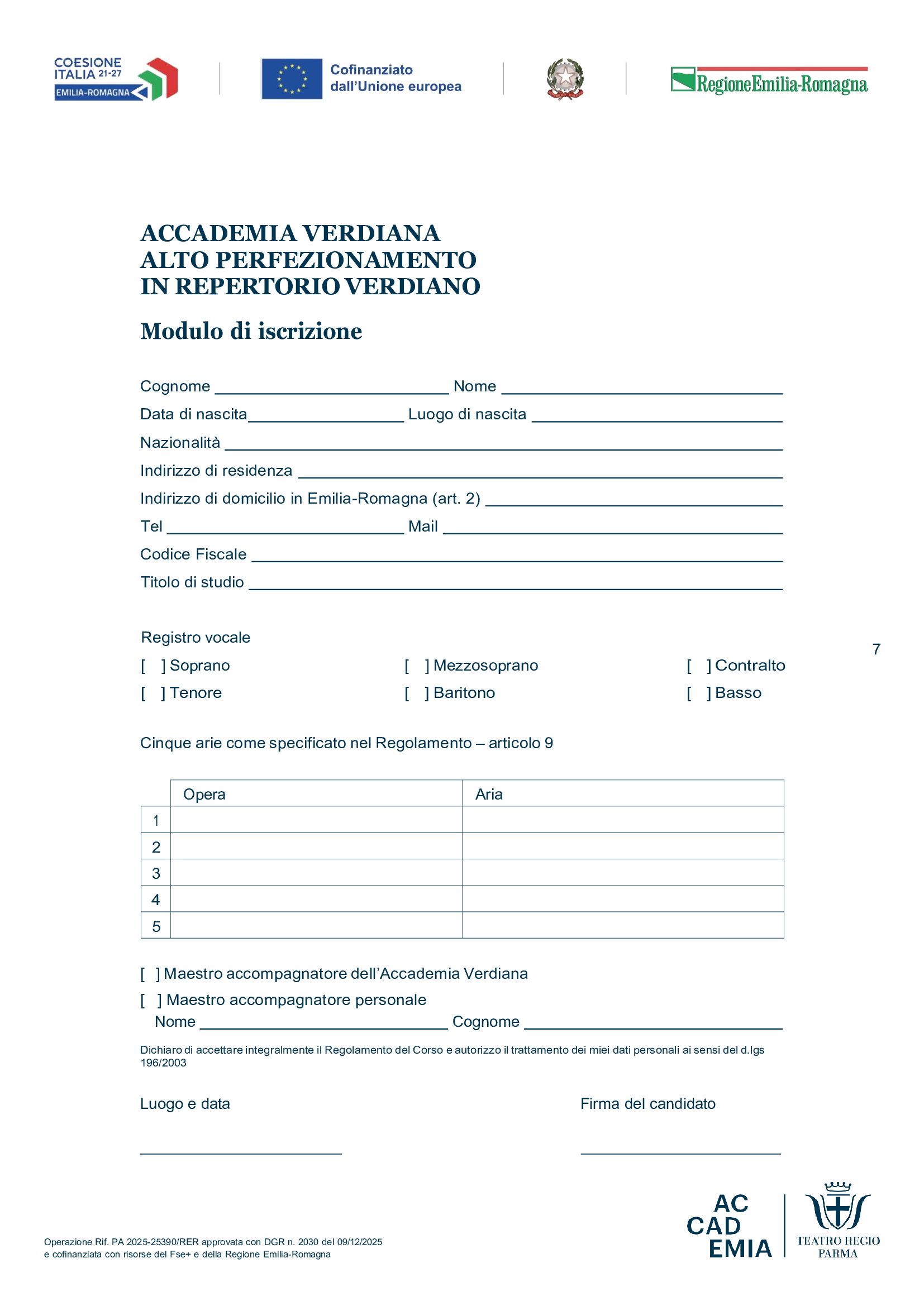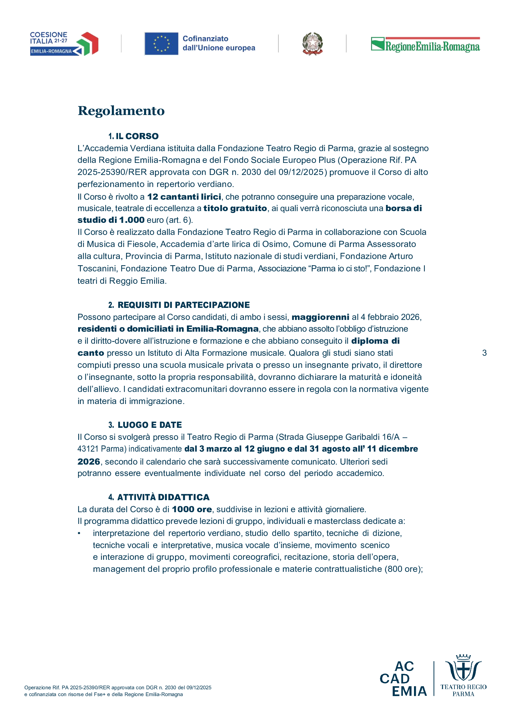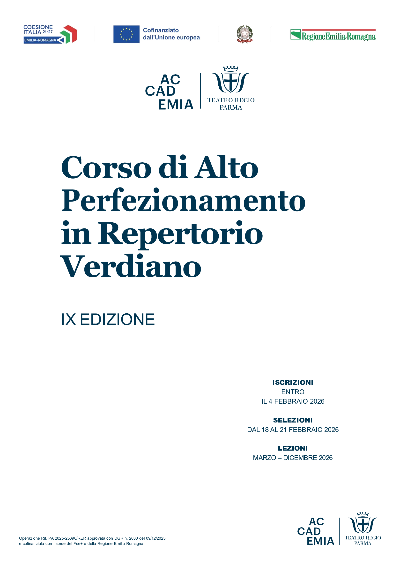 Il Corso è promosso dal Teatro Regio di Parma e cofinanziato con risorse del Fondo sociale europeo plus e della Regione Emilia-Romagna (Operazione Rif. PA 2025-25390/RER approvata con DGR n. 2030 del 09/12/2025) ed è realizzato in collaborazione con Scuola di Musica di Fiesole, Accademia d’arte lirica di Osimo, Comune di Parma Assessorato alla cultura, Provincia di Parma, Istituto nazionale di studi verdiani, Fondazione Arturo Toscanini, Fondazione Teatro Due di Parma, Associazione “Parma, io ci sto!”, Fondazione I teatri di Reggio Emilia.
