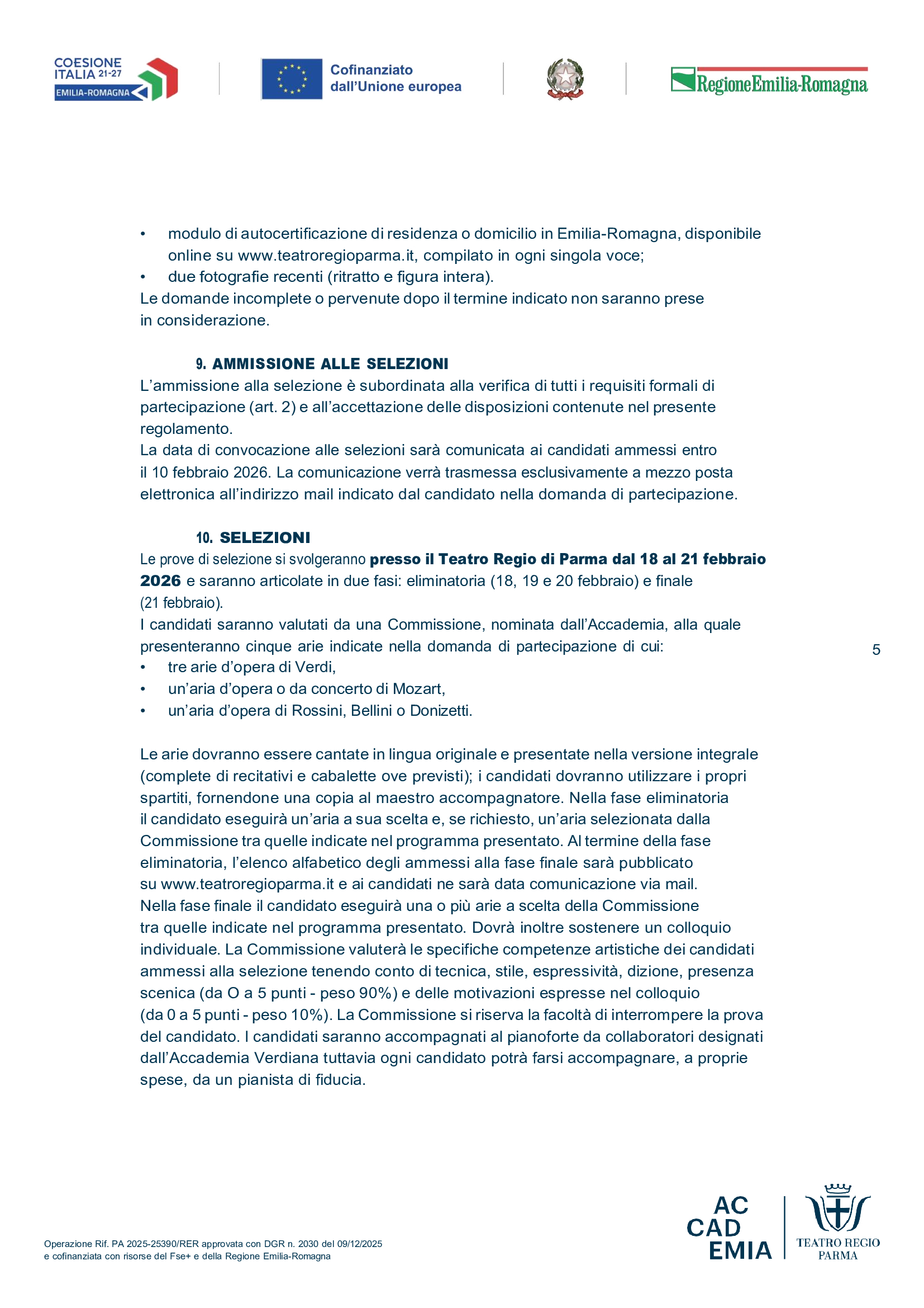 Le selezioni, articolate in una fase eliminatoria e una fase finale, si svolgeranno al Teatro Regio di Parma dal 18 al 21 febbraio 2026, secondo il programma indicato nel regolamento. L’esito sarà pubblicato online il 23 febbraio 2026.