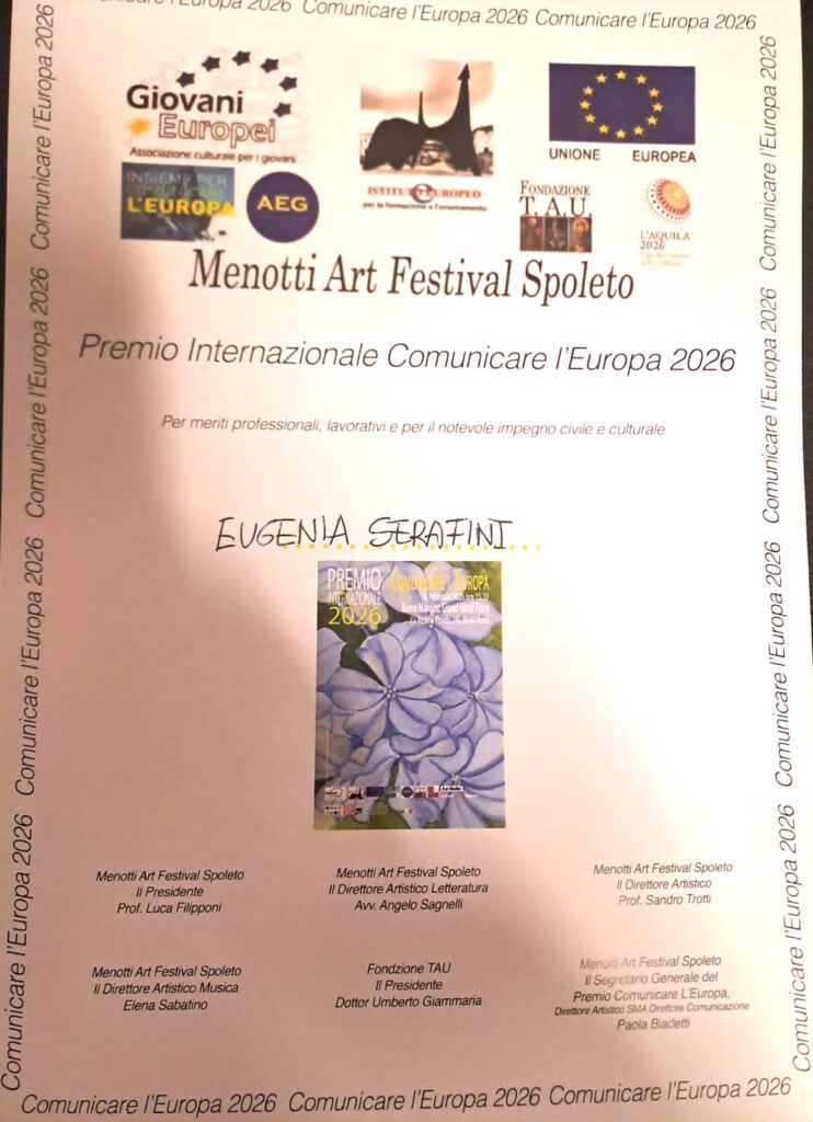 ROMA – Un nuovo prestigioso riconoscimento per l’artista e scrittrice internazionale Eugenia Serafini, alla quale sarà consegnato il 5 febbraio alle ore 15:30, presso il Grand Hotel Flora Marriott in Via Veneto a Roma, il Premio “Comunicare l’Europa” 2026, con la seguente motivazione: “Per il significativo contributo alla diffusione di una visione dell’Europa fondata su cultura, partecipazione, responsabilità e apertura”.