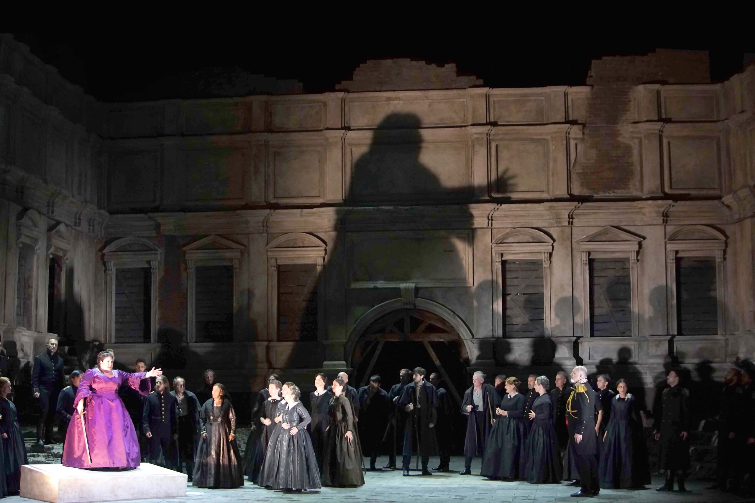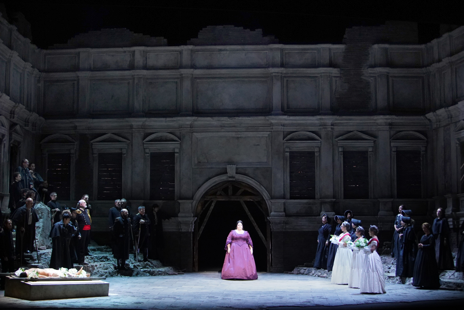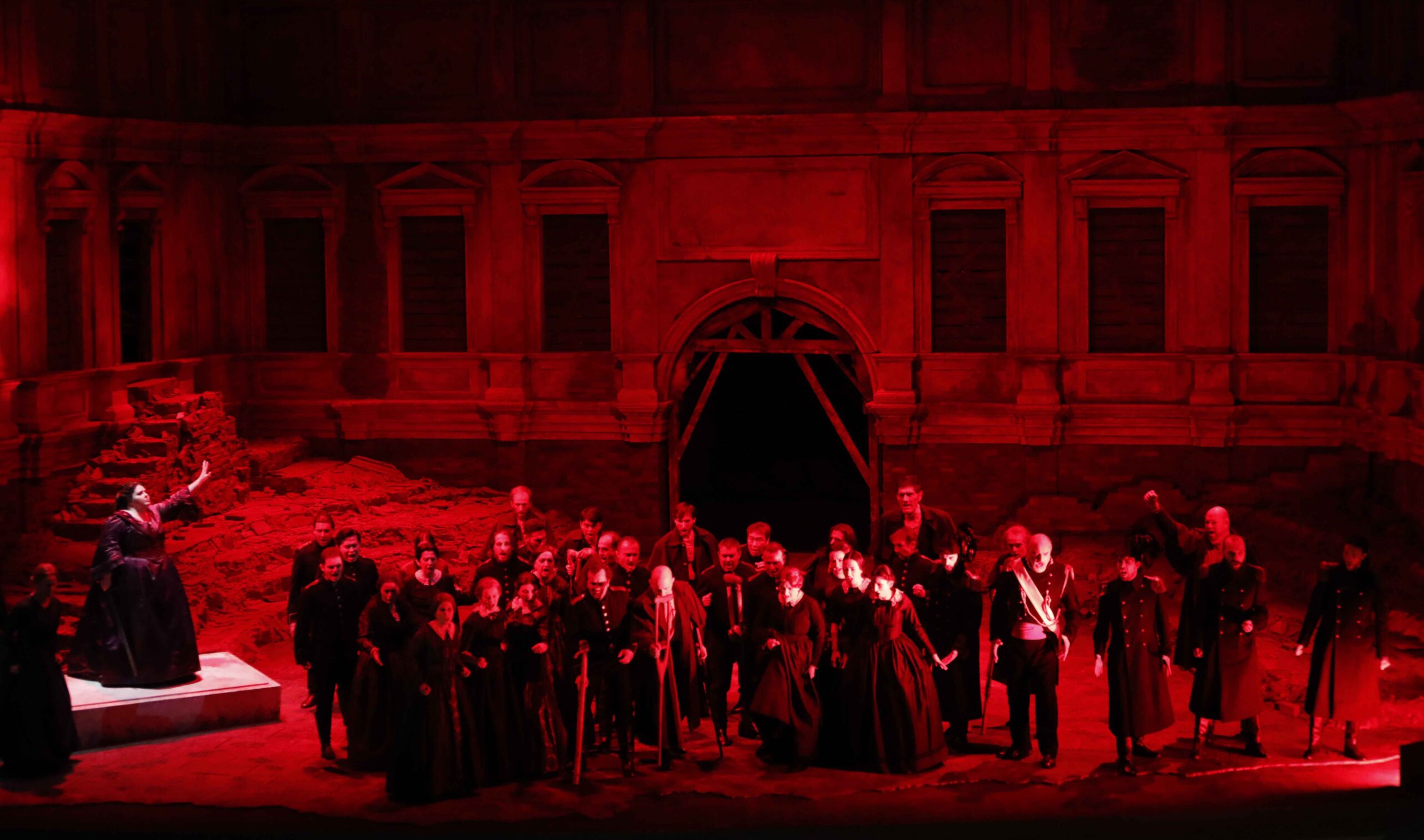 “L’idea centrale è l’osservazione dei detriti di una società vinta e conquistata, sullo sfondo di una guerra continua, scrive Nicola Berloffa. Troviamo i Galli sconfitti che vivono reclusi in un palazzo ottocentesco incendiato e devastato, ultime vestigia di un potere perduto. Nessun druido con la barba, ma vecchi generali e soldati attaccano con le poche forze restanti Norma, cercando di estorcerle il segnale atto ad una agognata e penosa nuova Rivoluzione. In questo adattamento si è spostata l’azione del dramma verso un Ottocento europeo, nel periodo delle grandi lotte e delle rivoluzioni interne che hanno segnato il XIX secolo, pur rispettando perfettamente le dinamiche conflittuali tra vincitori e vinti, i deliri amorosi e le gelosie uterine delle eroine belliniane. Potremmo trovarci a Solferino o a Parigi ai tempi della guerra prussiana. Vedremo cadere Norma, da “donna del popolo” a nuova vittima designata, perché nell’arco del racconto la sacerdotessa passa da beniamina a traditrice con una logica assolutamente moderna e marziale: nessun processo l’attende, solo una condanna urlata dalla piazza con una relativa violenta esecuzione. I temi suggeriti dal libretto potrebbero portarci ad una facile attualizzazione, ma questo non è necessario perché la scrittura musicale di Bellini riesce in modo moderno a farci scoprire personaggi che, una volta liberati dai numeri di parata, provano sentimenti umani. Che sono gli stessi che proviamo noi oggi”.