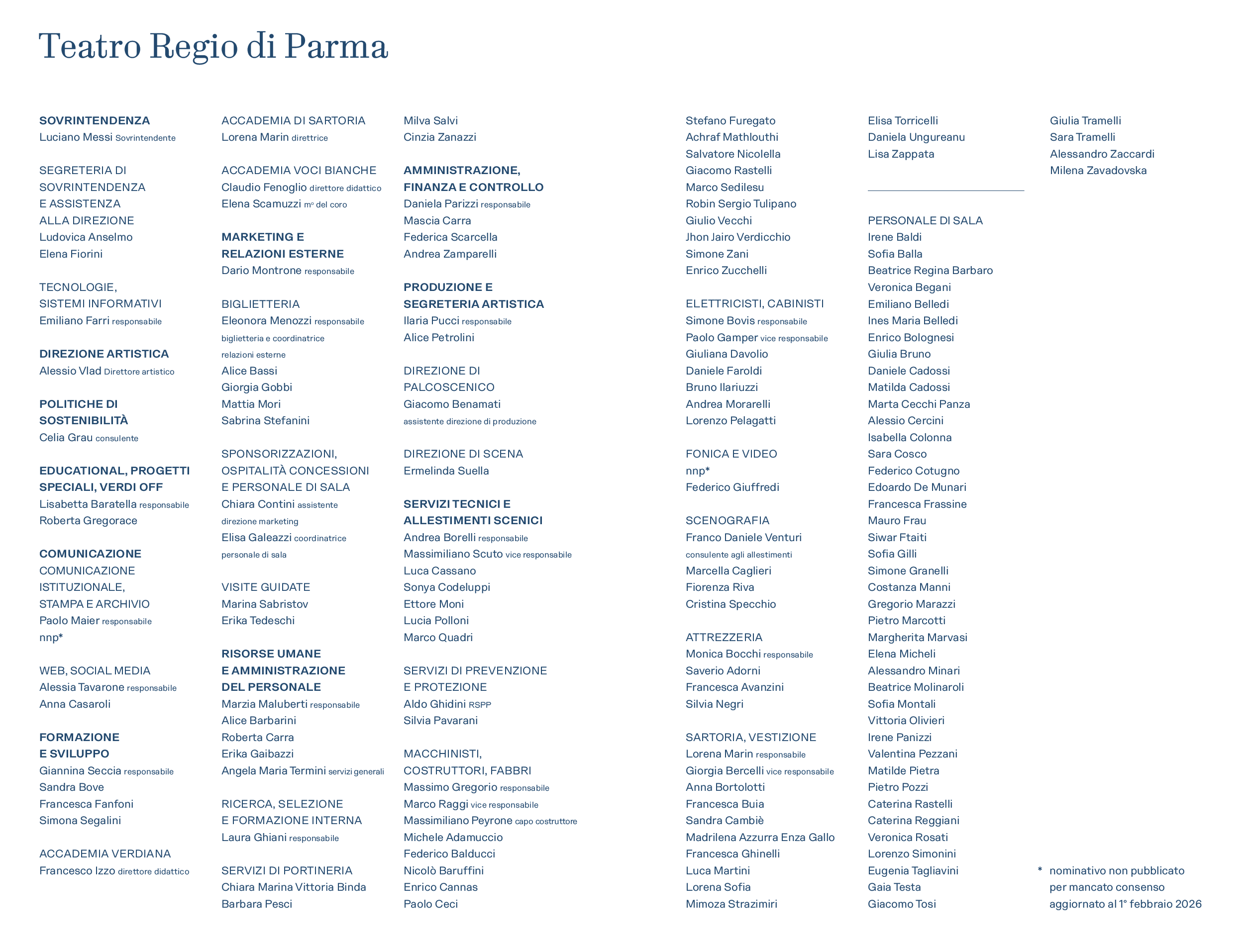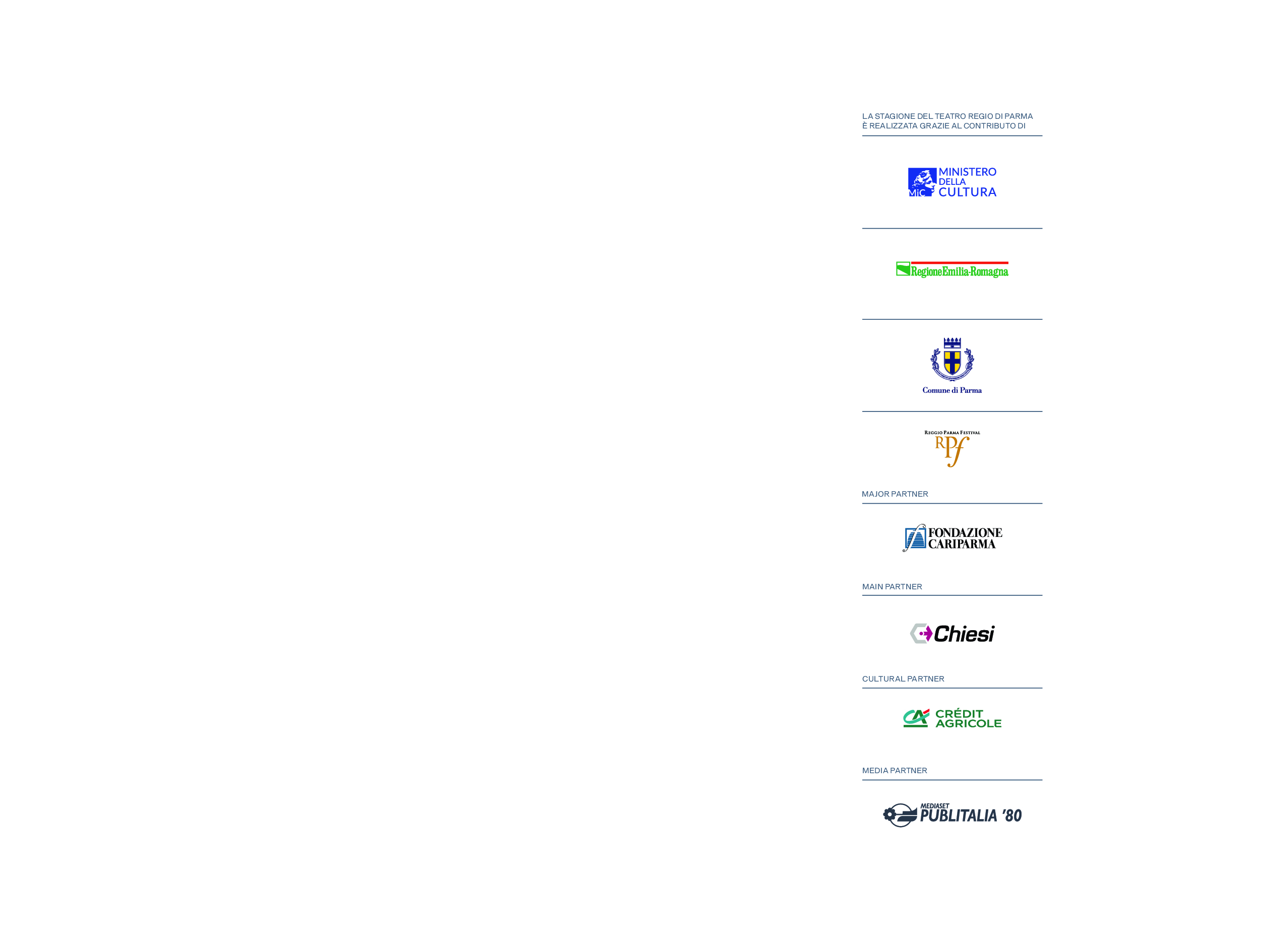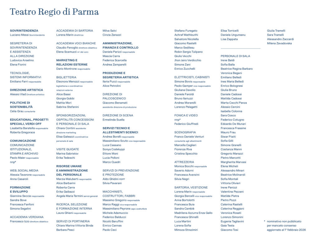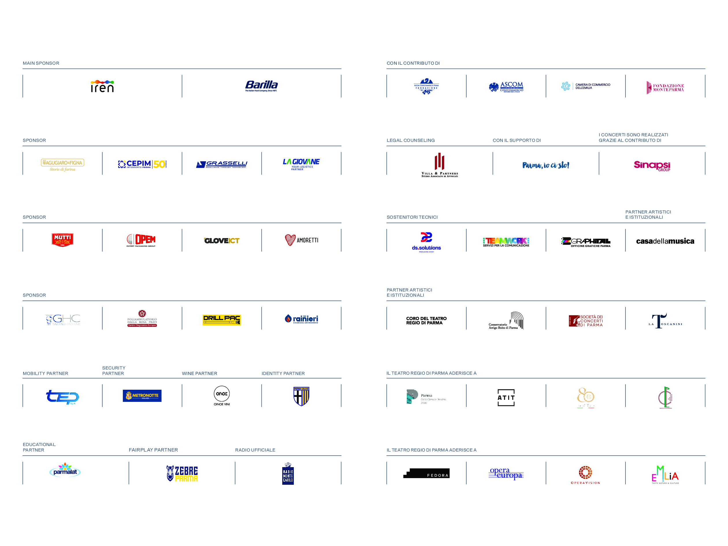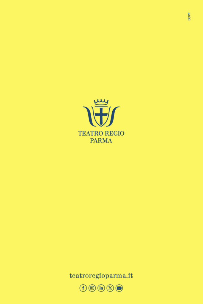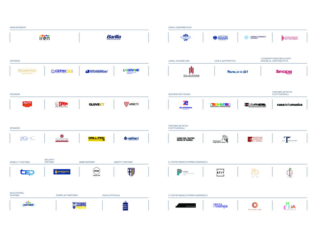 La Stagione del Teatro Regio di Parma è realizzata grazie al contributo di Ministero della Cultura, Regione Emilia-Romagna, Comune di Parma, Reggio Parma Festival. Major partner Fondazione Cariparma. Main partner Chiesi. Cultural partner Crédit Agricole. Media partner Mediaset Publitalia ’80. Main sponsor Iren, Barilla. Sponsor Agugiaro e Figna, CePIM, Grasselli, La Giovane, Mutti, Opem, GloveICT, Amoretti, GHC, Poliambulatorio Dalla Rosa Prati, Drill Pac, Rainieri. Security partner Metronotte. Educational partner Parmalat. Wine partner Oinoe. Mobility partner Tep. Fair Play partner Zebre. Identity Partner Parma Calcio. Radio Ufficiale Radio Monte Carlo. Con il contributo di Ascom Confcommercio Parma Fondazione, Ascom Parma Confcommercio, Camera di Commercio dell’Emilia, Fondazione Monteparma. Legal counselling Villa&Partners. Con il supporto di “Parma, io ci sto!”. Sostenitori tecnici De Simoni, Teamwork, Graphital. Partner artistici e istituzionali Casa della Musica, Coro del Teatro Regio di Parma, Conservatorio “Arrigo Boito”, Società dei Concerti di Parma, La Toscanini. Il Teatro Regio aderisce a Parma Città Climate Neutral 2030, ATIT, AGIS, Comitato per la Salvaguardia dell’Arte del Canto Lirico Italiano, Fedora, Opera Europa, Opera Vision, Emilia taste, nature & culture.