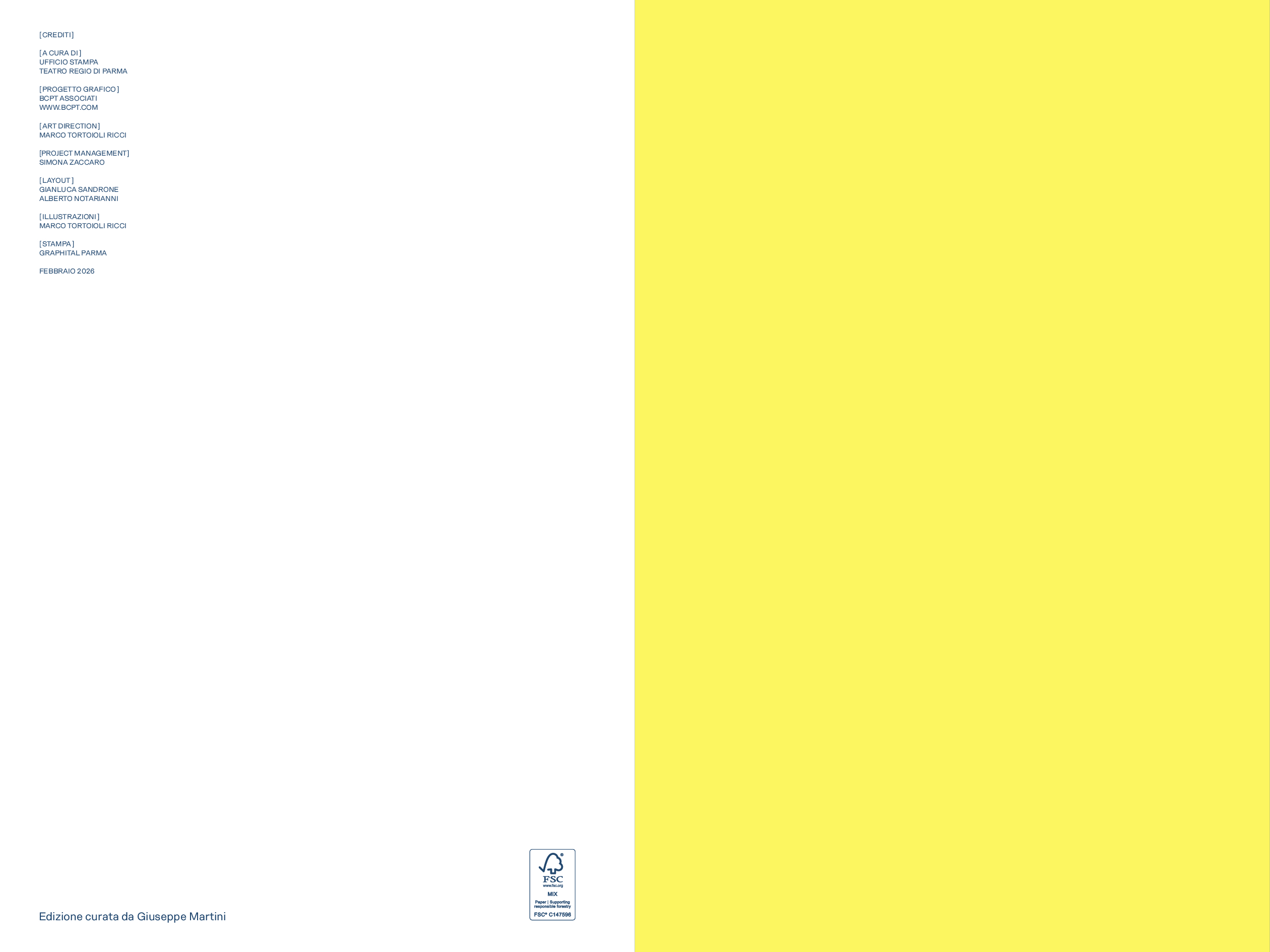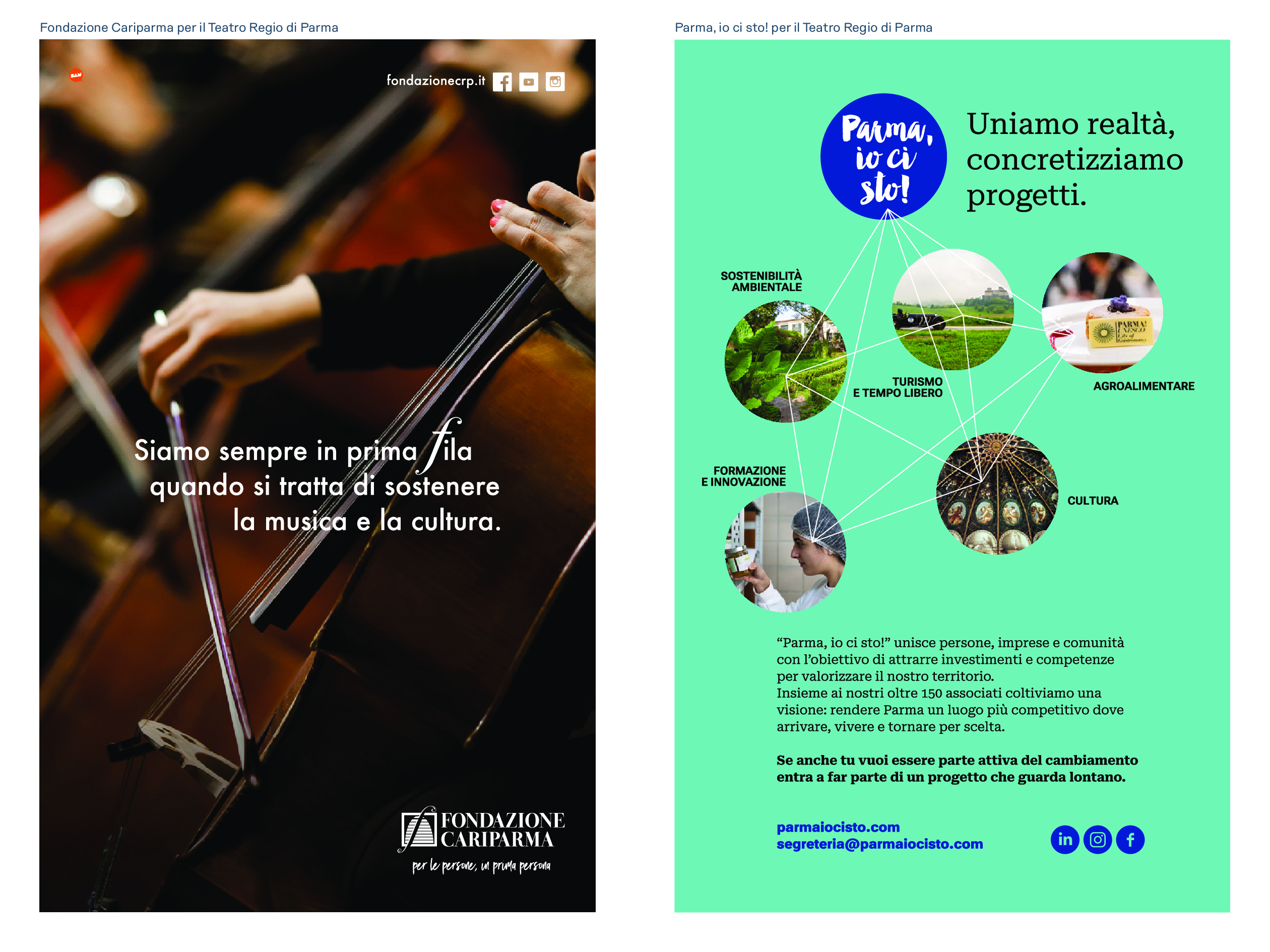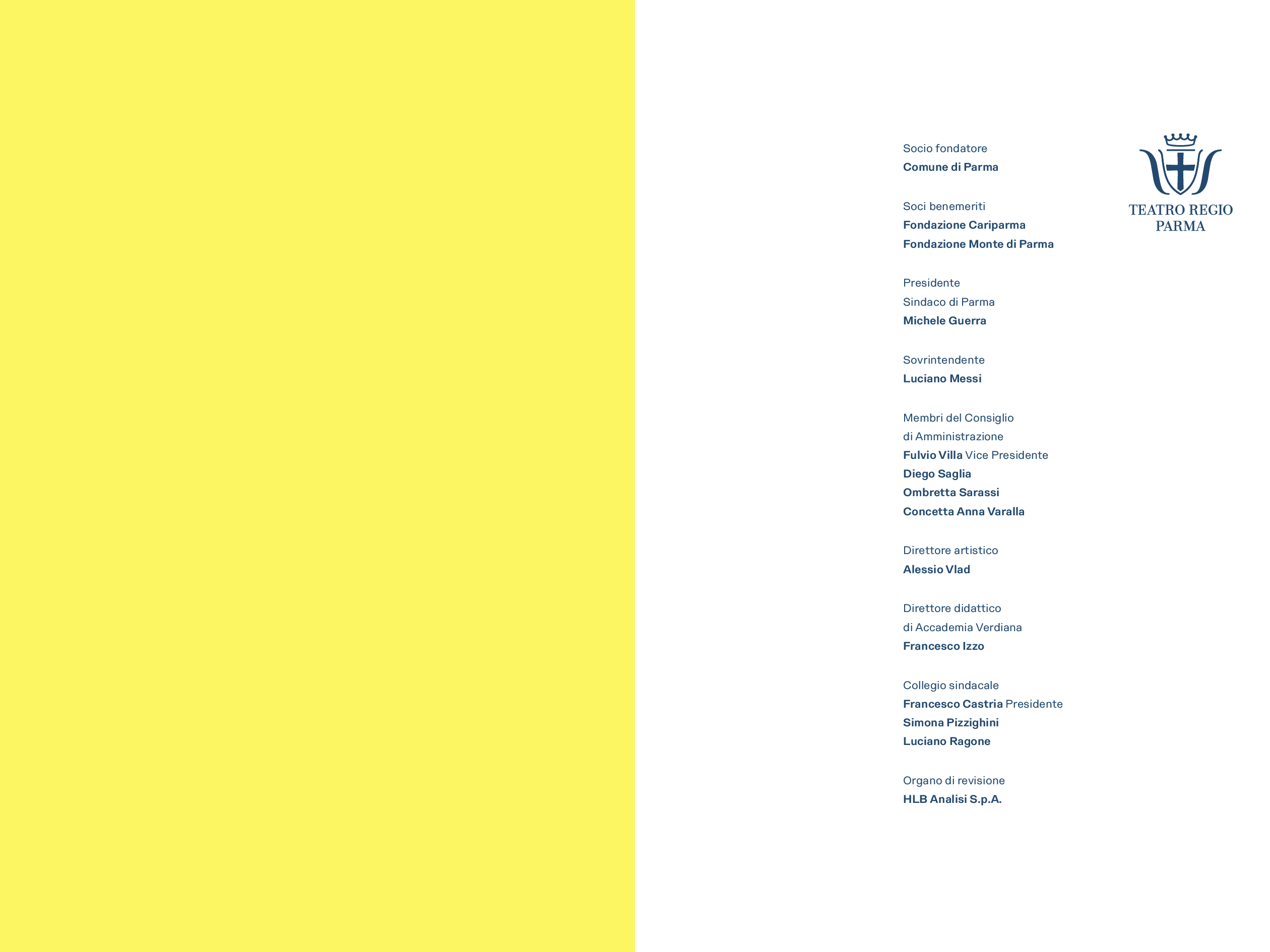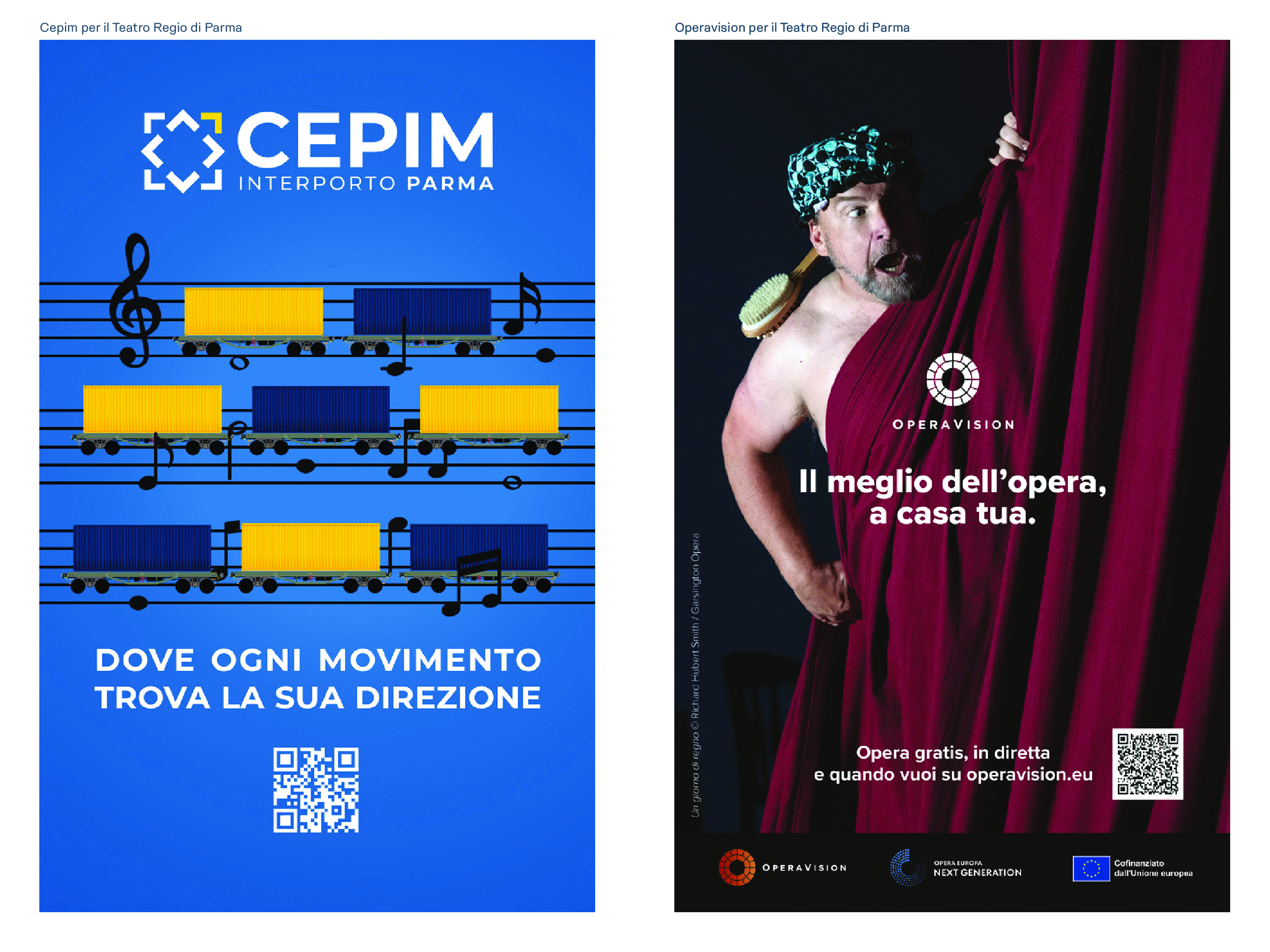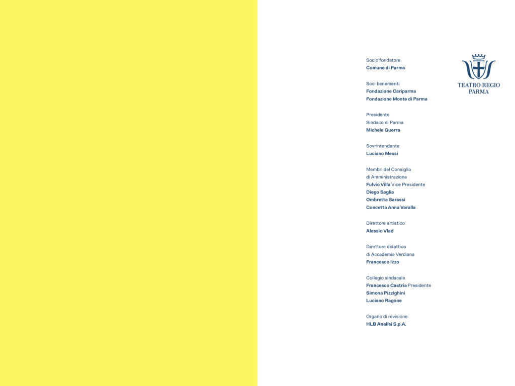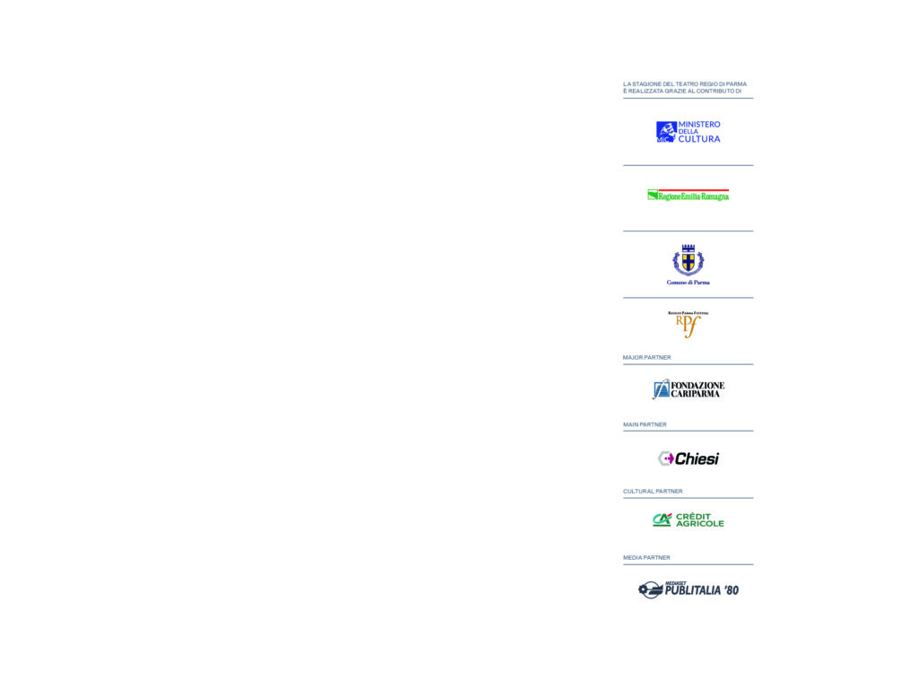 La Stagione del Teatro Regio di Parma è realizzata grazie al contributo di Ministero della Cultura, Regione Emilia-Romagna, Comune di Parma, Reggio Parma Festival. Major partner Fondazione Cariparma. Main partner Chiesi. Cultural partner Crédit Agricole. Media partner Mediaset Publitalia ’80. Main sponsor Iren, Barilla. Sponsor Agugiaro e Figna, CePIM, Grasselli, La Giovane, Mutti, Opem, GloveICT, Amoretti, GHC, Poliambulatorio Dalla Rosa Prati, Drill Pac, Rainieri. Security partner Metronotte. Educational partner Parmalat. Wine partner Oinoe. Mobility partner Tep. Fair Play partner Zebre. Identity Partner Parma Calcio. Radio Ufficiale Radio Monte Carlo. Con il contributo di Ascom Confcommercio Parma Fondazione, Ascom Parma Confcommercio, Camera di Commercio dell’Emilia, Fondazione Monteparma. Legal counselling Villa&Partners. Con il supporto di “Parma, io ci sto!”. Sostenitori tecnici De Simoni, Teamwork, Graphital. Partner artistici e istituzionali Casa della Musica, Coro del Teatro Regio di Parma, Conservatorio “Arrigo Boito”, Società dei Concerti di Parma, La Toscanini. Il Teatro Regio aderisce a Parma Città Climate Neutral 2030, ATIT, AGIS, Comitato per la Salvaguardia dell’Arte del Canto Lirico Italiano, Fedora, Opera Europa, Opera Vision, Emilia taste, nature & culture.