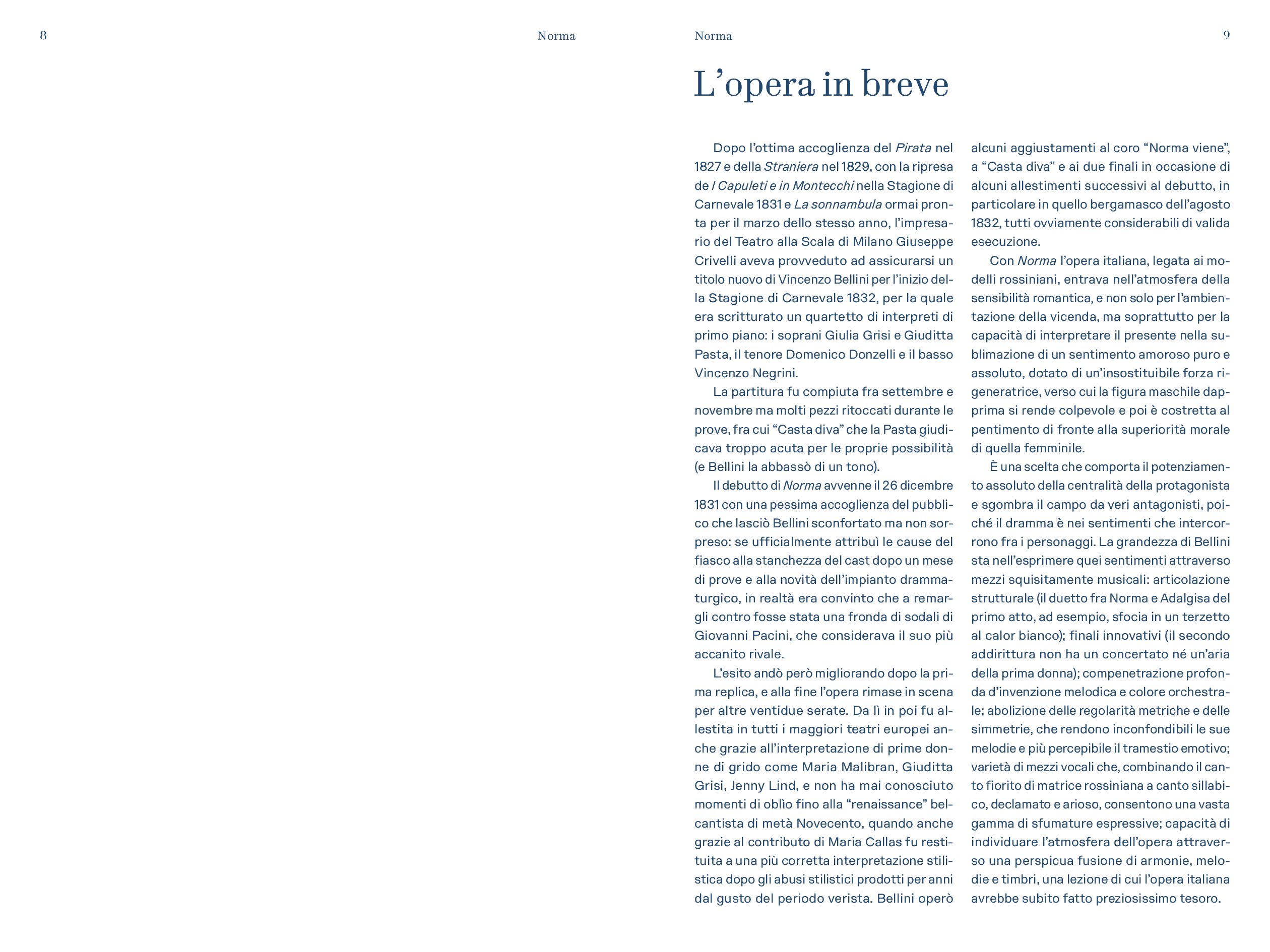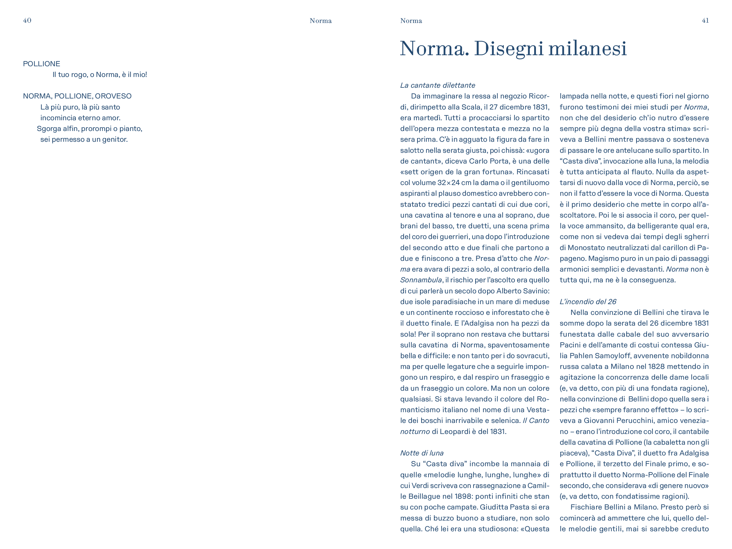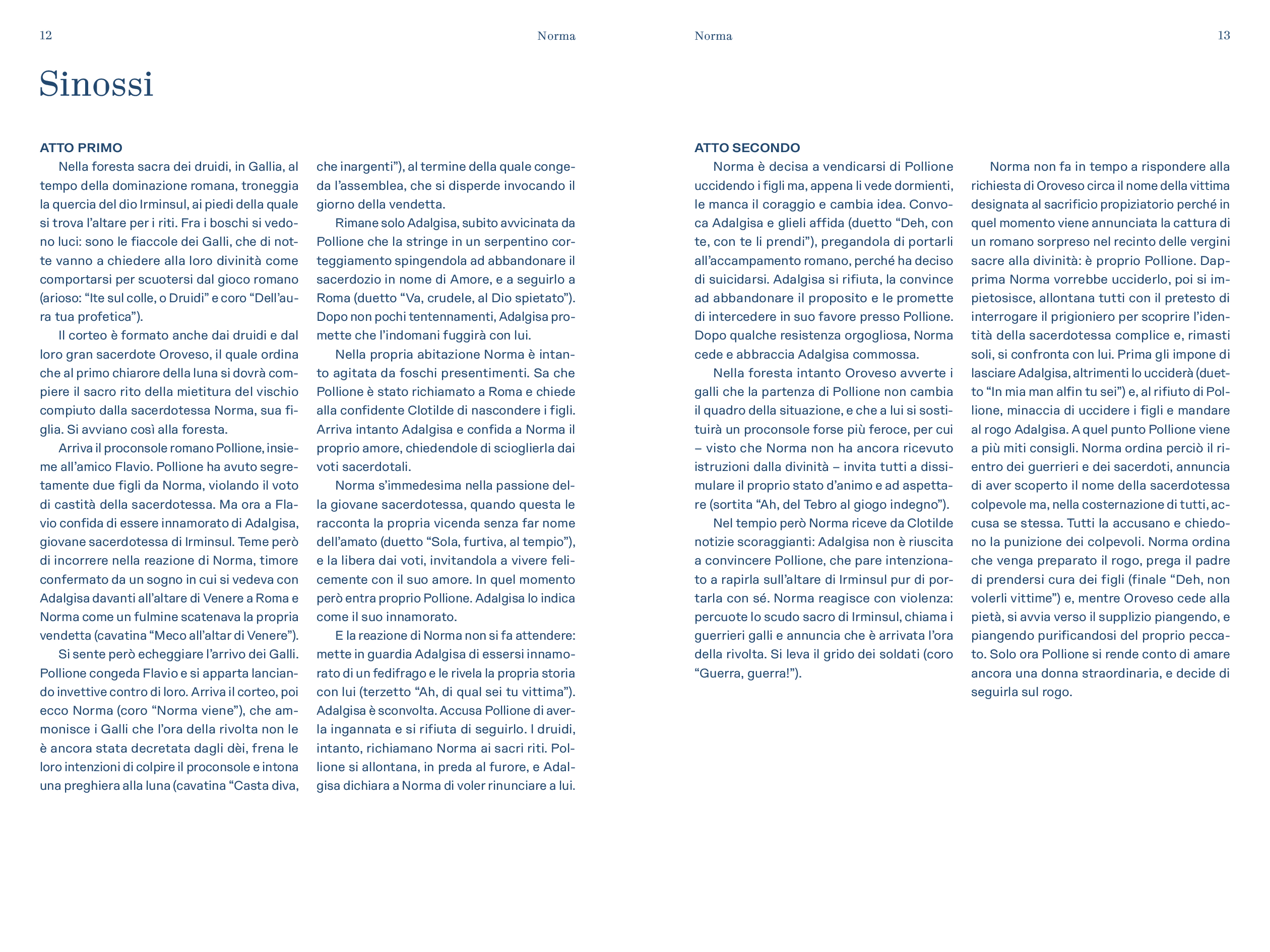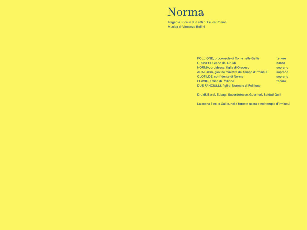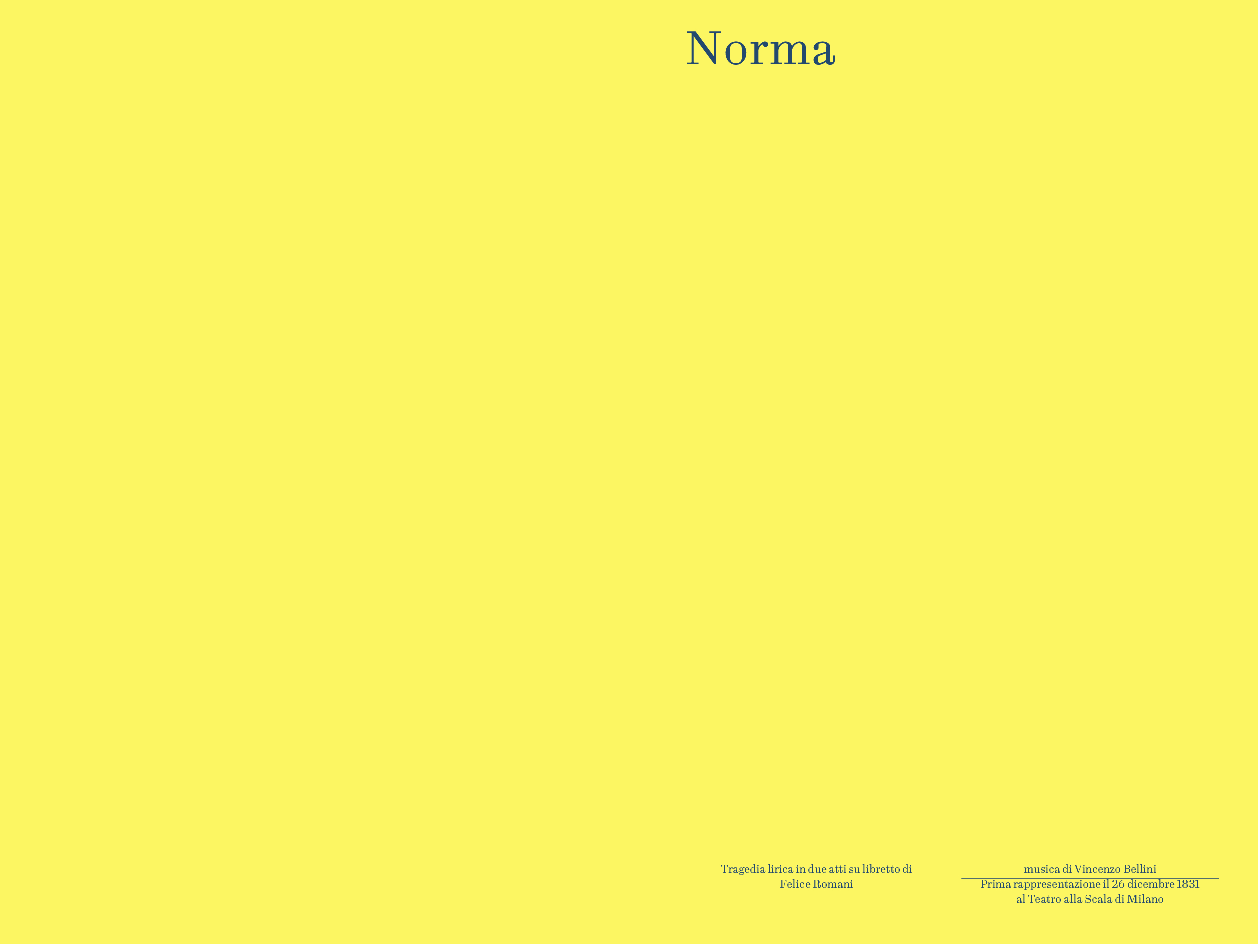Per la sua quarta opera al Teatro alla Scala nel 1831, Vincenzo Bellini scelse insieme al suo librettista Felice Romani un soggetto tragico classicheggiante, che riprendeva il modello del sacrificio della protagonista, come nella Medea di Cherubini, in questo caso una sacerdotessa gallica abbandonata per una donna più giovane dal proconsole romano che l’aveva sedotta e resa madre. Alla prima reazione di Norma, quella di uccidere i figli avuti con l’uomo che l’ha tradita, subentra il pentimento, che la spinge a sacrificare se stessa sul rogo per espiare la propria colpa di empietà. L’ambientazione notturna nella foresta dei druidi rafforza il carattere autoritario e caricato di una passionalità primigenia intrisa di forte fragilità interiore della protagonista, ormai pienamente rispondente al sentire romantico di quegli anni. Partendo dalla base tradizionale belcantista, Bellini costruisce un impianto musicale sottilmente innovativo pur mantenendo la tradizionale forma a pezzi chiusi, sia sfruttando melodie che trasformano la riflessione in azione e che si dispiegano in forme ritmicamente irregolari, come nel celebre “Casta diva”; sia sostituendo i concertati di fine d’atto con catalizzanti scene, un terzetto nel finale primo e un’aria della protagonista nel secondo, che spostano il peso drammatico dalla vicenda ai personaggi, tracciando una strada che sarebbe stata proseguita dal grande teatro verdiano.