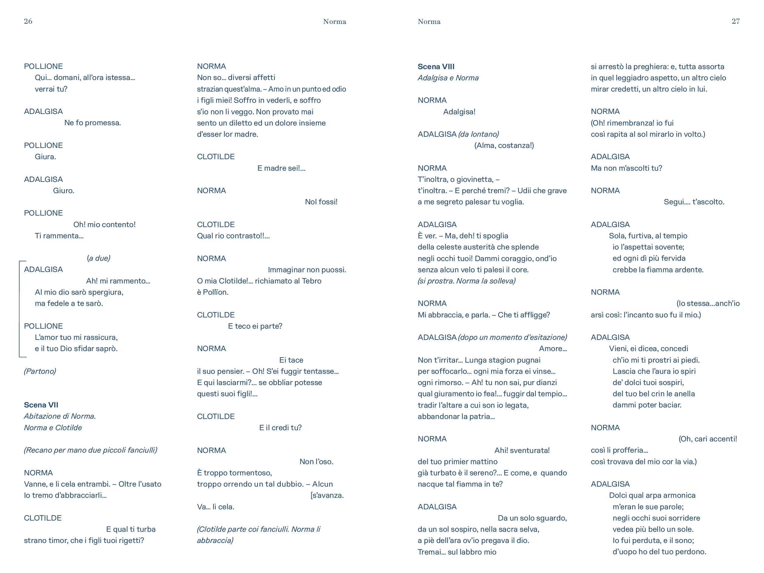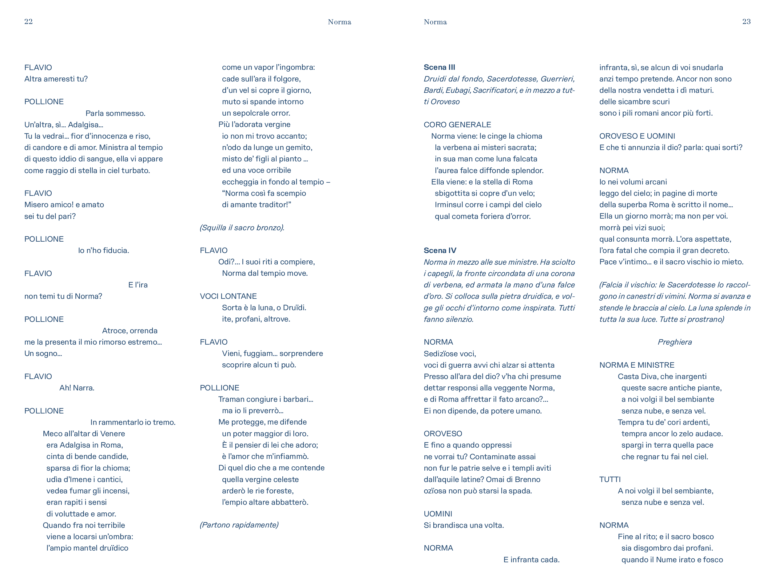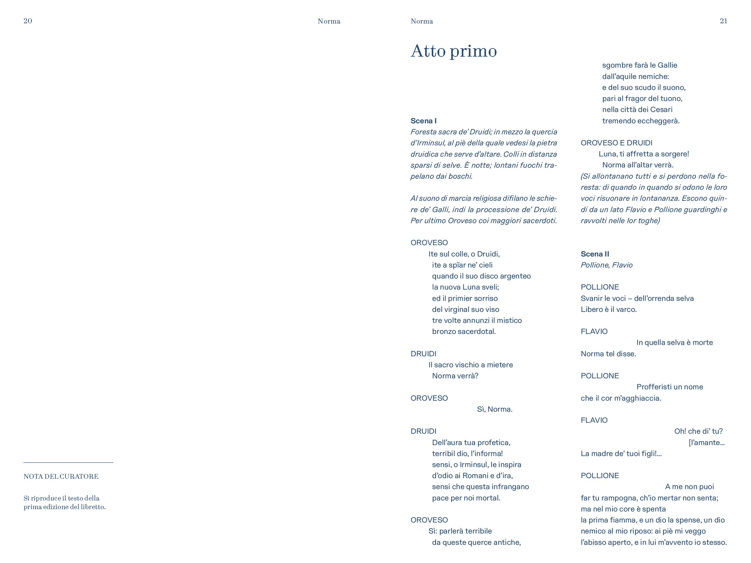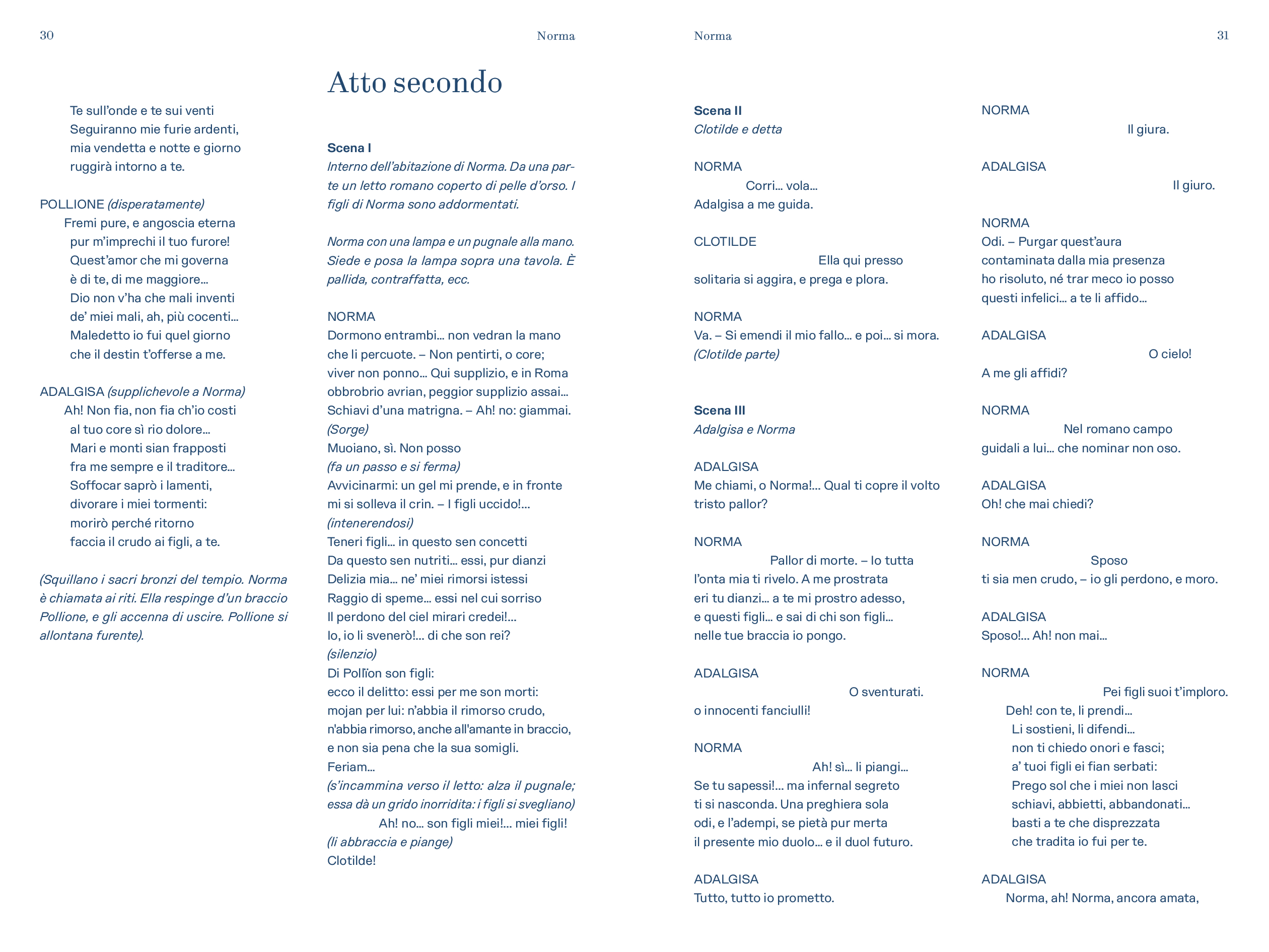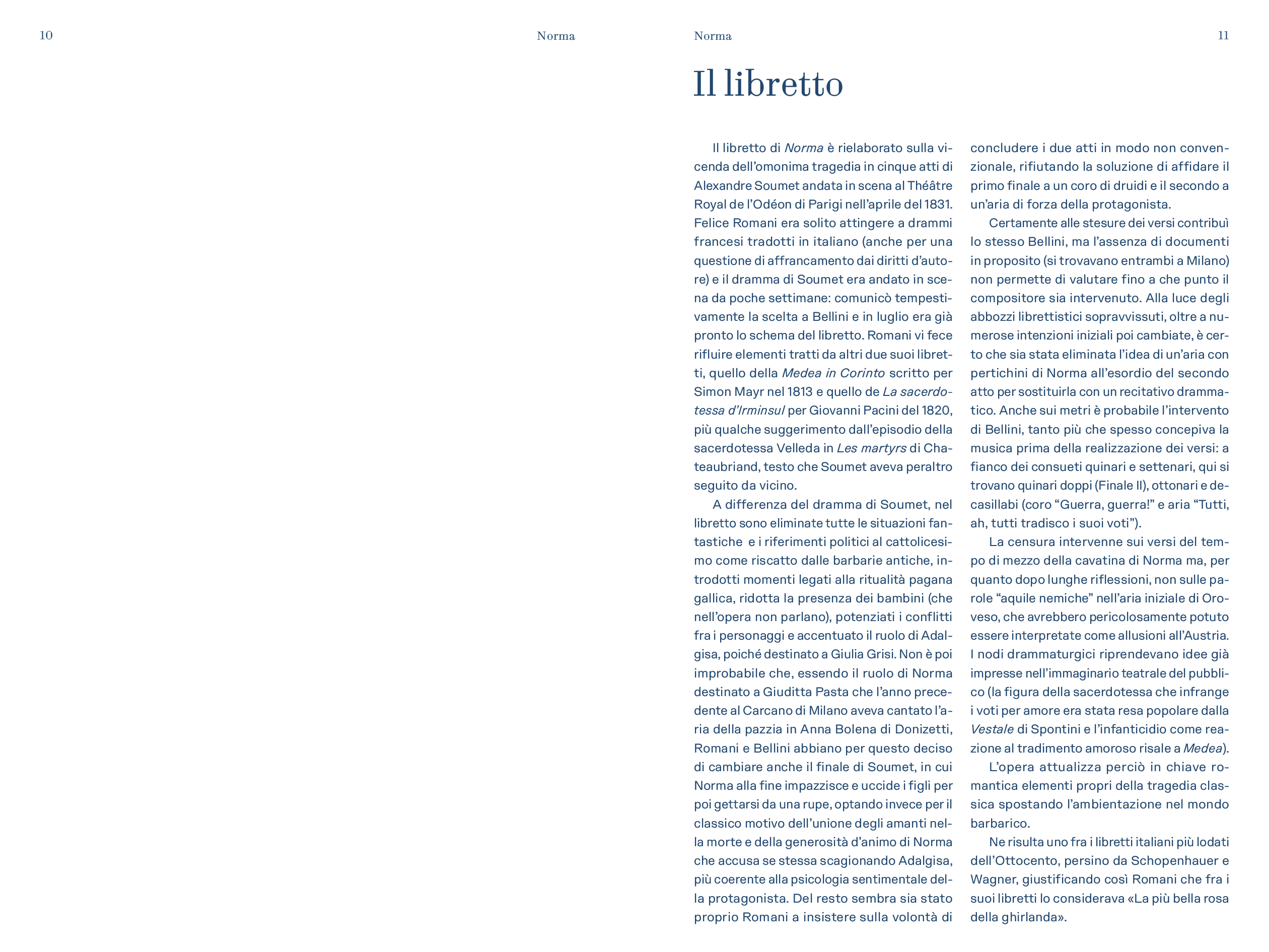 Per la sua quarta opera al Teatro alla Scala nel 1831, Vincenzo Bellini scelse insieme al suo librettista Felice Romani un soggetto tragico classicheggiante, che riprendeva il modello del sacrificio della protagonista, come nella Medea di Cherubini, in questo caso una sacerdotessa gallica abbandonata per una donna più giovane dal proconsole romano che l’aveva sedotta e resa madre. Alla prima reazione di Norma, quella di uccidere i figli avuti con l’uomo che l’ha tradita, subentra il pentimento, che la spinge a sacrificare se stessa sul rogo per espiare la propria colpa di empietà. L’ambientazione notturna nella foresta dei druidi rafforza il carattere autoritario e caricato di una passionalità primigenia intrisa di forte fragilità interiore della protagonista, ormai pienamente rispondente al sentire romantico di quegli anni. Partendo dalla base tradizionale belcantista, Bellini costruisce un impianto musicale sottilmente innovativo pur mantenendo la tradizionale forma a pezzi chiusi, sia sfruttando melodie che trasformano la riflessione in azione e che si dispiegano in forme ritmicamente irregolari, come nel celebre “Casta diva”; sia sostituendo i concertati di fine d’atto con catalizzanti scene, un terzetto nel finale primo e un’aria della protagonista nel secondo, che spostano il peso drammatico dalla vicenda ai personaggi, tracciando una strada che sarebbe stata proseguita dal grande teatro verdiano.