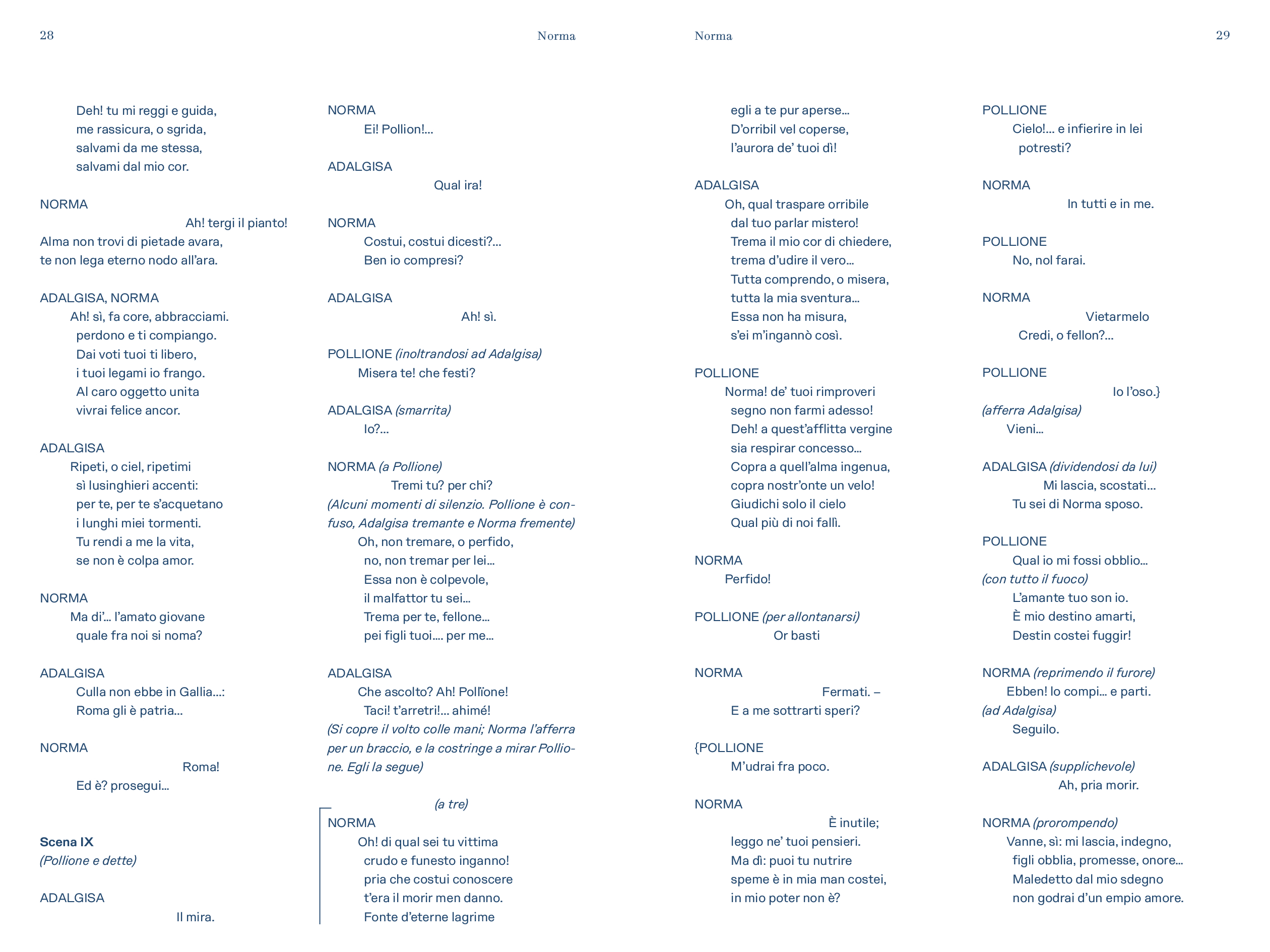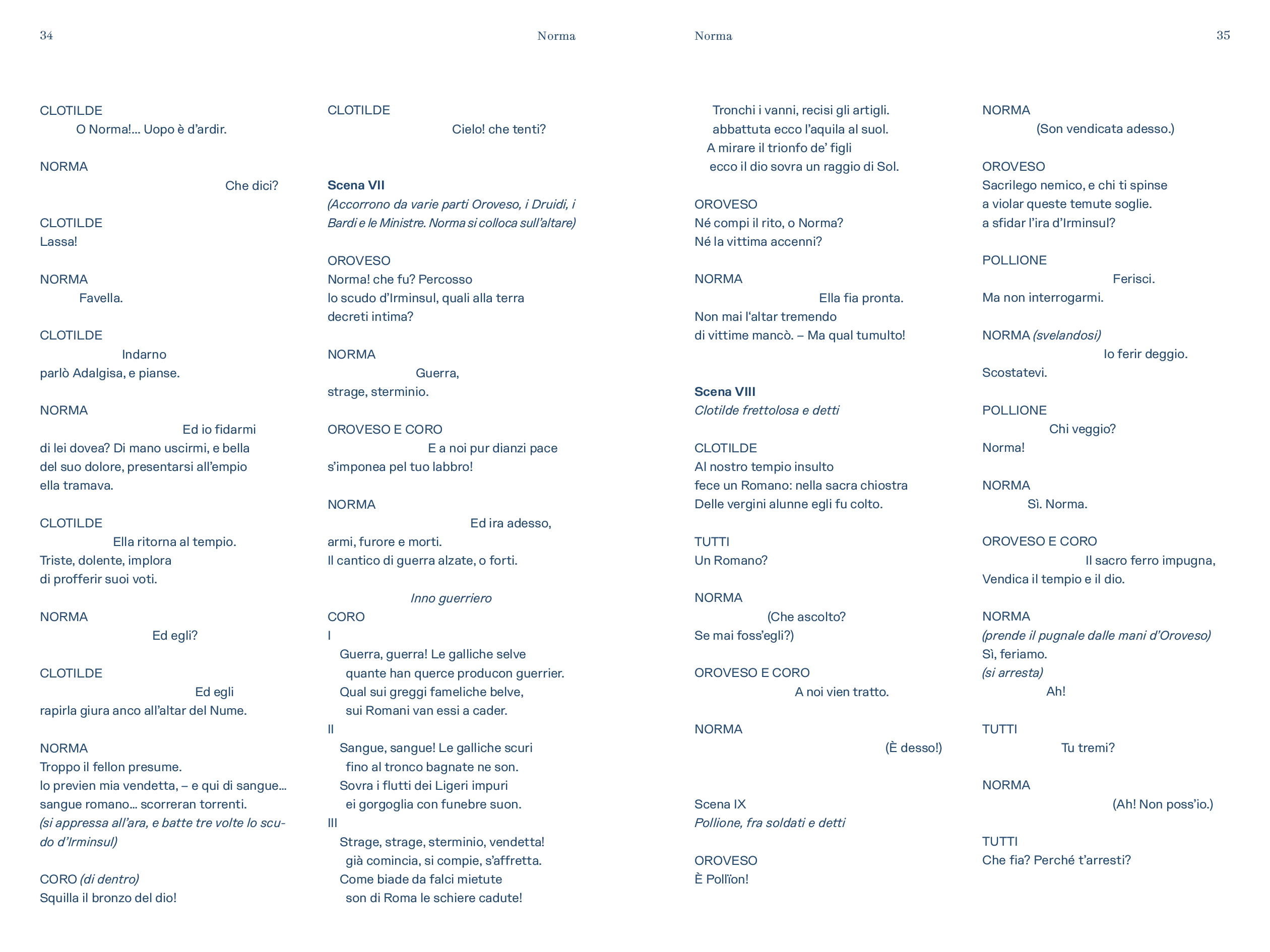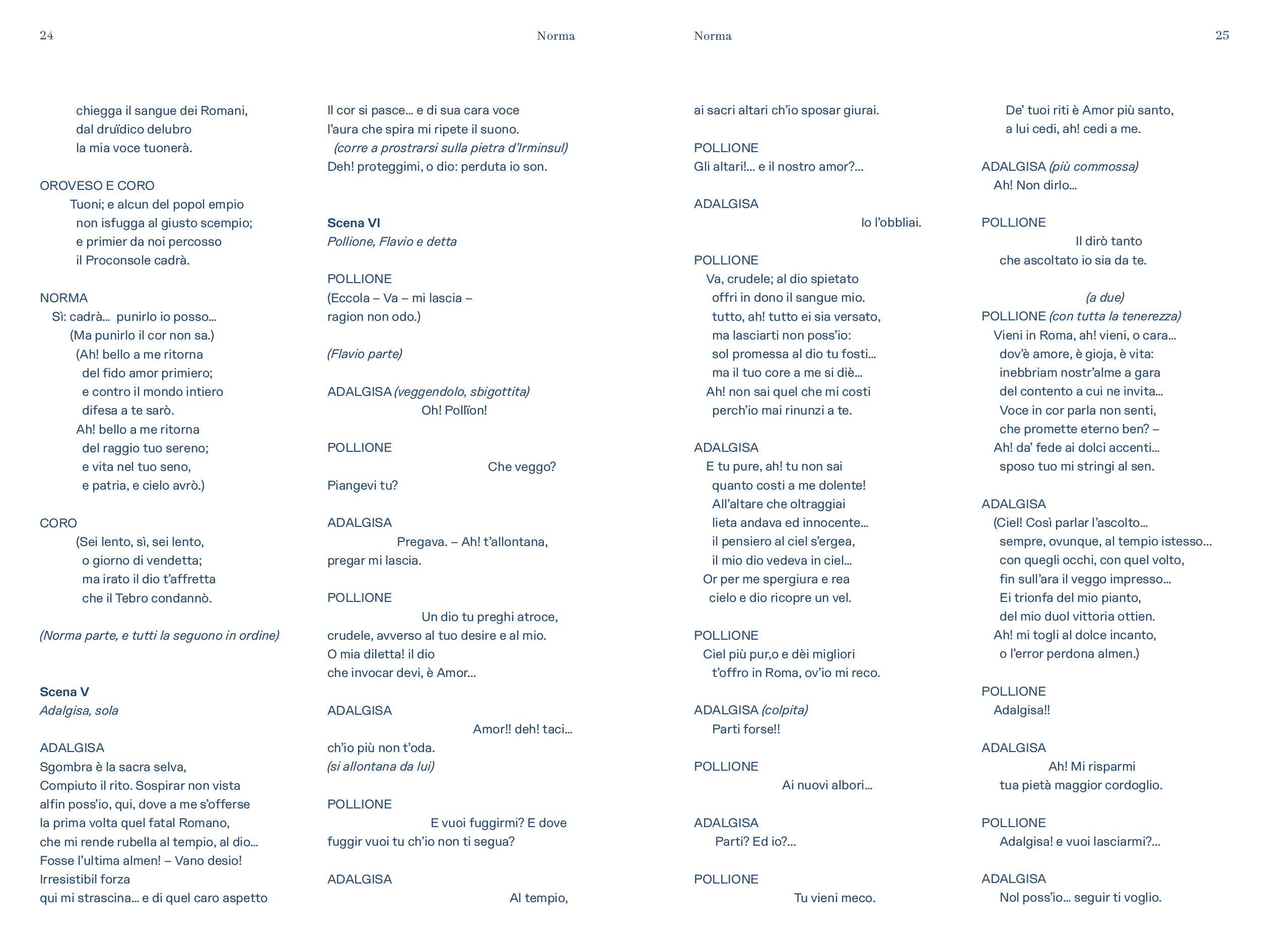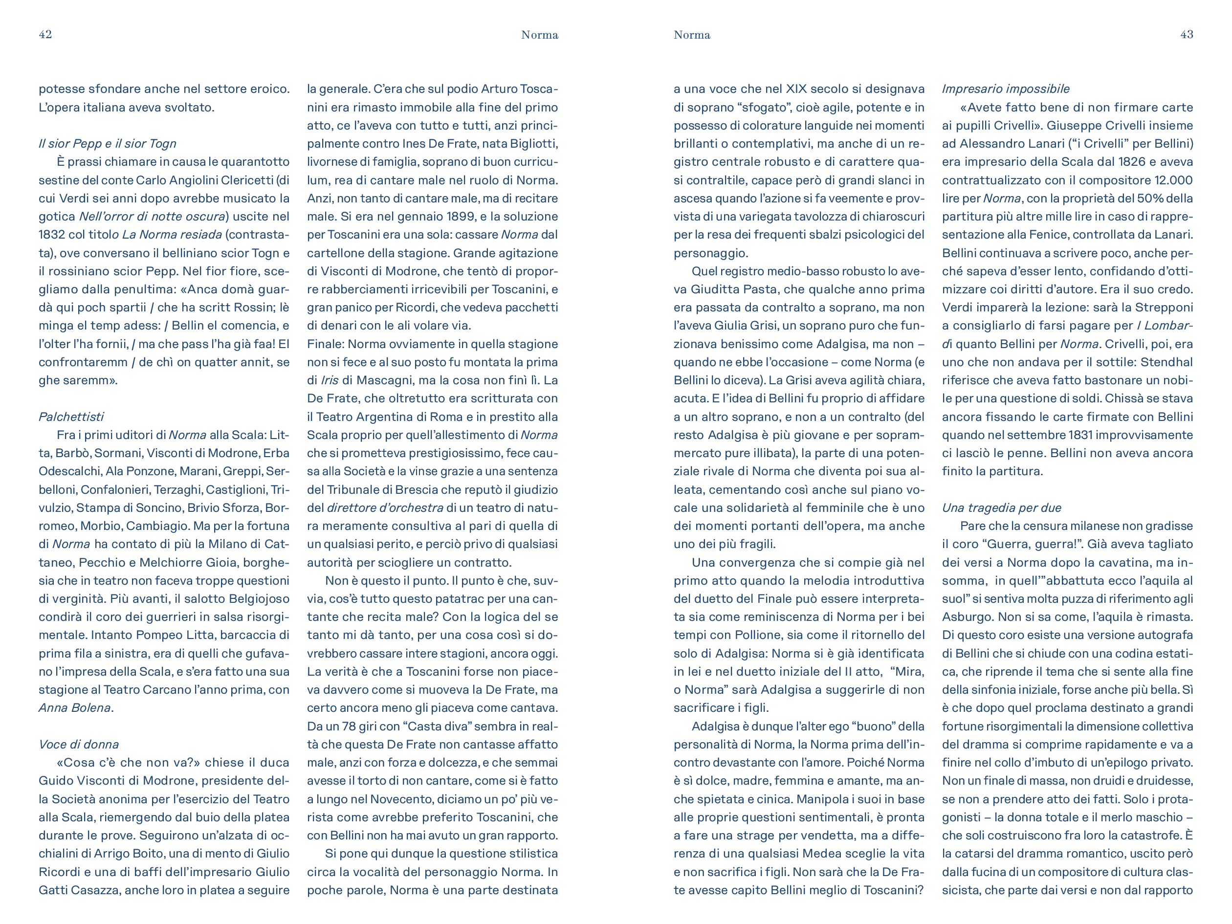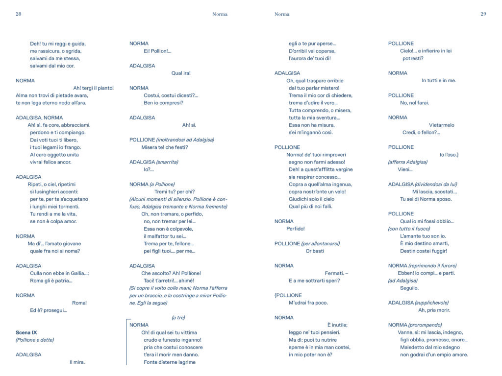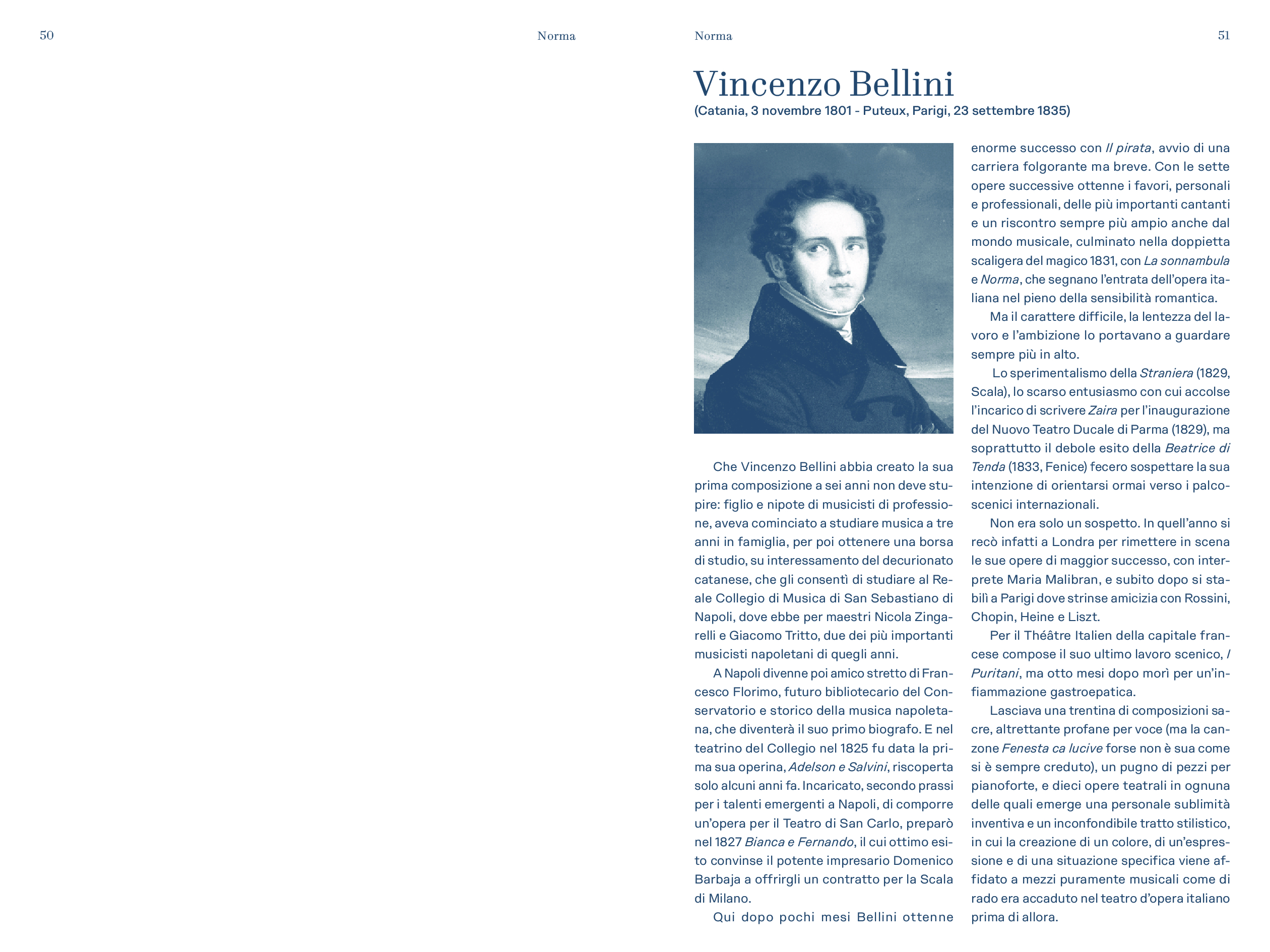 Per la sua quarta opera al Teatro alla Scala nel 1831, Vincenzo Bellini scelse insieme al suo librettista Felice Romani un soggetto tragico classicheggiante, che riprendeva il modello del sacrificio della protagonista, come nella Medea di Cherubini, in questo caso una sacerdotessa gallica abbandonata per una donna più giovane dal proconsole romano che l’aveva sedotta e resa madre. Alla prima reazione di Norma, quella di uccidere i figli avuti con l’uomo che l’ha tradita, subentra il pentimento, che la spinge a sacrificare se stessa sul rogo per espiare la propria colpa di empietà. L’ambientazione notturna nella foresta dei druidi rafforza il carattere autoritario e caricato di una passionalità primigenia intrisa di forte fragilità interiore della protagonista, ormai pienamente rispondente al sentire romantico di quegli anni. Partendo dalla base tradizionale belcantista, Bellini costruisce un impianto musicale sottilmente innovativo pur mantenendo la tradizionale forma a pezzi chiusi, sia sfruttando melodie che trasformano la riflessione in azione e che si dispiegano in forme ritmicamente irregolari, come nel celebre “Casta diva”; sia sostituendo i concertati di fine d’atto con catalizzanti scene, un terzetto nel finale primo e un’aria della protagonista nel secondo, che spostano il peso drammatico dalla vicenda ai personaggi, tracciando una strada che sarebbe stata proseguita dal grande teatro verdiano.