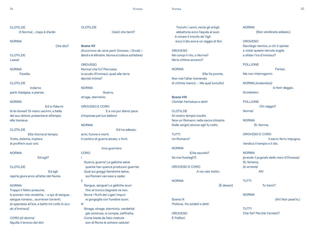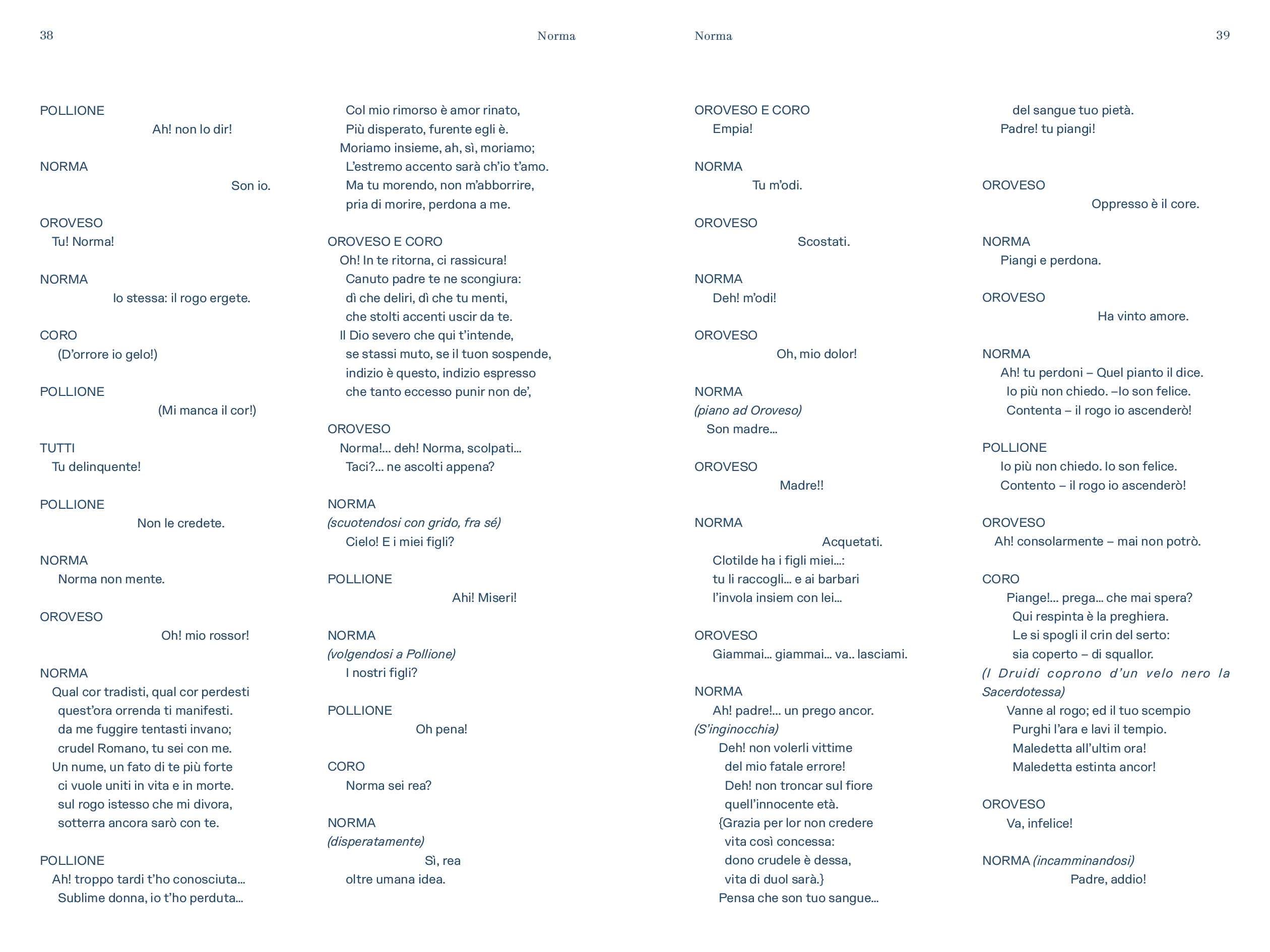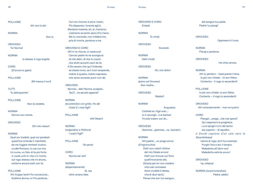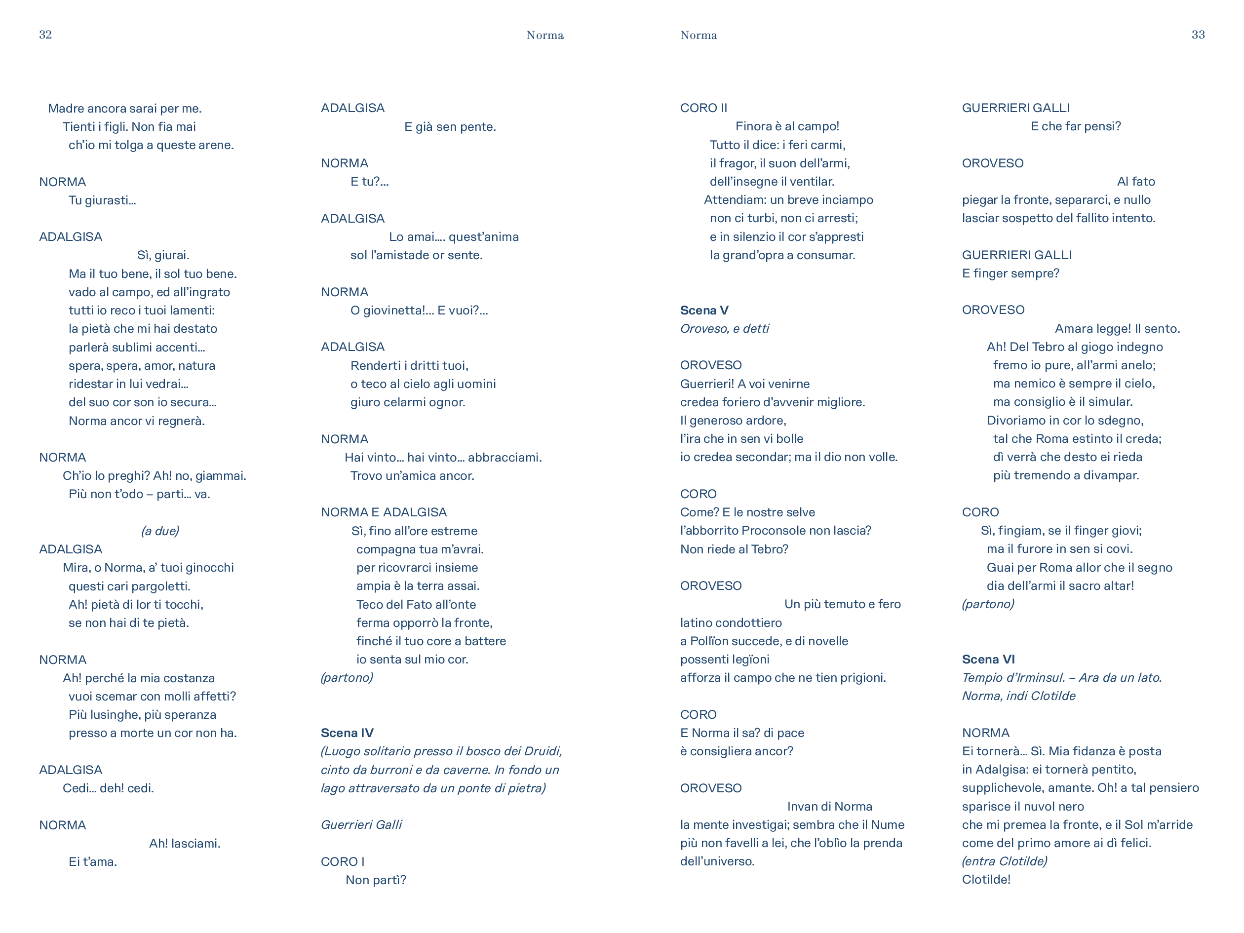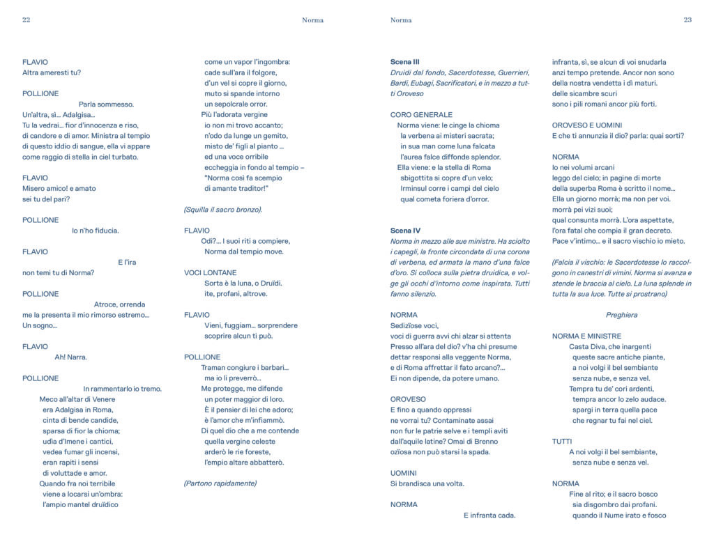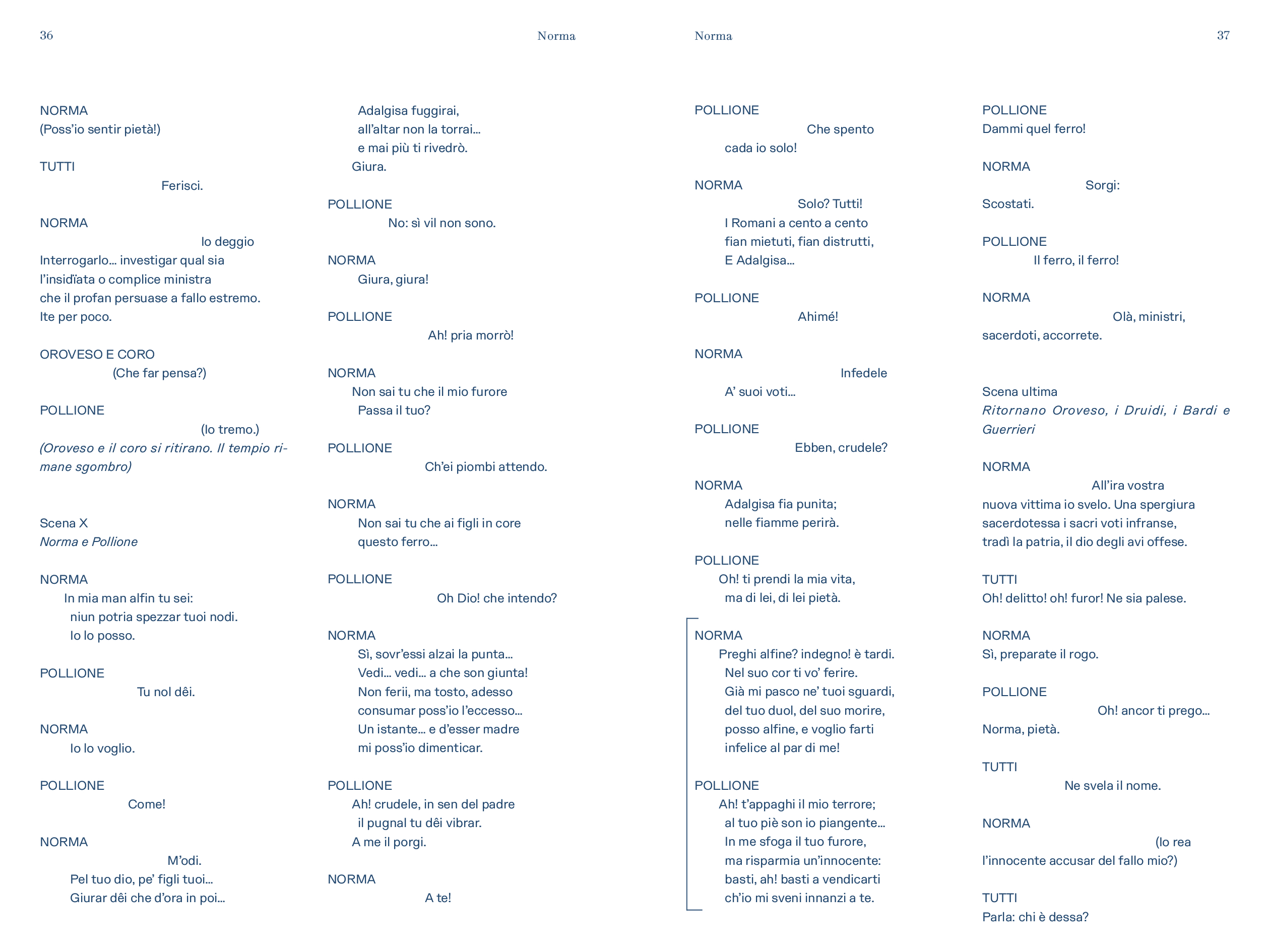 Per la sua quarta opera al Teatro alla Scala nel 1831, Vincenzo Bellini scelse insieme al suo librettista Felice Romani un soggetto tragico classicheggiante, che riprendeva il modello del sacrificio della protagonista, come nella Medea di Cherubini, in questo caso una sacerdotessa gallica abbandonata per una donna più giovane dal proconsole romano che l’aveva sedotta e resa madre. Alla prima reazione di Norma, quella di uccidere i figli avuti con l’uomo che l’ha tradita, subentra il pentimento, che la spinge a sacrificare se stessa sul rogo per espiare la propria colpa di empietà. L’ambientazione notturna nella foresta dei druidi rafforza il carattere autoritario e caricato di una passionalità primigenia intrisa di forte fragilità interiore della protagonista, ormai pienamente rispondente al sentire romantico di quegli anni. Partendo dalla base tradizionale belcantista, Bellini costruisce un impianto musicale sottilmente innovativo pur mantenendo la tradizionale forma a pezzi chiusi, sia sfruttando melodie che trasformano la riflessione in azione e che si dispiegano in forme ritmicamente irregolari, come nel celebre “Casta diva”; sia sostituendo i concertati di fine d’atto con catalizzanti scene, un terzetto nel finale primo e un’aria della protagonista nel secondo, che spostano il peso drammatico dalla vicenda ai personaggi, tracciando una strada che sarebbe stata proseguita dal grande teatro verdiano.