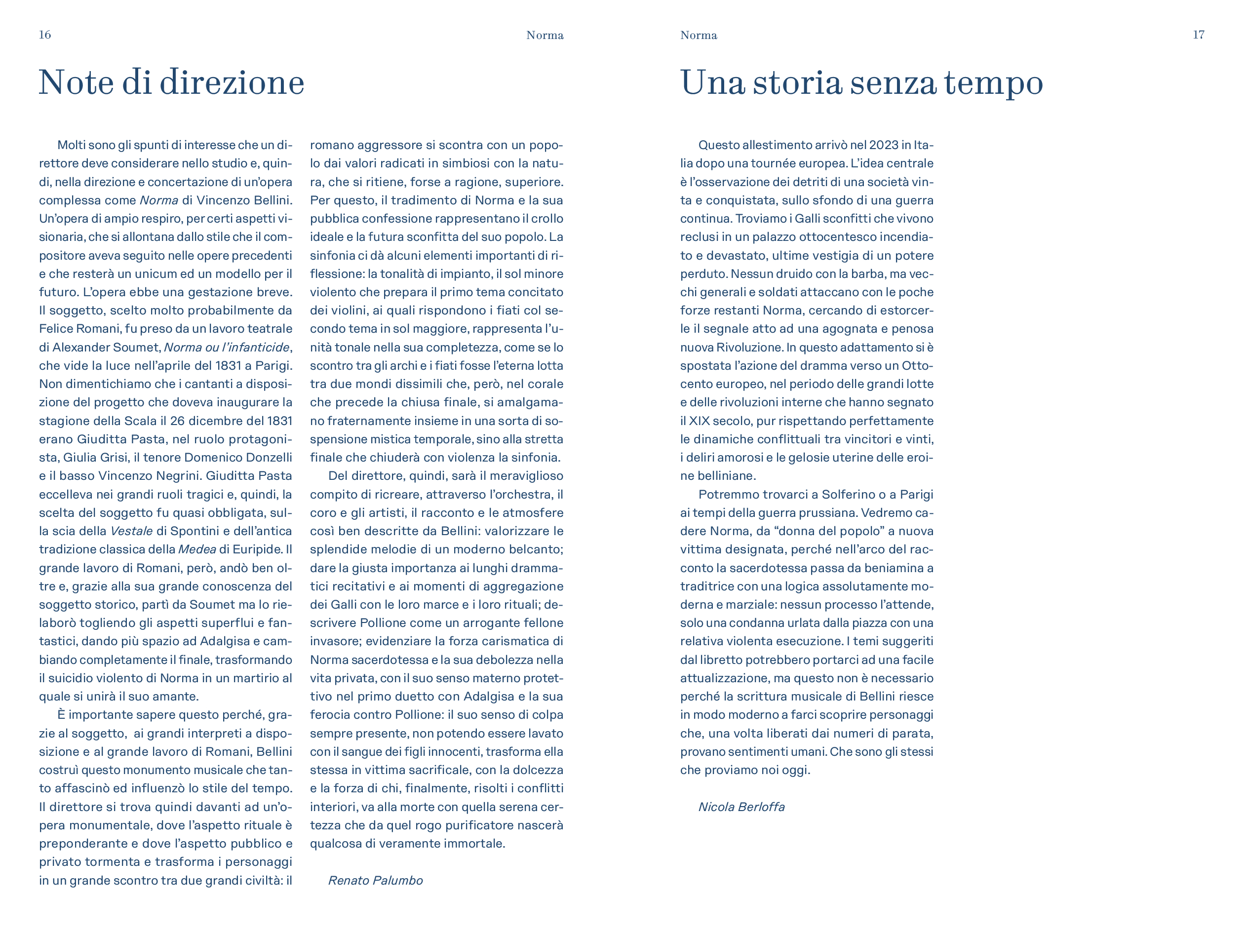 “Del direttore, sarà il meraviglioso compito di ricreare, attraverso l’orchestra, il coro e gli artisti, il racconto e le atmosfere così ben descritte da Bellini, dichiara Renato Palumbo: valorizzare le splendide melodie di un moderno belcanto; dare la giusta importanza ai lunghi drammatici recitativi e ai momenti di aggregazione dei Galli con le loro marce e i loro rituali; descrivere Pollione come un arrogante fellone invasore; evidenziare la forza carismatica di Norma sacerdotessa e la sua debolezza nella vita privata, con il suo senso materno protettivo nel primo duetto con Adalgisa e la sua ferocia contro Pollione: il suo senso di colpa sempre presente, non potendo essere lavato con il sangue dei figli innocenti, trasforma ella stessa in vittima sacrificale, con la dolcezza e la forza di chi, finalmente, risolti i conflitti interiori, va alla morte con quella serena certezza che da quel rogo purificatore nascerà qualcosa di veramente immortale”.