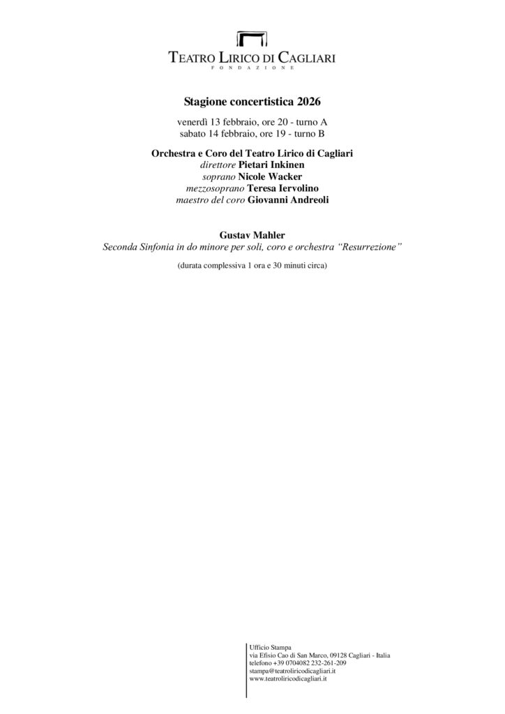 Venerdì 13 febbraio alle 20 (turno A) e sabato 14 febbraio alle 19 (turno B) è in programma il quarto appuntamento della Stagione concertistica 2026 del Teatro Lirico di Cagliari che prevede, a distanza di 7 anni dall’ultima esecuzione (gennaio 2019), l’ascolto della monumentale Seconda Sinfonia in do minore per soli, coro e orchestra “Resurrezione” di Gustav Mahler, capolavoro sinfonico-corale composto dal 1888 al 1894. Nel ruolo di soliste si esibiscono Nicole Wacker (soprano) e Teresa Iervolino (mezzosoprano), mentre sul podio ritorna, per la terza volta (dopo i concerti diretti nel novembre 2004 e febbraio 2021), Pietari Inkinen (Kouvola/Finlandia, 1980), direttore e violinista, senza dubbio uno dei più affermati, a livello mondiale, degli ultimi anni, al suo debutto assoluto nella Seconda di Mahler. Il maestro del coro è Giovanni Andreoli.