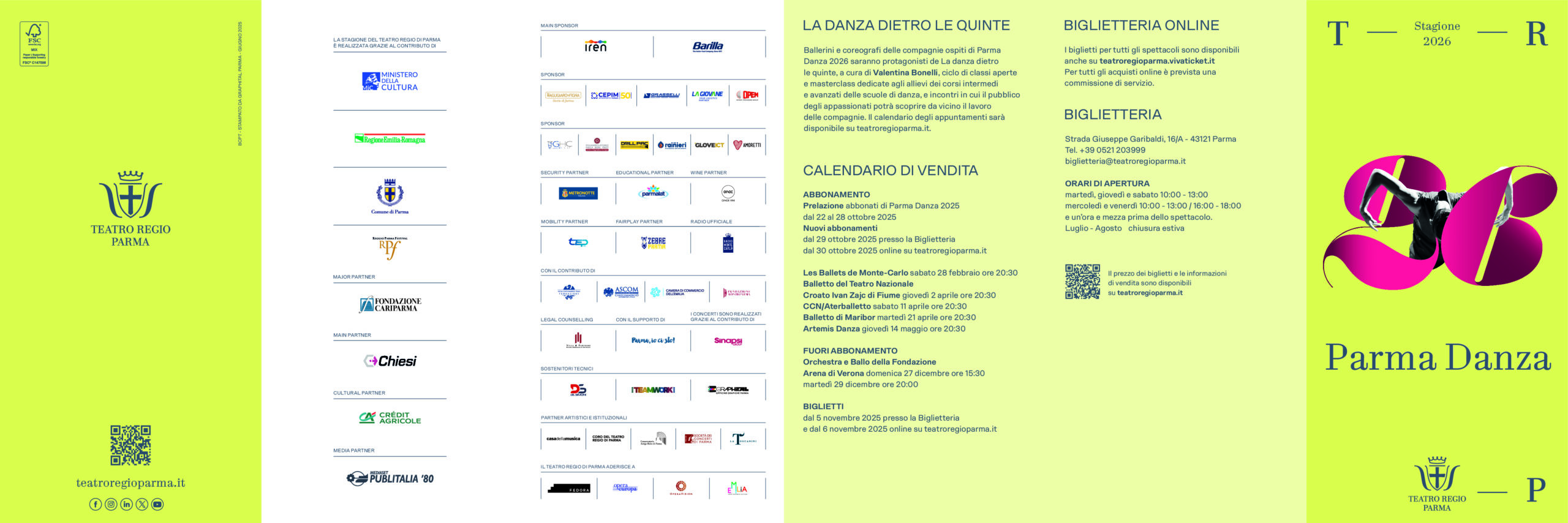La Stagione del Teatro Regio di Parma è realizzata grazie al contributo di Ministero della Cultura, Regione Emilia-Romagna, Comune di Parma, Reggio Parma Festival. Major partner Fondazione Cariparma. Main partner Chiesi. Cultural partner Crédit Agricole. Media partner Mediaset Publitalia ’80. Main sponsor Iren, Barilla. Sponsor Agugiaro e Figna, CePIM, Grasselli, La Giovane, Opem, GHC, Poliambulatorio Dalla Rosa Prati, Drill Pac, Rainieri, GloveICT, Amoretti. Security partner Metronotte. Educational partner Parmalat. Wine partner Oinoe. Mobility partner Tep. Fair Play partner Zebre.Radio Ufficiale Radio Monte Carlo. Con il contributo di Ascom Confcommercio Parma Fondazione, Ascom Parma Confcommercio, Camera di Commercio dell’Emilia, Fondazione Monteparma. Legal counselling Villa&Partners. Con il supporto di “Parma, io ci sto!”. I Concerti sono realizzati con il sostegno di Sinapsi Group Sostenitori tecnici De Simoni, Teamwork, Graphital. Partner artistici e istituzionali Casa della Musica, Coro del Teatro Regio di Parma, Conservatorio “Arrigo Boito”, Società dei Concerti di Parma, La Toscanini. Il Teatro Regio di Parma aderisce a Fedora, Opera Europa, Operavision, Emilia taste, nature, culture.