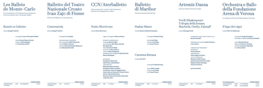 Les Ballets de Monte-Carlo, Balletto del Teatro Nazionale Croato Ivan Zajc di Fiume, CCN/Aterballetto, Balletto di Maribor, Artemis Danza, Orchestra e Ballo della Fondazione Arena di Verona sono i protagonisti di Parma Danza 2026, sei spettacoli da febbraio a dicembre e una prima nazionale, con compagnie di danza nazionali e internazionali che offrono un ampio e vario panorama del balletto e della danza contemporanea.