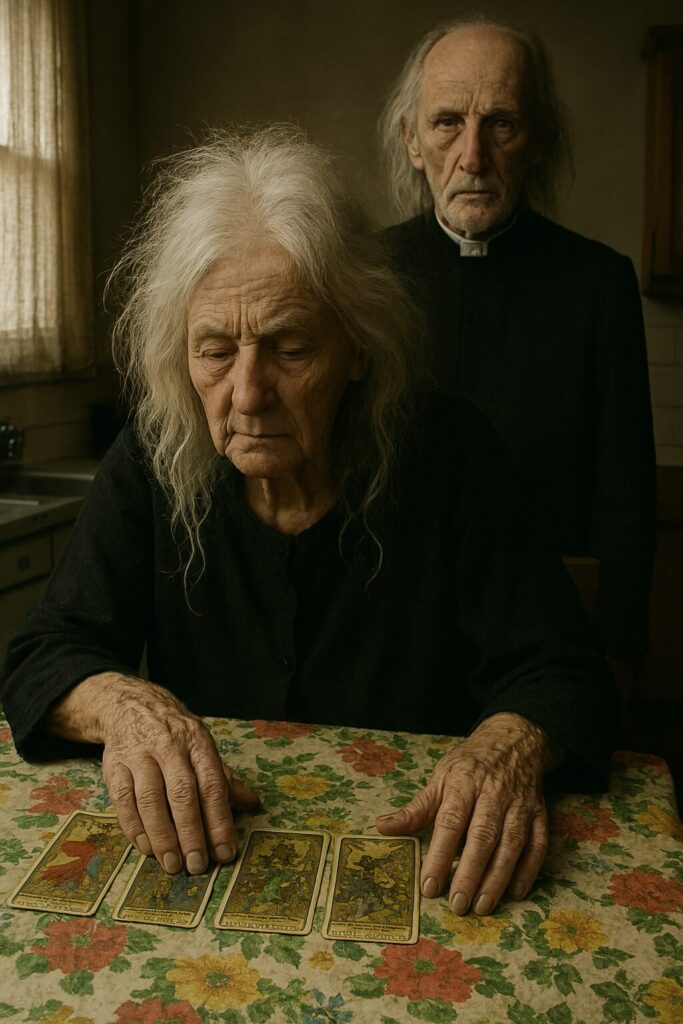 Doña Livia baraja en silencio. Las yemas de sus dedos tienen un leve tinte azulado, como alguna tinta antigua que se negara a irse.