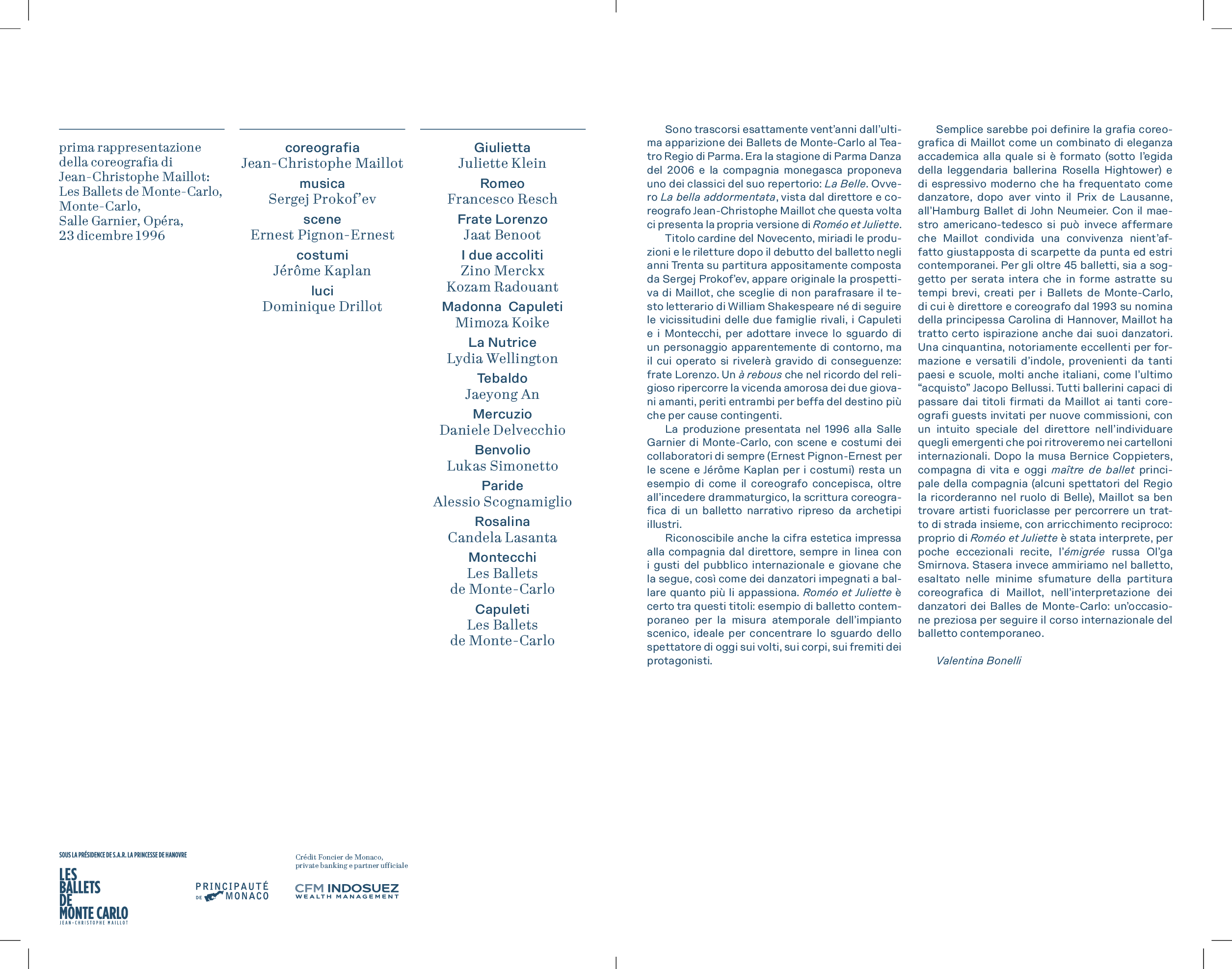 La compagnia monegasca interpreta il celebre balletto ispirato alla tragedia di William Shakespeare nella messinscena, presentata per la prima volta all’Opéra di Monte-Carlo nel 1996, che si avvale delle scenografie di Ernest Pignon-Ernest, dei costumi di Jérôme Kaplan e del disegno luci di Dominique Drillot. Jean-Christophe Maillot adotta una prospettiva coreografica che evita di parafrasare il monumento letterario di Shakespeare, raccontando la disputa fra Capuleti e Montecchi fino al suo tragico epilogo, e sceglie di rivivere la tragedia dal punto di vista dell’animo tormentato di Frate Lorenzo, il quale, desiderando fare del bene, alla fine provoca invece la morte dei due amanti.