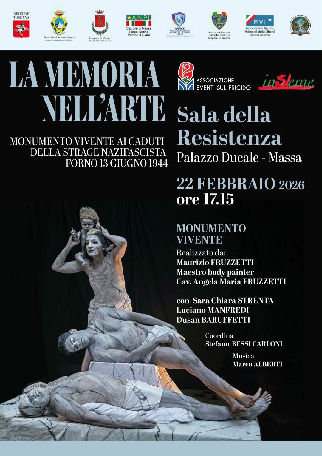 Monumento vivente ai caduti di Forno: dopo il successo ottenuto con la realizzazione del monumento in carne ed ossa, in memoria dell’eccidio nazifascista del 13 giugno 1944, le associazioni Insieme ed Eventi sul Frigido propongono un incontro a Palazzo Ducale, nella Sala della Resistenza, per spiegare l’evento, proiettare tutte le immagini della serata del 22 agosto e soprattutto per presentare il calendario 2026 realizzato con alcune delle foto più belle scattate da Walter Sgadò. Sarà un momento di riflessione e di commozione, proponendo al pubblico immagini che riportano alla strage di Forno e a quel monumento ai caduti realizzato dallo scultore Riccardo Rossi e inaugurato nel luogo dell’eccidio nel 1948, dentro una nicchia rocciosa che si trova lungo quella strada che vide cadere, uno dopo l’altro, 58 giovani fucilati. Il progetto s’intitola “La Memoria nell’arte”, avviato dieci anni fa dall’associazione culturale Eventi sul Frigido su idea della presidente Angela Maria Fruzzetti in collaborazione di Anpi Massa, patrocinio Comune di Massa, Provincia di Massa-Carrara e Regione Toscana. Un progetto reso possibile dall’impegno del body painter Maurizio Fruzzetti. Si iniziò trasformando una sola modella in statua marmorea, accompagnando le presentazioni dei libri con testimonianze sull’eccidio scritti da Angela. Di seguito è maturata l’idea di realizzare il monumento con le quattro figure: dal corpo di due ragazzi uccisi, si eleva una donna che innalza un neonato strappato alla morte: un meraviglioso inno alla vita. Luciano Manfredi, Dusan Baruffetti e Sara Chiara Strenta sono i modelli che interpretano il suggestivo monumento di Rossi, resi statue dall’artista Maurizio Fruzzetti. “Abbiamo realizzato un sogno – commentano i due Fruzzetti, entrambi di Forno -. La storia del nostro paese listato perennemente a lutto per la tragedia di quel 13 giugno, ce la portiamo addosso con le lacrime dei familiari sopravvissuti a quell’orribile strage. Ricostruire con modelli umani l’opera marmorea dello scultore Riccardo Rossi è un modo per rendere viva la memoria, con l’obiettivo di sensibilizzare le giovani generazioni”. Una serata forte di fronte a quei corpi marmorei che si muovevano e riprendevano vita per portare nel pubblico un messaggio di pace. Una serata che verrà riproposta domenica 22 febbraio attraverso le immagini e le parole degli organizzatori, protagonisti dell’evento. Saranno presenti gli attori e modelli, oltre che Walter Sgadò, fotografo, Egizia Malatesta, Massimo Norti, Matteo Nerbi, Jennifer Bonini con i giovanissimi Leonardo Nerbi, Martina Bertuccelli e Lorenzo Berti, voci narranti, Marco Alberti e Letizia Bonsignore per le musiche. L’incontro sarò coordinato da Stefano Bessi Carloni. Dunque, la memoria si rinnova ricordando quel 13 giugno 1944, quando donne e bambini aspettavano le campane per festeggiare il patrono, Sant’Antonio, ma udirono colpi di mitraglia. Terrore, rastrellamenti, fucili puntati, fuoco, tanta sete, fame: tutta la popolazione di Forno era sotto il tiro dei nazifascisti. A sera, grazie al maresciallo Ciro Siciliano, che immolò la sua vita per salvare donne e bambini, la popolazione venne liberata, mentre in località Sant’Anna 58 giovani, tra cui il maresciallo stresso, furono falciati dalle mitragliatrici naziste e della Decima Mas. Le vittime di quella strage in tutto furono 68. Un ringraziamento al Comune di Massa, all’associazione Occhioni&Magrini per il supporto, all’associazione Insieme e al circolo Arci XIII Giugno, inoltre a Fivl, Anpi, Anvcg, Anfcdg per il patrocinio.