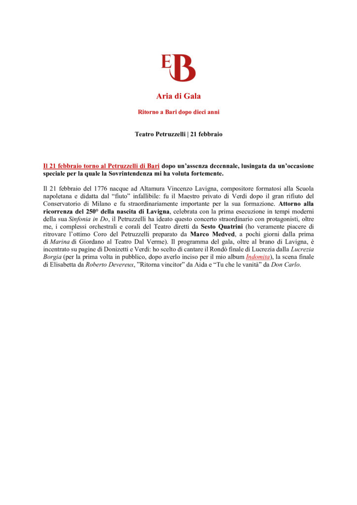| On 21st February I’m returning to the Teatro Petruzzelli, Bari, after a ten-year absence, honoured to have been chosen resolutely by theatre management for this special occasion. On 21st February 1776, in Altamura, Vincenzo Lavigna, a composer who received his education from the Neapolitan School and a teacher with infallible intuition, was born. He was Verdi’s private tutor after the great rejection by the Conservatory of Milan and was extraordinarily important for his education. For the 250th anniversary of Lavigna’s birth, being celebrated with the first modern-day performance of his Symphony in C, the Teatro Petruzzelli has created this special concert featuring, along with me, the orchestra and chorus of the theatre conducted by Sesto Quatrini (it’s a true pleasure to be working again with the excellent Teatro Petruzzelli Chorus prepared by Marco Medved, just a few days after the premiere of Marina by Giordano at the Teatro Dal Verme). The programme for this gala concert, besides the work by Lavigna, focuses on pieces by Donizetti and Verdi: I have chosen to sing Lucrezia’s Rondò finale from Lucrezia Borgia (performed in public for the first time, after recording it for my album Indomita) Elisabetta’s final scene from Roberto Devereux, “Ritorna vincitor” from Aida, and “Tu che le vanità” from Don Carlo. |