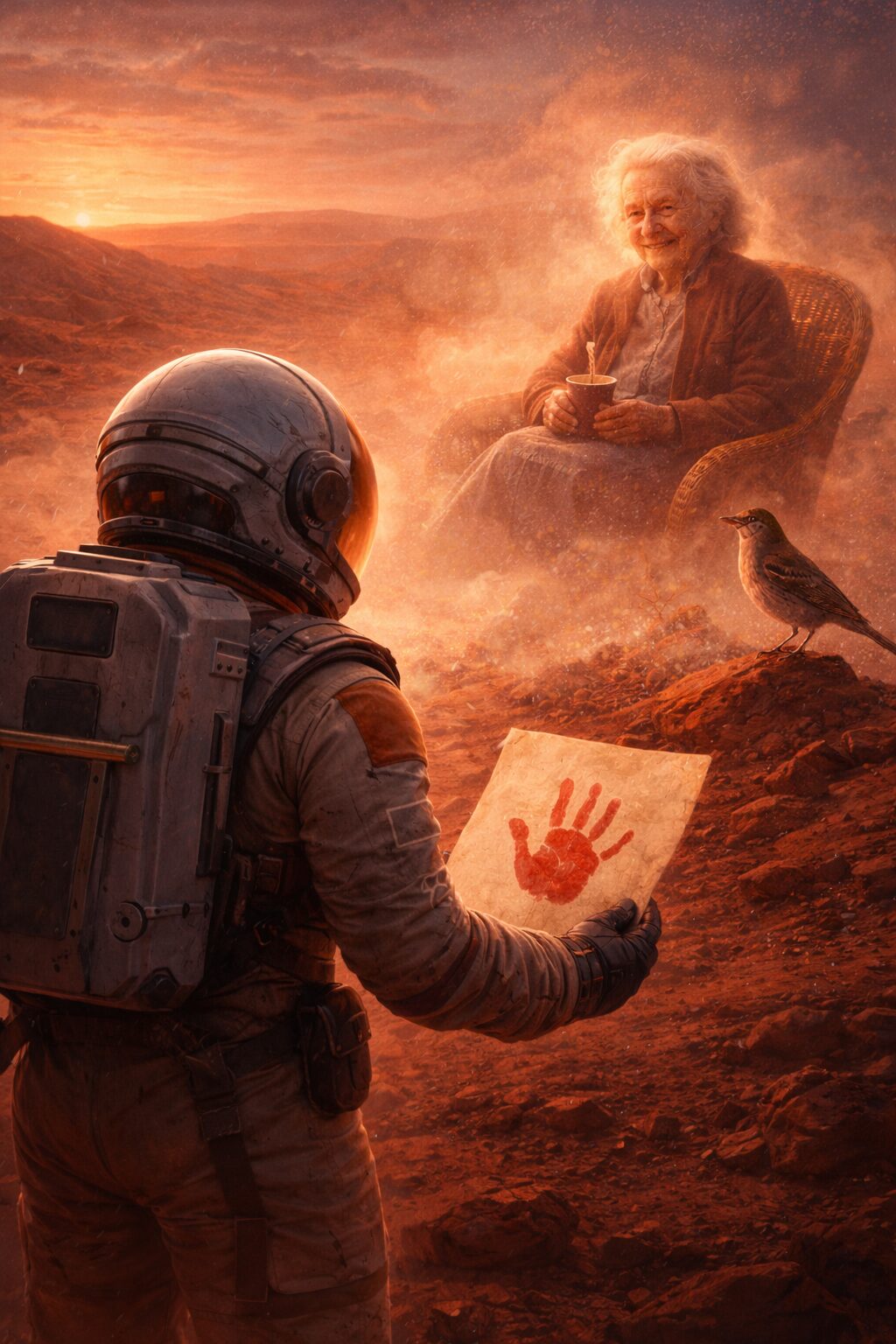 Antes de enviar el mensaje, mira una vez más el paisaje rojizo. El polvo suspendido, la luz oblicua, la sensación de un atardecer que se parece demasiado a los de la Tierra. No hay pájaros. No hay sonido. Sin embargo, en algún lugar de su memoria, un canto insiste.