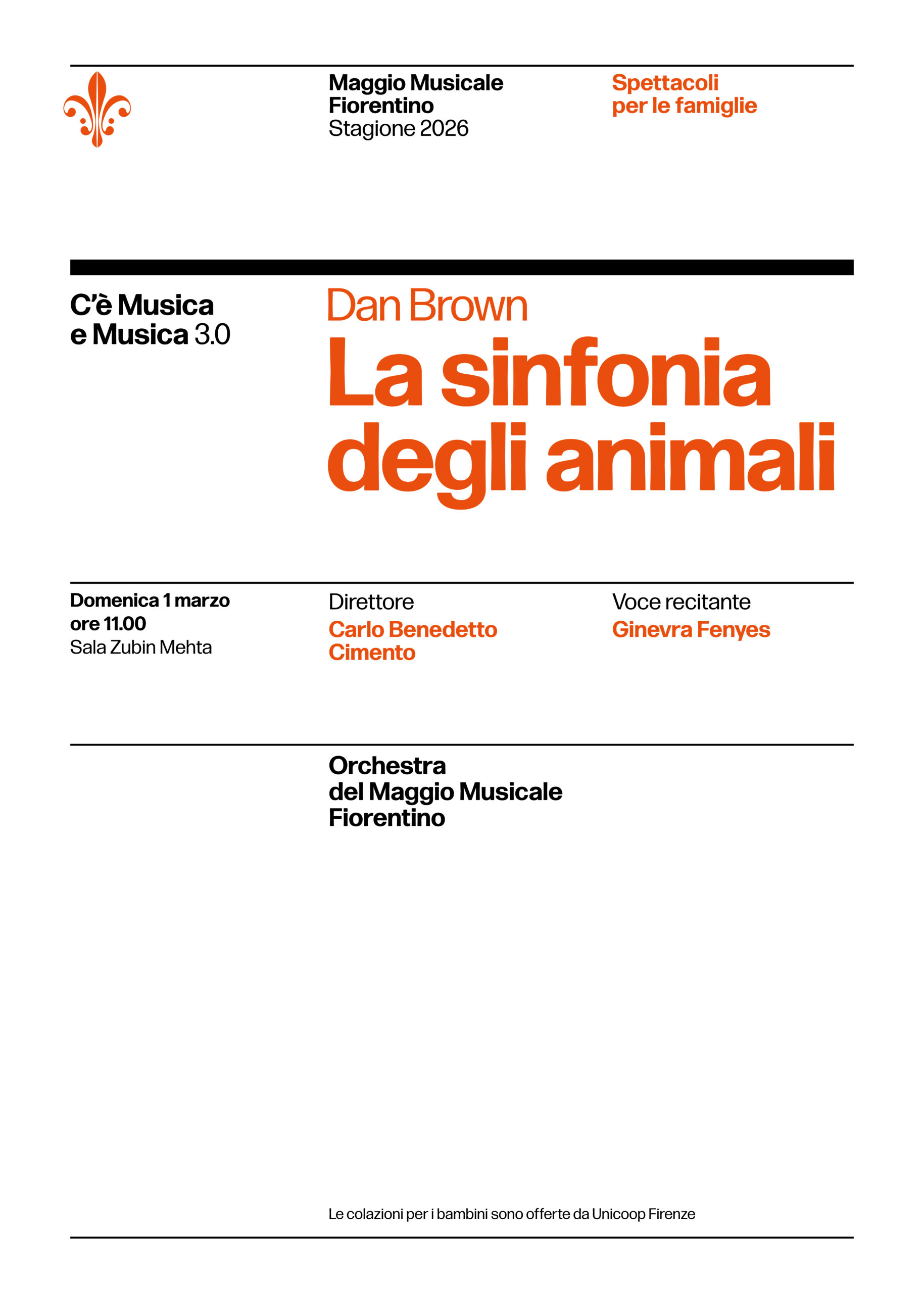 Sul podio della Sala Mehta il maestro Carlo Benedetto Cimento dirige l’Orchestra del Maggio Musicale Fiorentino, mentre la parte narrativa è affidata a Ginevra Fenyes che accompagna il pubblico attraverso un colorata mattinata musicale.