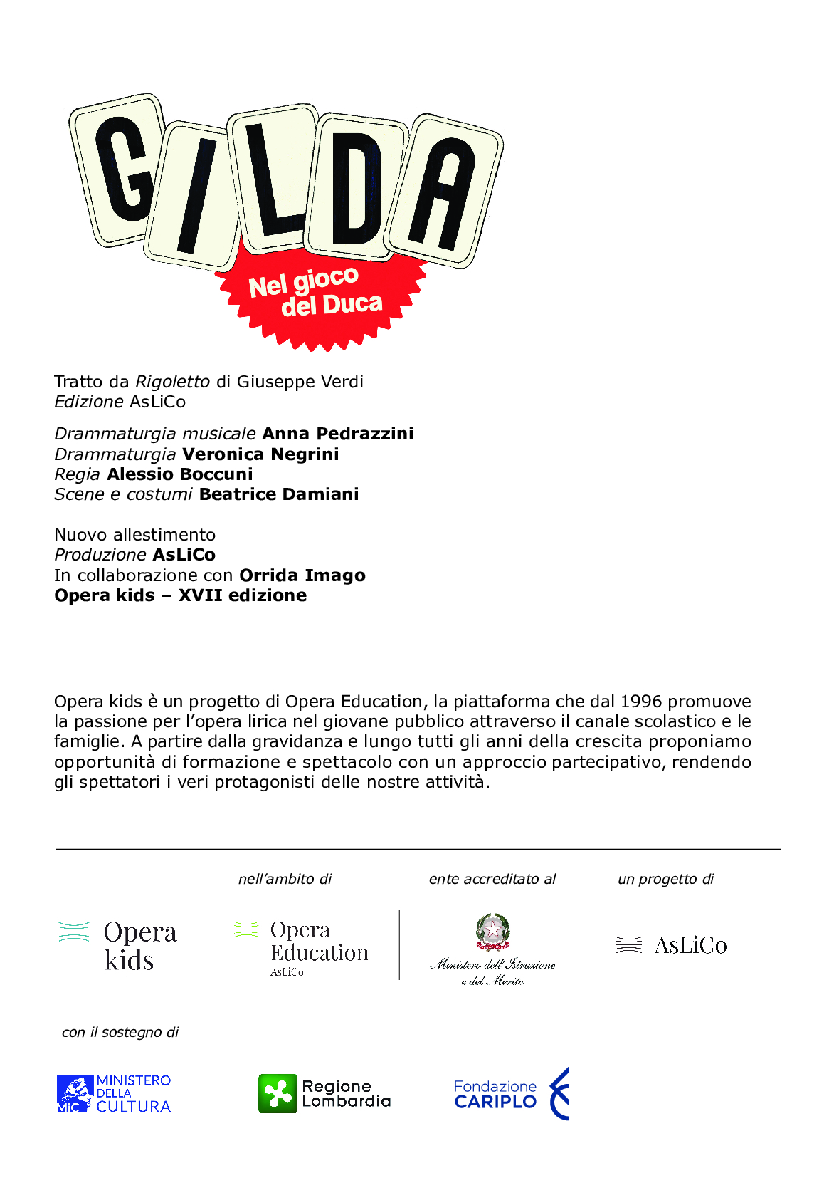 Gilda Nel gioco del Duca è il nuovo allestimento realizzato in collaborazione con Orrida Imago e rivolto ai bambini da 3 a 6 anni che debutta venerdì 6 marzo 2026 alle ore 9.00 e 11.00 per le scuole e sabato 7 marzo 2026 alle ore 15.00 e 18.00 per le famiglie. Il mondo di Mantova diventa un colorato gioco da tavolo dove i personaggi si muovono come pedine e il pubblico è invitato a partecipare attivamente: si canta, si gioca, si scopre. Gilda è la protagonista di questa avventura: non più solo una figura romantica, ma una ragazza che impara a fare le proprie scelte e a seguire la sua strada. Con leggerezza e fantasia, i bambini sono accompagnati in un viaggio dove anche il gioco diventa occasione per capire qualcosa in più su se stessi, sugli altri e sul mondo. Drammaturgia musicale Anna Pedrazzini, regia Alessio Boccuni, scene e costumi Beatrice Damiani, drammaturgia Veronica Negrini, voce registrata Gabriele Martini. Gilda Camilla Lacaud / Giorgia Zatti. Il Duca di Mantova Andrea Calce / Paolo Mascari. Pianoforte Claudio Capretti / Eric Foster.