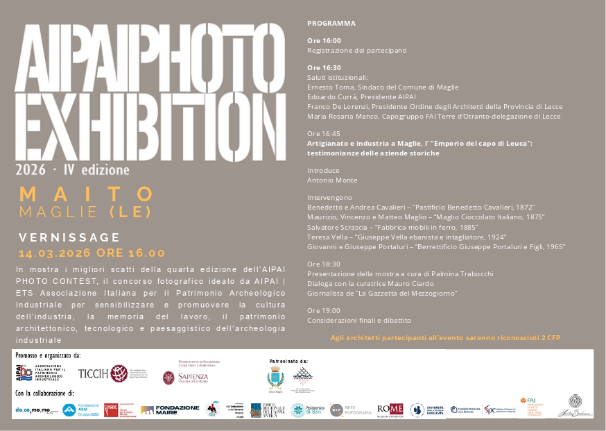 Dal 14 marzo al 24 maggio 2026 il Museo Archeo Industriale della Terra d’Otranto di Maglie ospita la seconda tappa di AIPAI Photo Exhibition 2026, la mostra itinerante che rappresenta attraverso la fotografia i paesaggi e le architetture del patrimonio industriale, promossa da AIPAI – Associazione Italiana per il Patrimonio Archeologico Industriale ETS-TICCIH Italia.