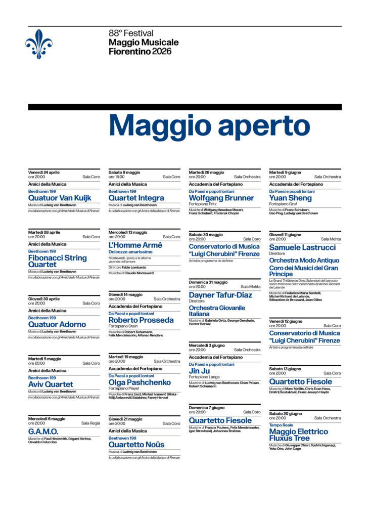 “Il Maggio Musicale Fiorentino nasce come Festival della città e “Maggio aperto” riporta questa idea alla sua forma più viva: la musica che incontra la città e le sue istituzioni. E anche il manifesto di questo Festival, del grande artista Georg Baselitz, non è solo un’immagine, ma un vero e proprio manifesto culturale e artistico, una dichiarazione di libertà e di ribaltamento dei canoni – dichiara il sovrintendente Carlo Fuortes – Così come Einstein ha rivoluzionato i paradigmi della fisica e Baselitz quelli della visione, il nostro Festival vuole essere uno spazio dove la tradizione dialoga costantemente con il futuro. Questa tensione verso la scoperta anima anche la rassegna ‘Maggio aperto’: un progetto che trasforma il Teatro nel cuore di un ecosistema musicale straordinario di collaborazioni che rappresenta un valore peculiare della nostra Città, una filiera culturale unica, una sinergia con pochissimi altri paragoni in Italia. Aprire le nostre sale, la Grande, la Mehta, la sala Orchestra, la sala Coro e la sala Regia, alle più prestigiose realtà del territorio è un atto di restituzione e di condivisione che rende il Maggio una necessaria casa comune e il centro del dialogo tra il Teatro e il territorio. E così, per essere parte integrante della programmazione che arricchisce e completa l’88° Festival ringrazio per la partecipazione e la presenza – e li cito in ordine cronologico – gli Amici della Musica di Firenze , G.A.M.O., L’Homme Armé, L’Accademia del Fortepiano, Il Conservatorio Cherubini, La Scuola di Musica di Fiesole, L’Istituto Lulli, Tempo Reale istituzioni con le quali offriremo un percorso musicale che spazia dalla polifonia rinascimentale, celebra il genio di Beethoven e giunge alle avanguardie elettroniche. E ci sarà un’altra importante novità in calendario, verrà proposto “Una Traviata da cortile”, spettacolo di e con Alessandro Baricco, in collaborazione con Università di Firenze e con il sostegno di Unicoop Firenze.»